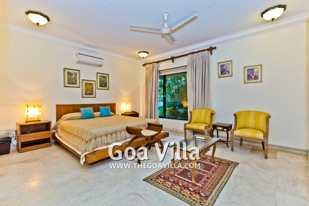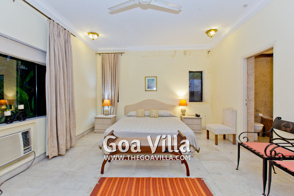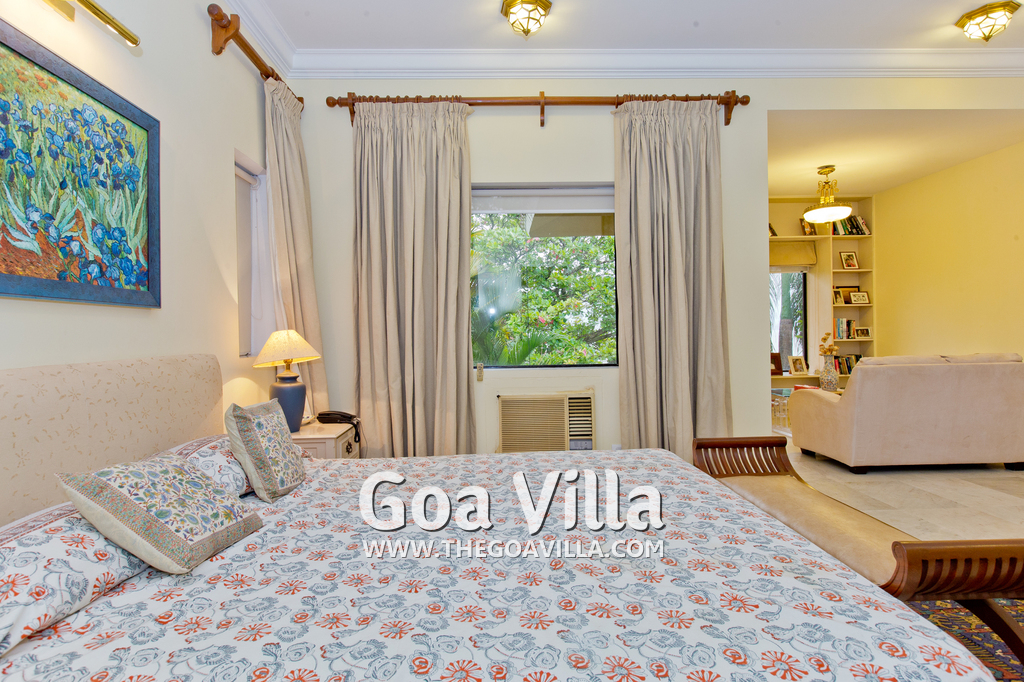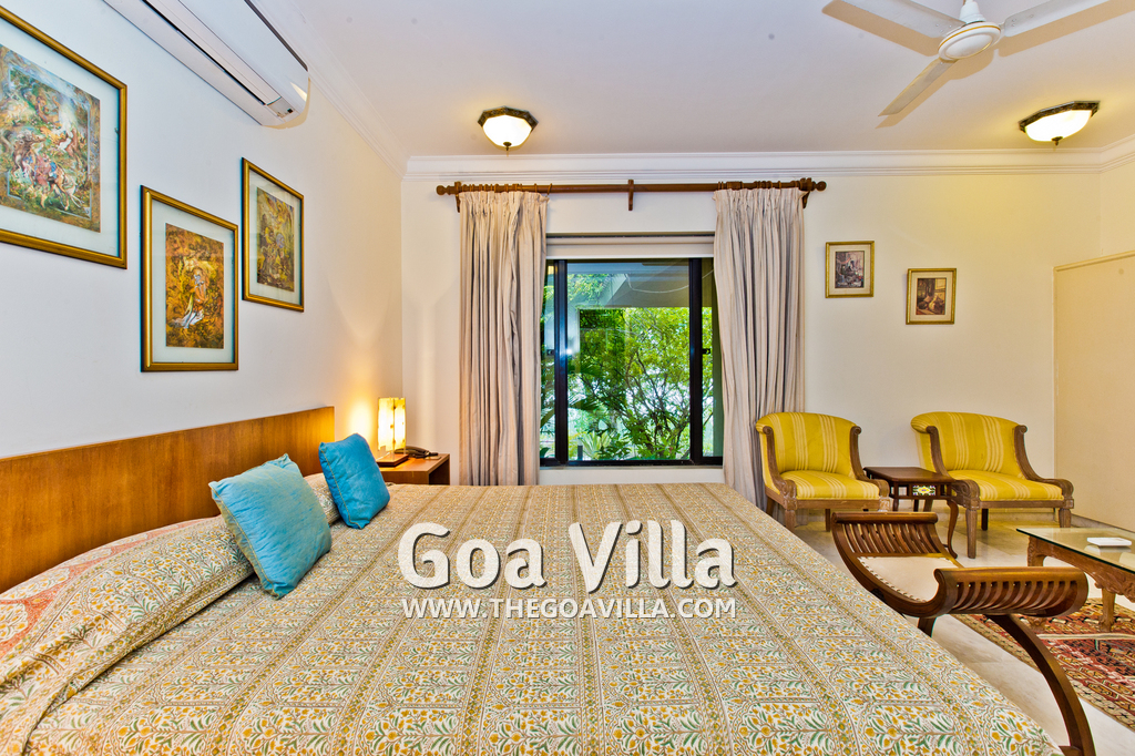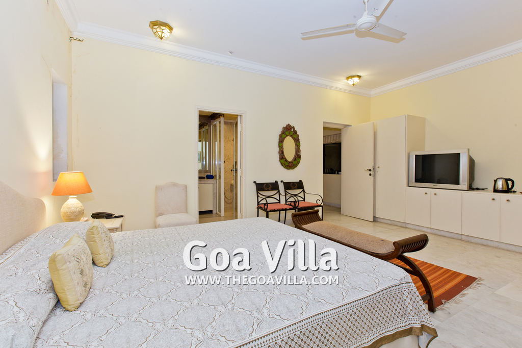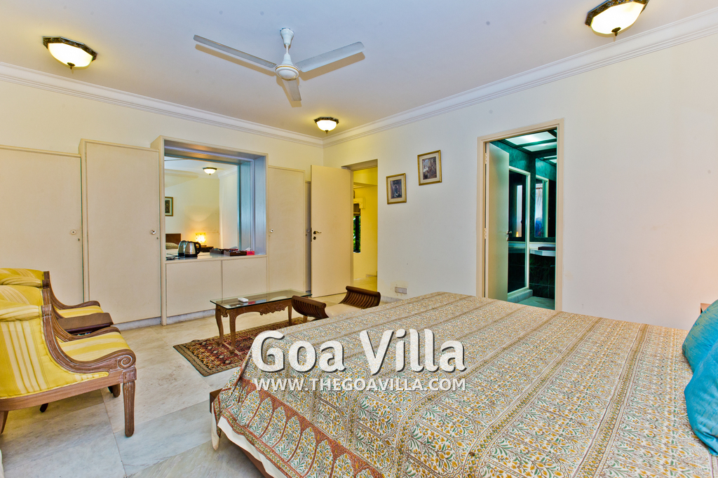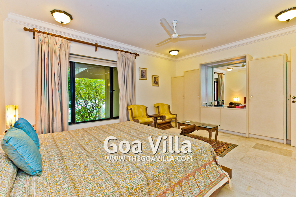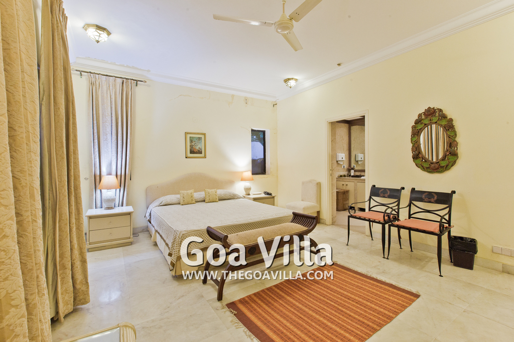 Bedrooms – The villa has 6 bedrooms, all en-suite and air conditioned. They are large and airy with a king bed, side table, beautiful lamp shades, wardrobe, sitting area, carpet, and paintings. The master suite has a small library. Each bedroom has a satellite television, mini bar, tea and coffee making facilities. Large glass windows provide nature views and views of the Zuari river’s estuary.