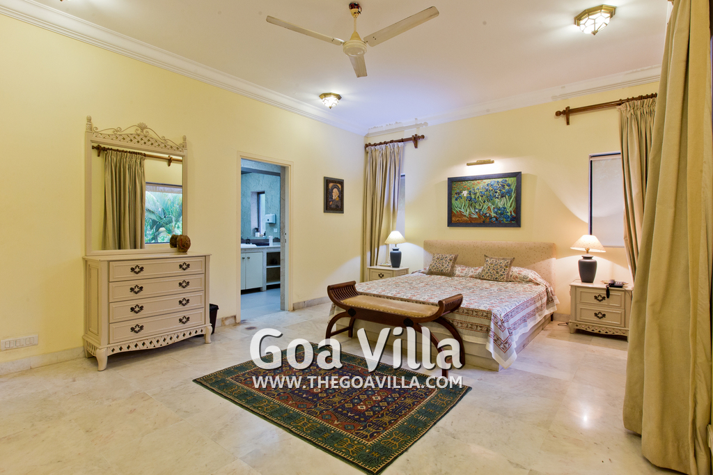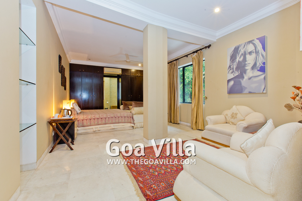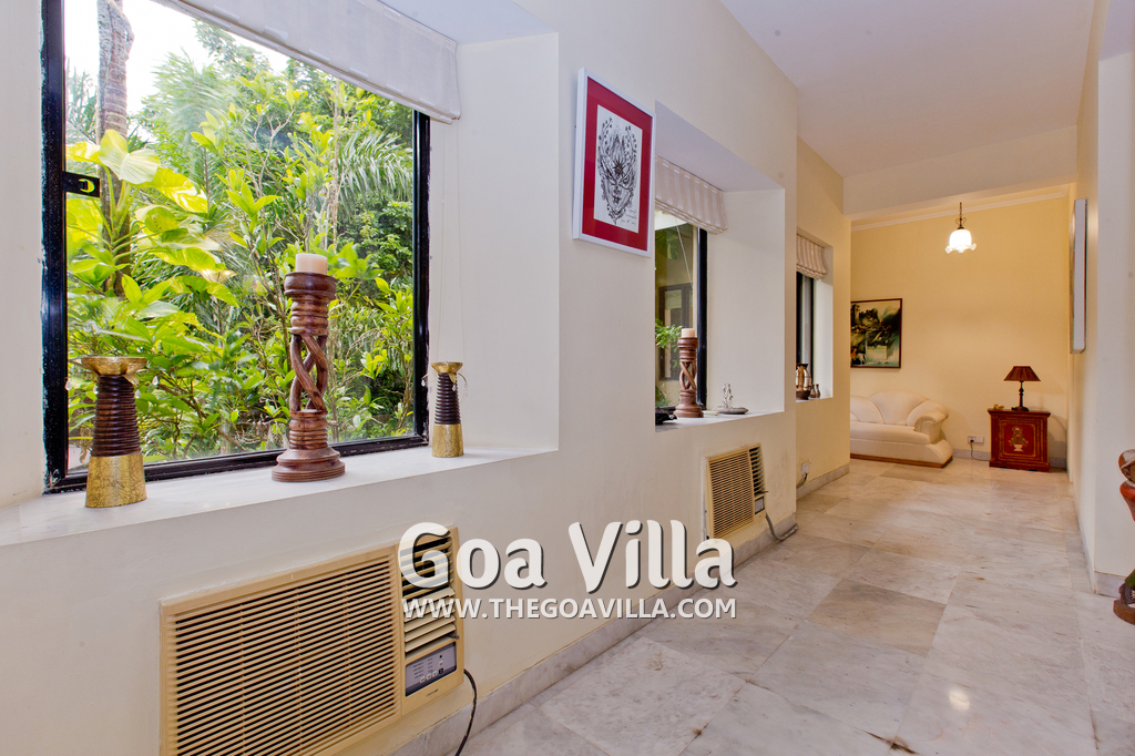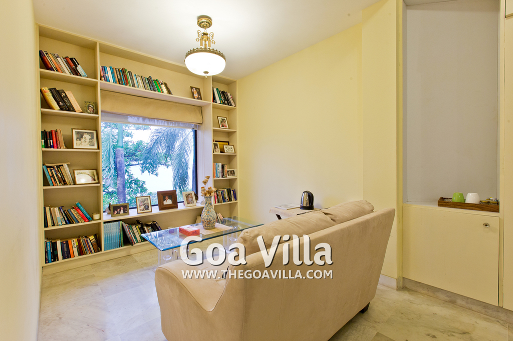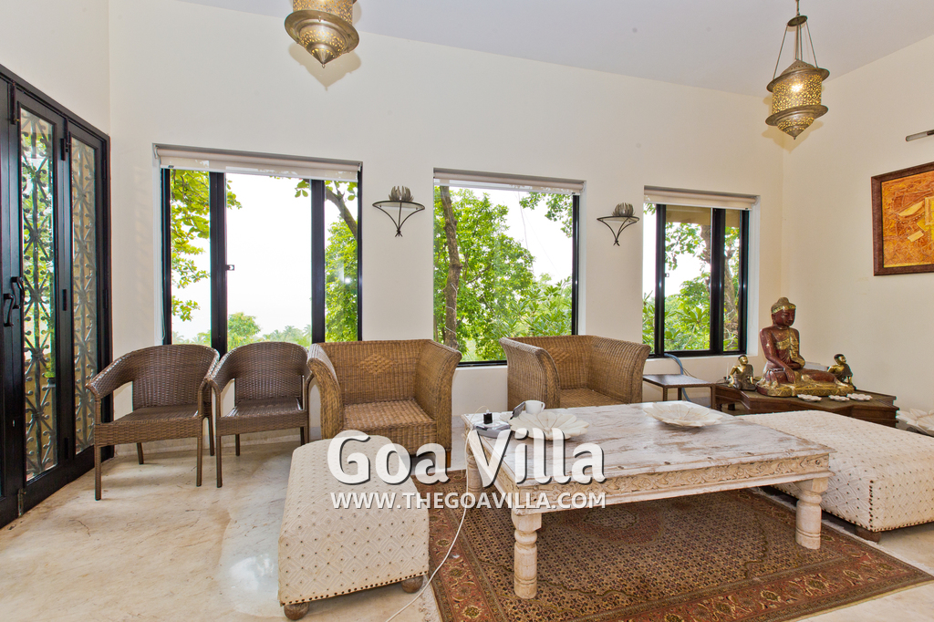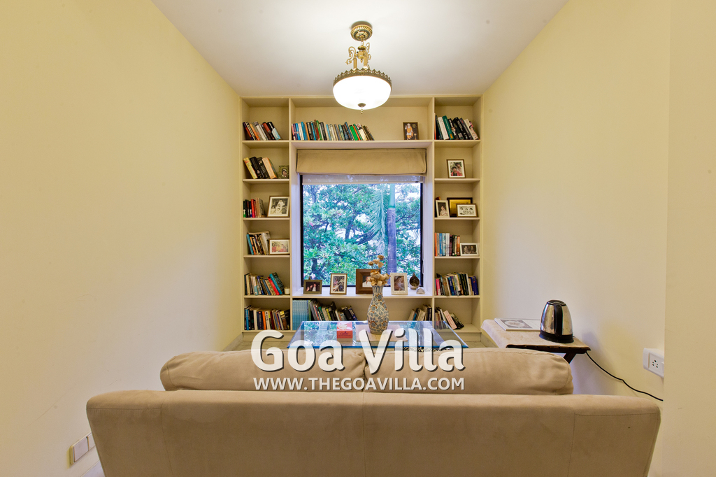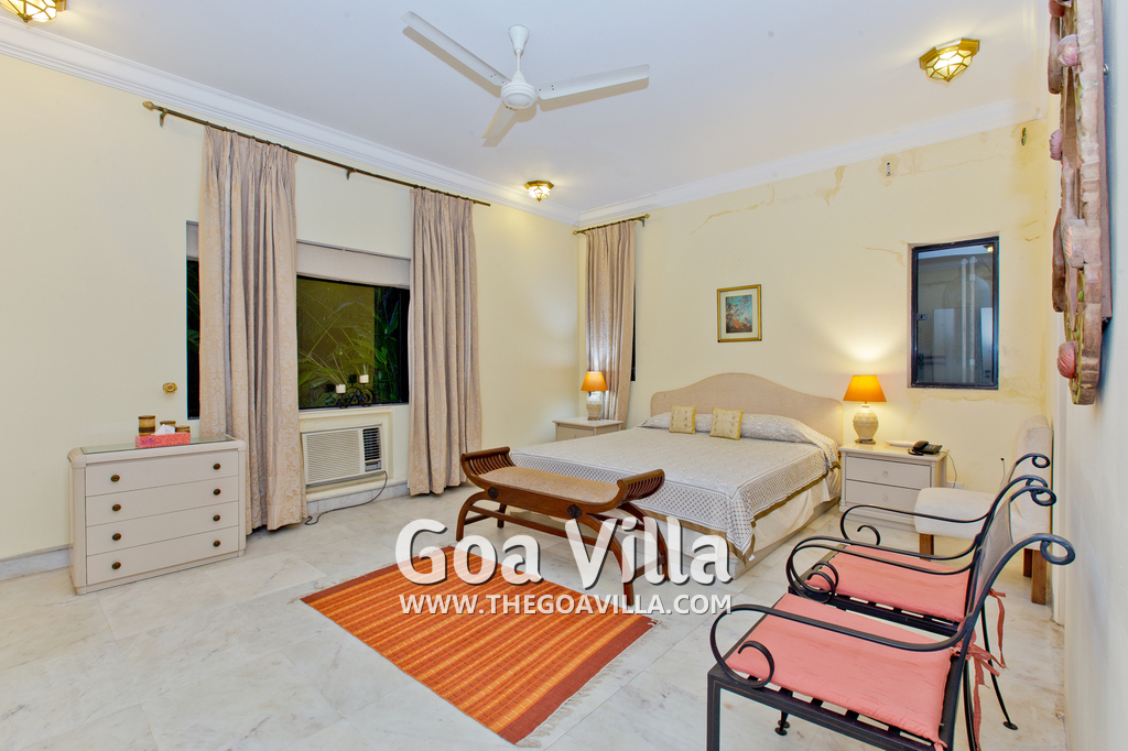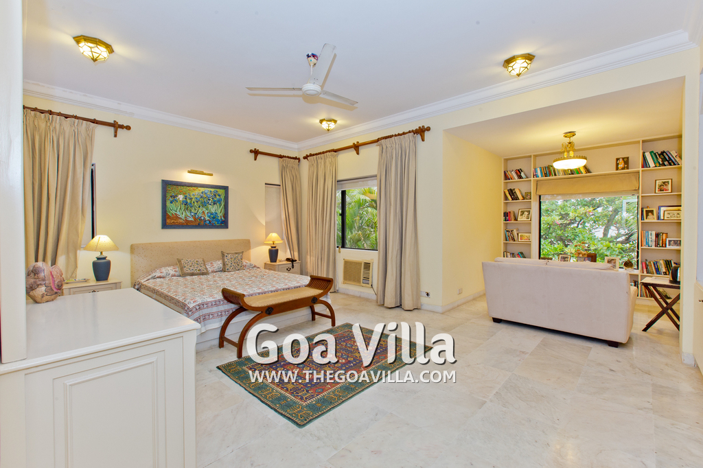 Bedrooms – The villa has 6 bedrooms, all en-suite and air conditioned. They are large and airy with a king bed, side table, beautiful lamp shades, wardrobe, sitting area, carpet, and paintings. The master suite has a small library. Each bedroom has a satellite television, mini bar, tea and coffee making facilities. Large glass windows provide nature views and views of the Zuari river’s estuary.