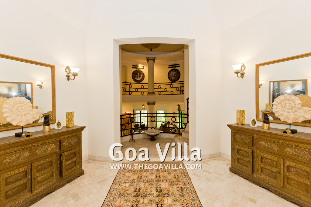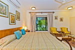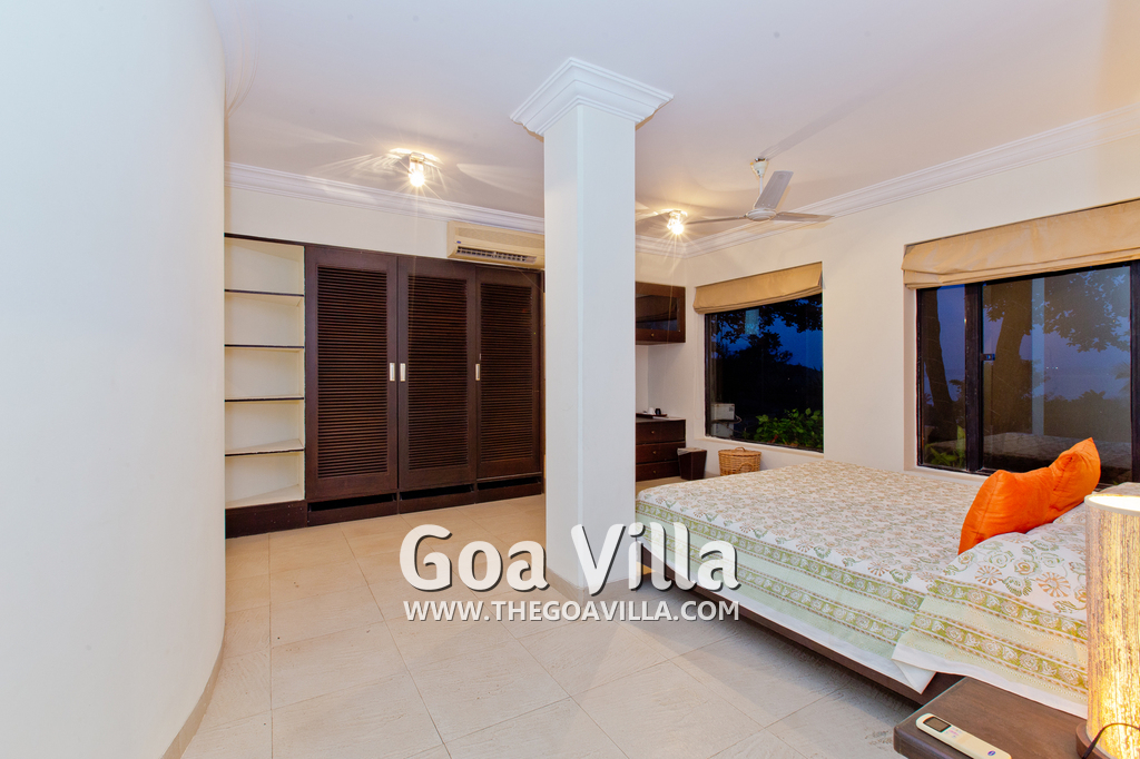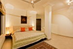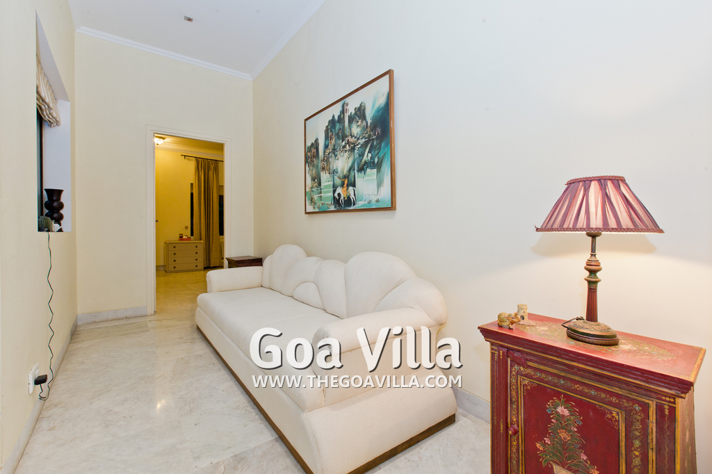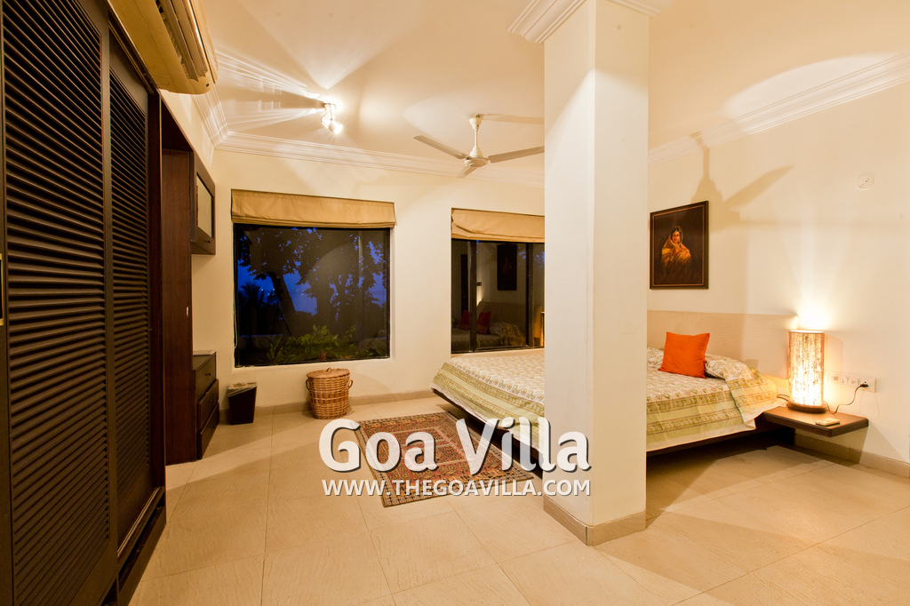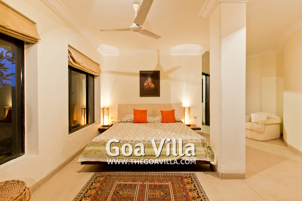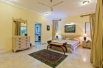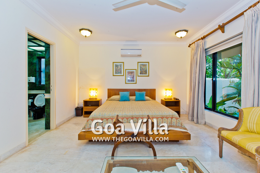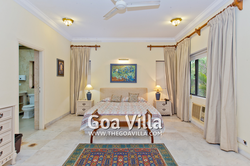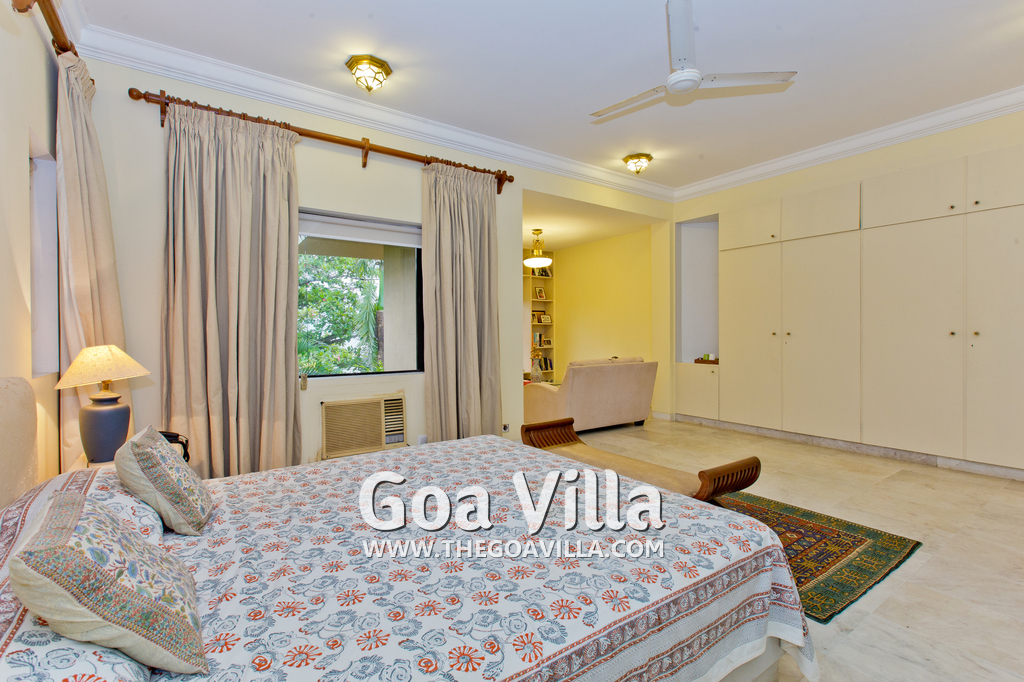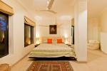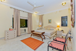 Bedrooms – The villa has 6 bedrooms, all en-suite and air conditioned. They are large and airy with a king bed, side table, beautiful lamp shades, wardrobe, sitting area, carpet, and paintings. The master suite has a small library. Each bedroom has a satellite television, mini bar, tea and coffee making facilities. Large glass windows provide nature views and views of the Zuari river’s estuary.