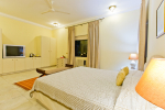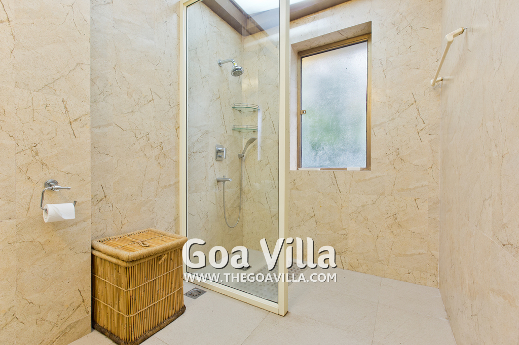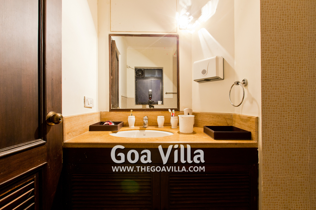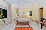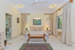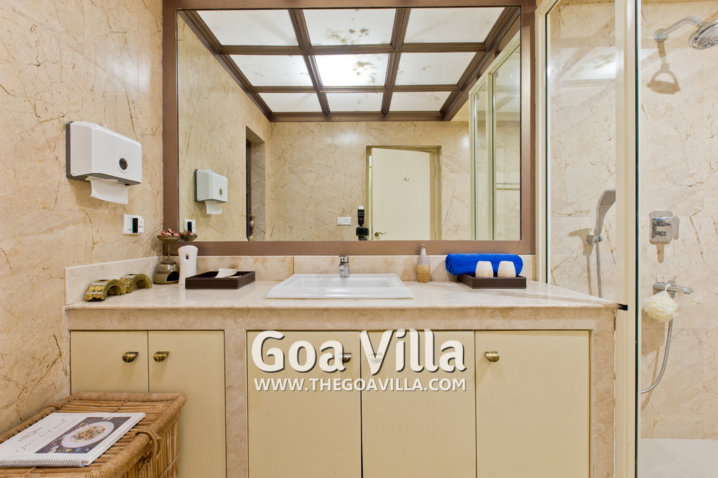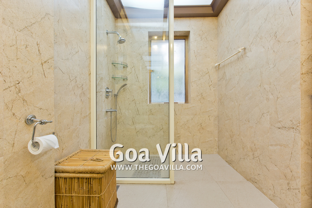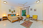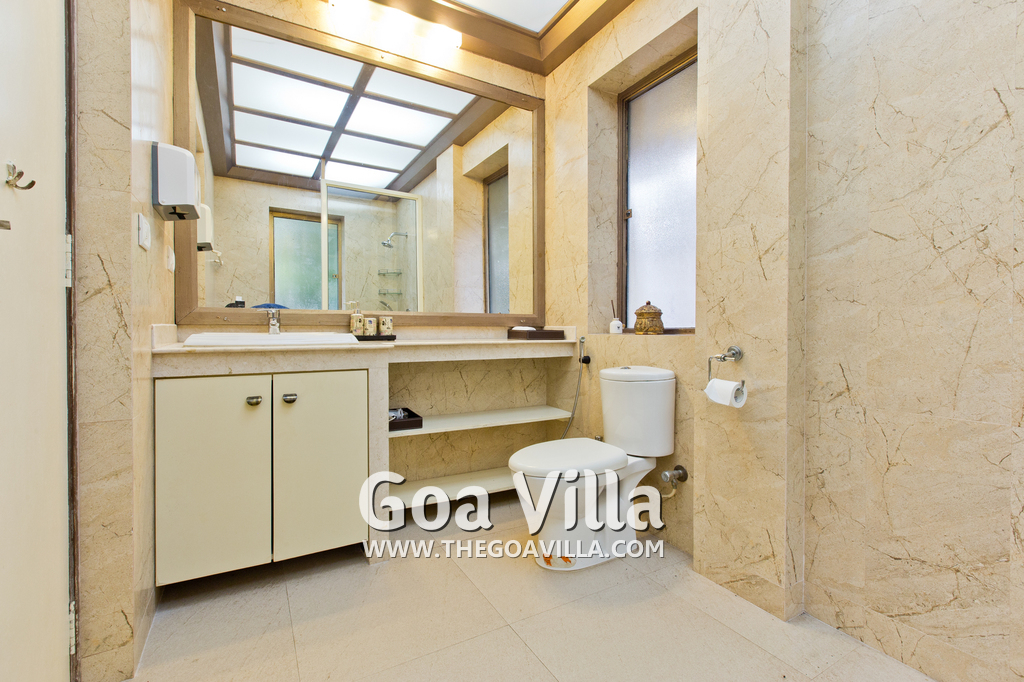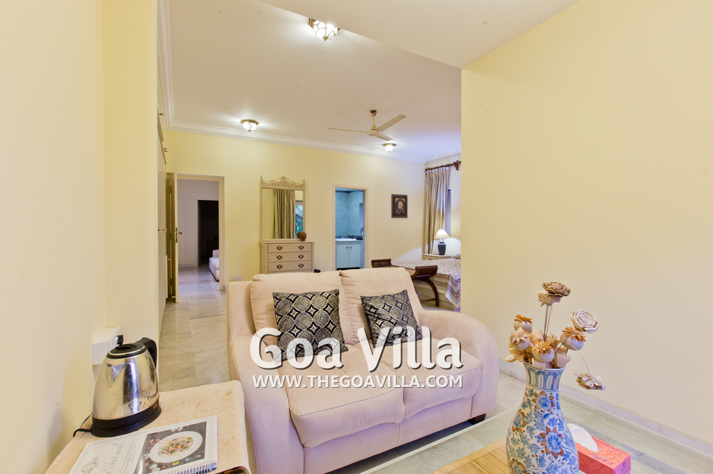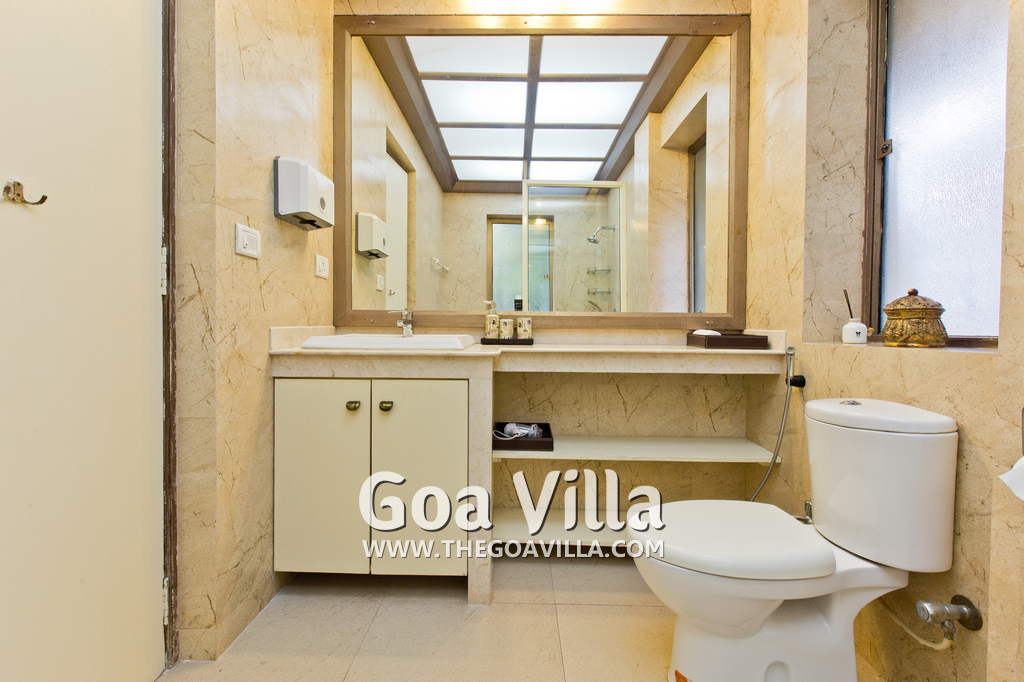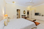 Bedrooms – The villa has 6 bedrooms, all en-suite and air conditioned. They are large and airy with a king bed, side table, beautiful lamp shades, wardrobe, sitting area, carpet, and paintings. The master suite has a small library. Each bedroom has a satellite television, mini bar, tea and coffee making facilities. Large glass windows provide nature views and views of the Zuari river’s estuary.