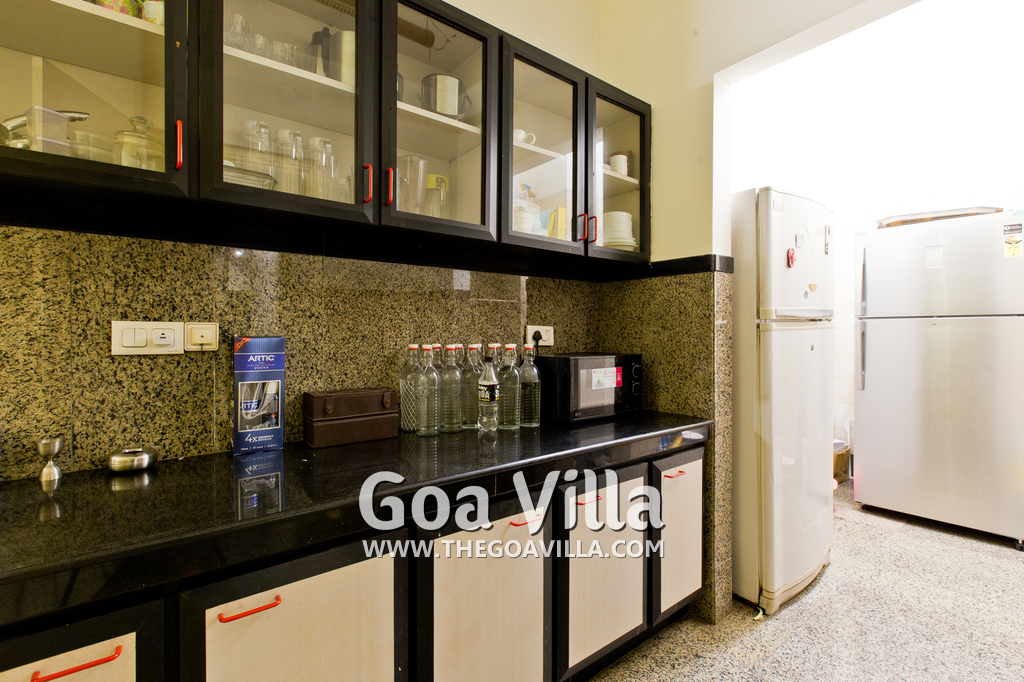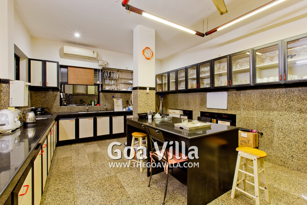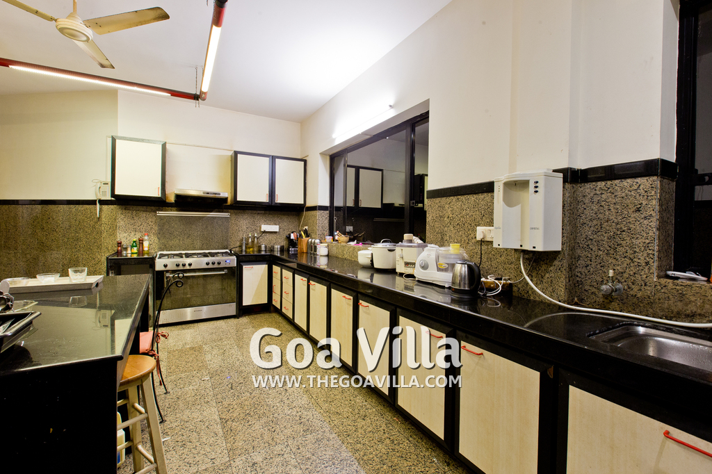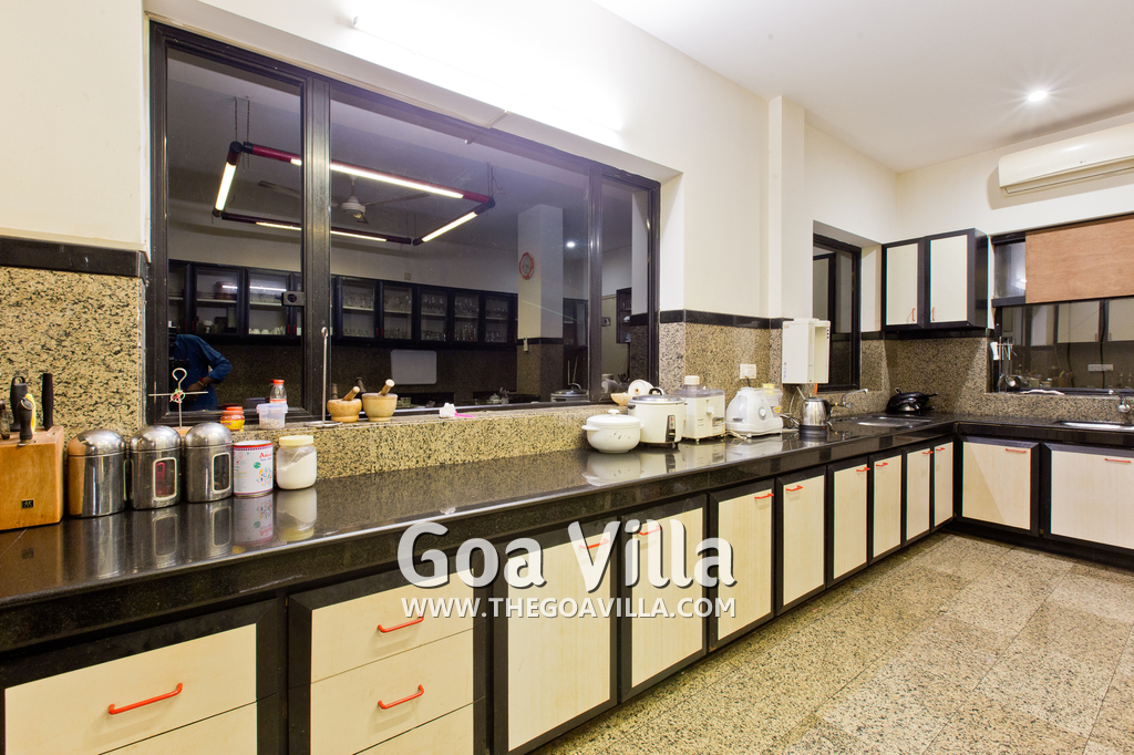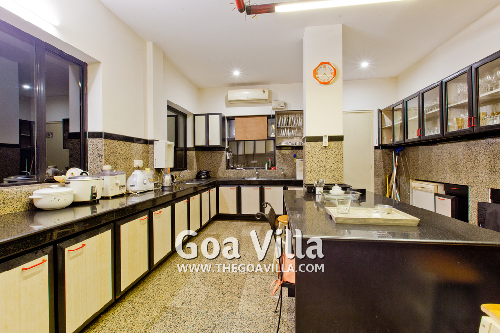Kitchen, Dining – Guests can use the fully-equipped kitchen at this North Goa villa for rent. There is a gas station, chimney, microwave, kettle, rice cooker, toaster, and blender. Small dining area within the kitchen. Breakfast is included in the cost. The formal dining area provides sitting for 8 guests. Tableware and cookware is provided.