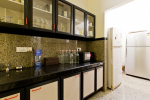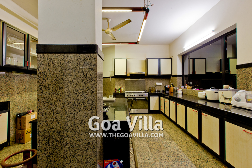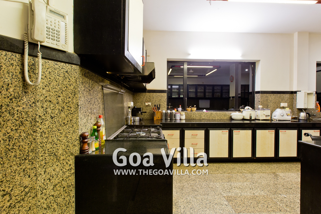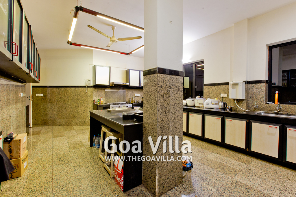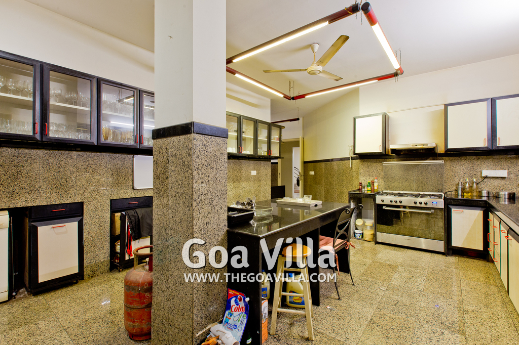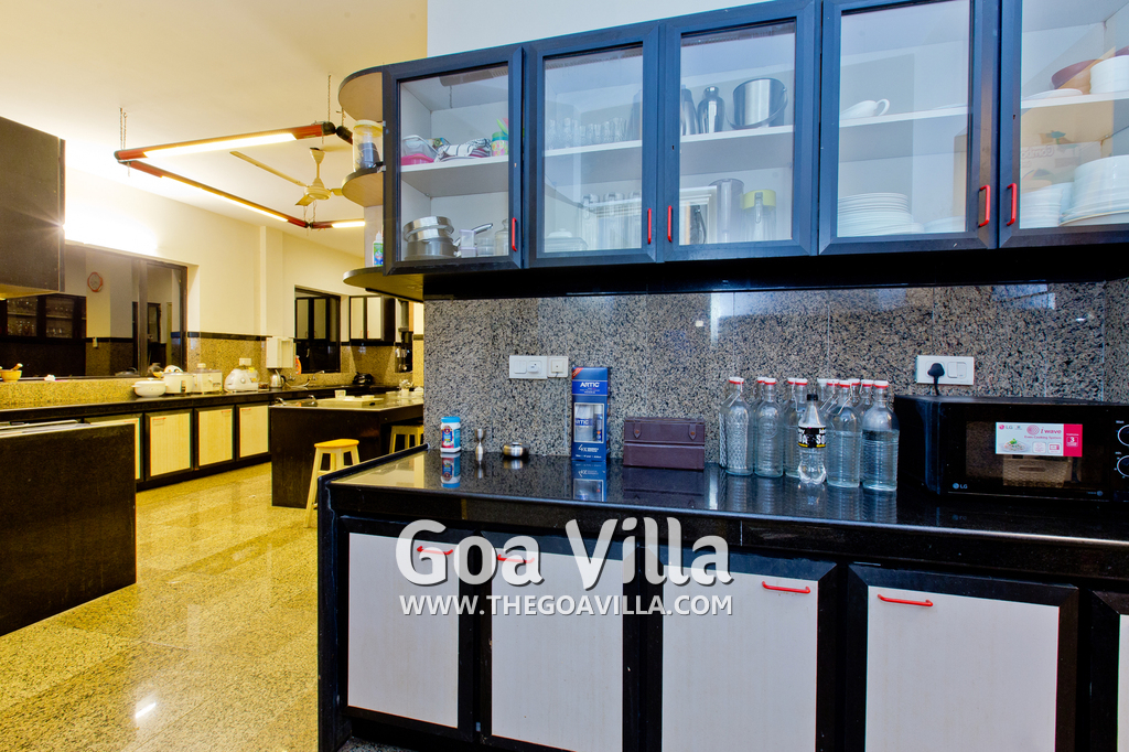 Kitchen, Dining – Guests can use the fully-equipped kitchen at this North Goa villa for rent. There is a gas station, chimney, microwave, kettle, rice cooker, toaster, and blender. Small dining area within the kitchen. Breakfast is included in the cost. The formal dining area provides sitting for 8 guests. Tableware and cookware is provided.