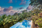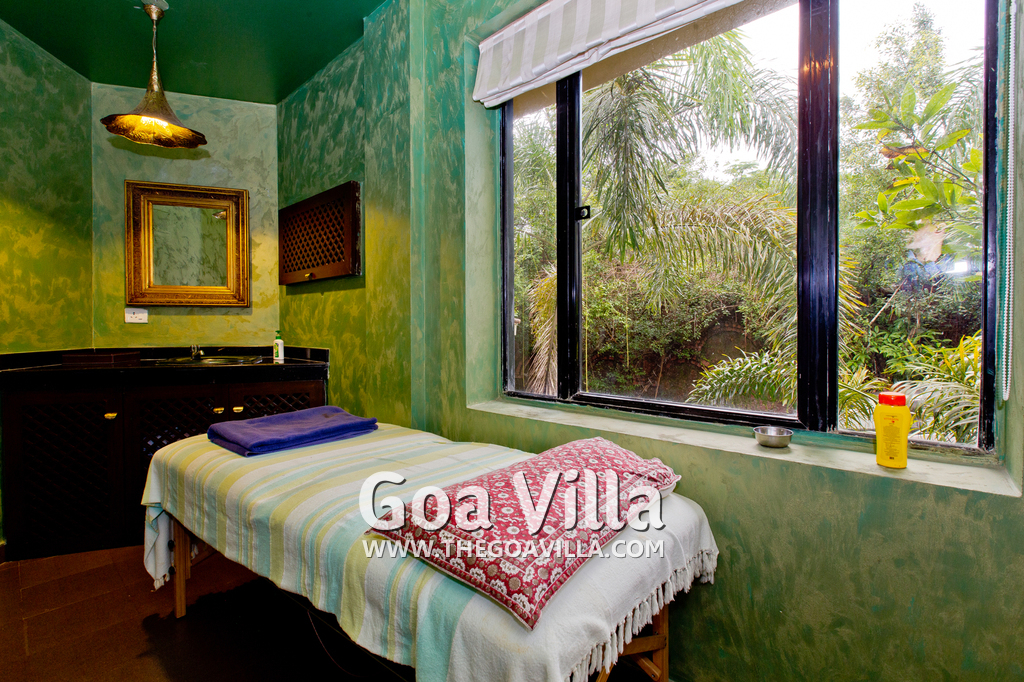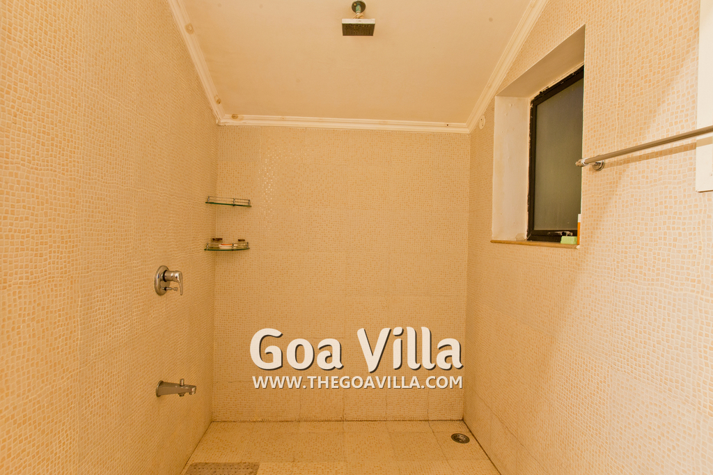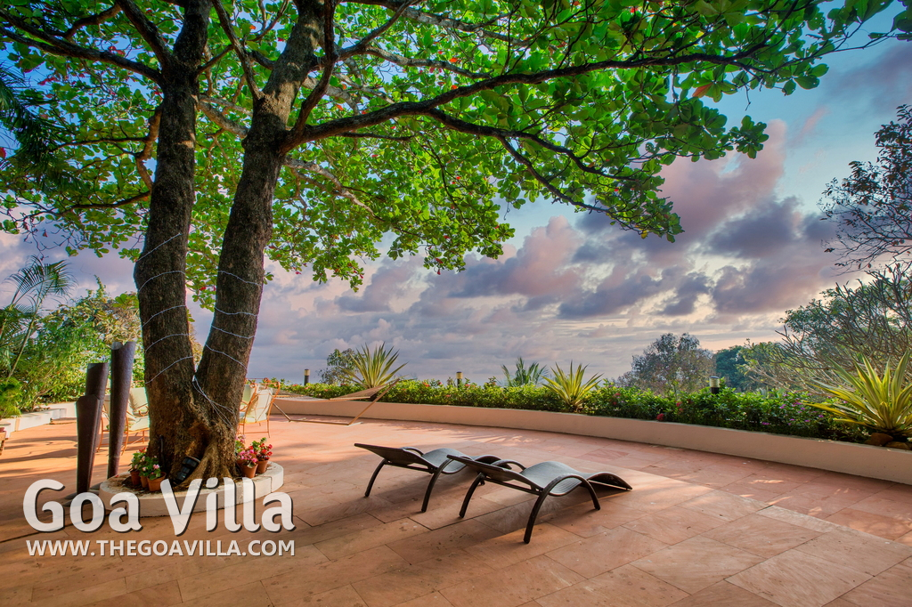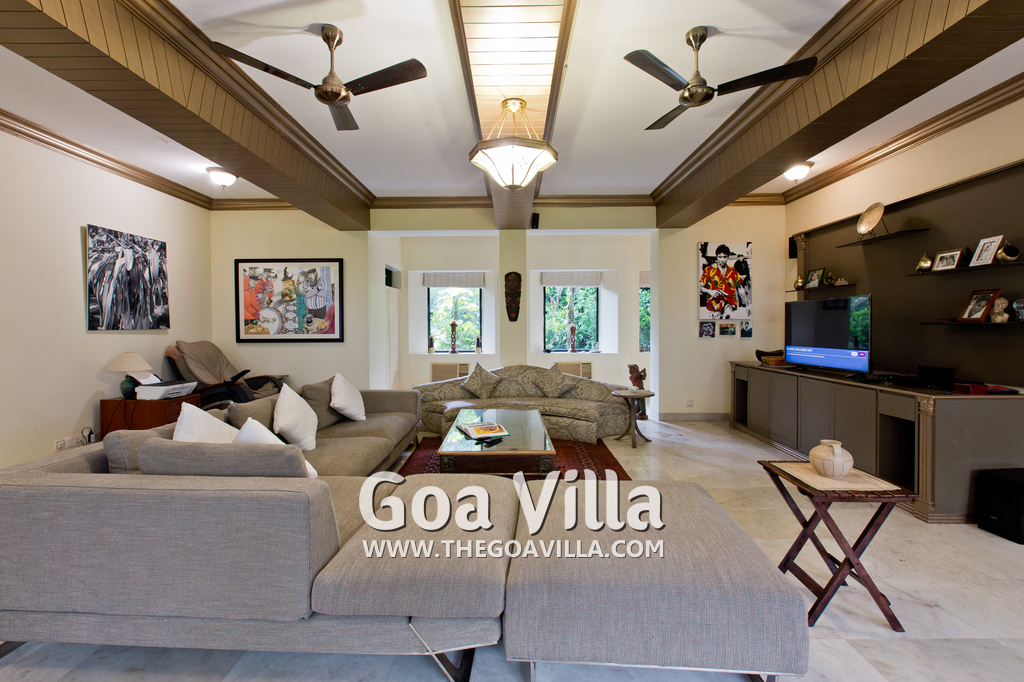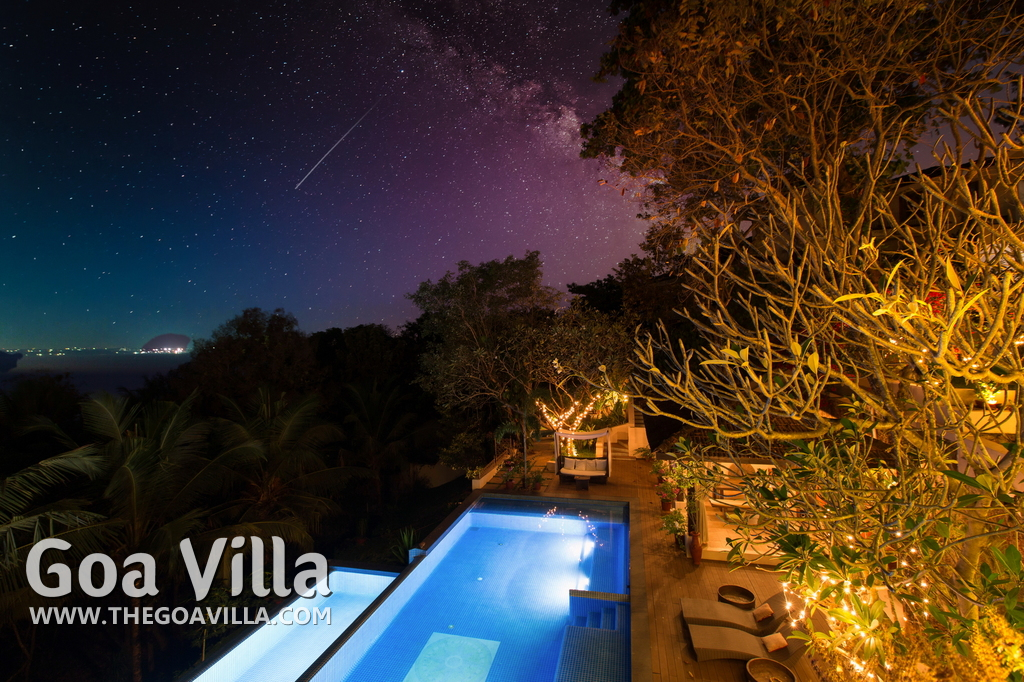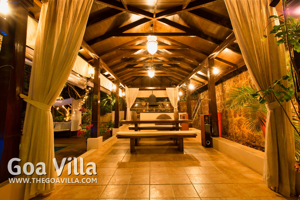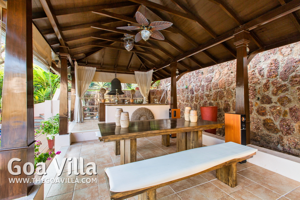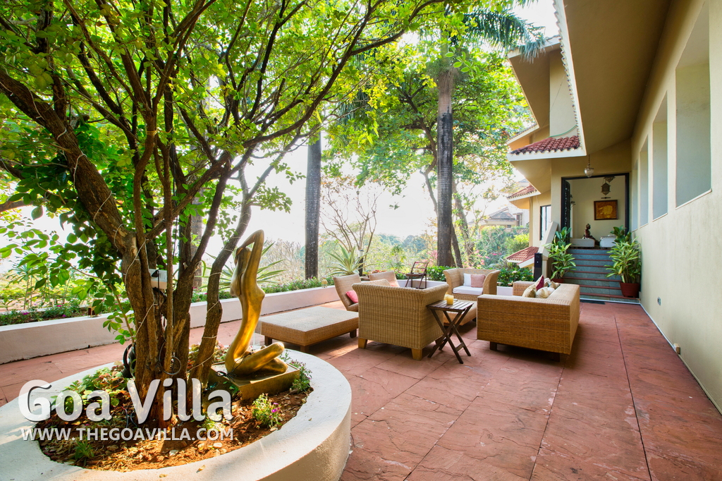 Swimming Pool – A high point, this North Goa villa has an infinity swimming pool with tall trees surrounding it. There are sunbeds on the pool deck. Relax with a drink in hand as you watch a glorious sunset. You will see tall trees, the river, and sea as far as the eye can go. There is a covered patio at one end. This area gets a romantic ambiance after dark as the lights come on.