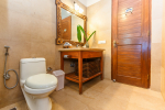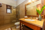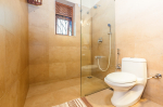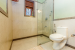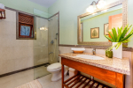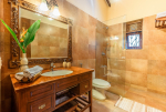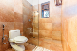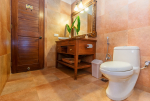 Bathrooms – Large bathrooms with shower cubicle, hand shower, mirror, sink, towel rack, toiletries, and potted plants.