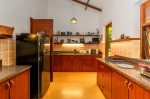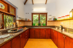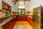 Kitchen, Dining – Family Villa has a fully equipped kitchen with a large refrigerator, water purifier, crockery, cutlery, toaster, microwave, and cooking station. The dining area is outside in the balcony overlooking the fields and swimming pool. Table with seating for 8 guests.