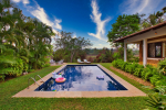 Swimming Pool – The private swimming pool is one of the highlights of the villa. There is a beautiful landscaped garden around the pool with sun loungers on one side and the balcony with dining on the other. There is also a separate sitting arrangement for guests to relax. Fields and tall trees all around.