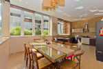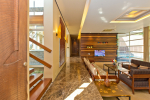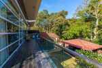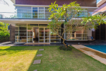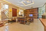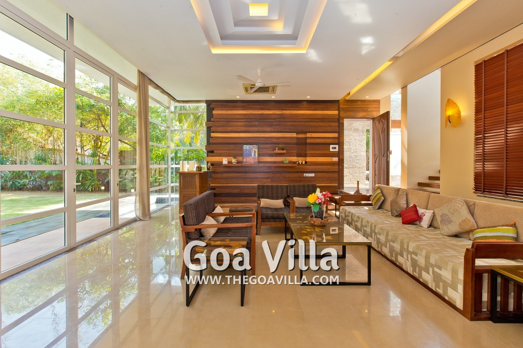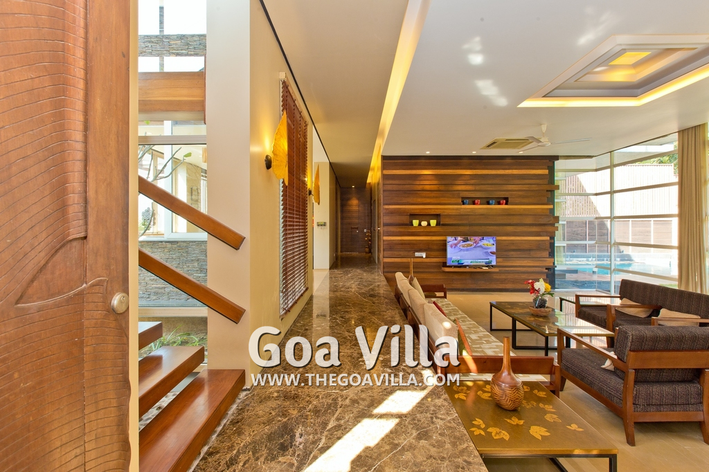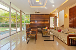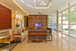 Living Room – It embraces the outdoor scenery. The large living room has ceiling to floor glass door opens to the landscaped lawn outside and tall trees – the tropical paradise, and the swimming pool. There are several sofas and chairs with extra cushions, a glass-top center table, side table, and a fully wooden wall with a wall mounted satellite television. Staircase leads to the first floor from one side.