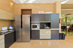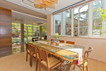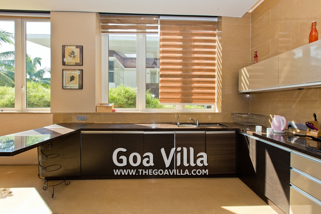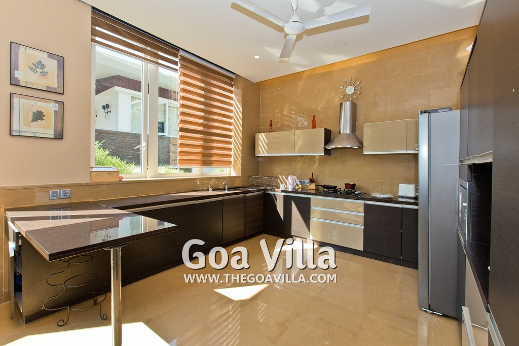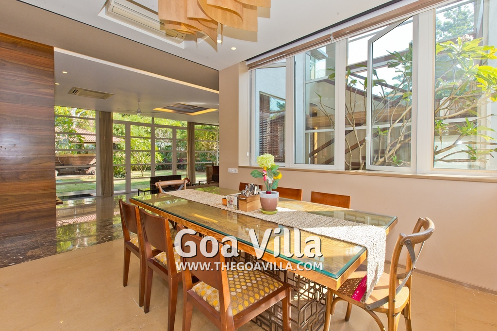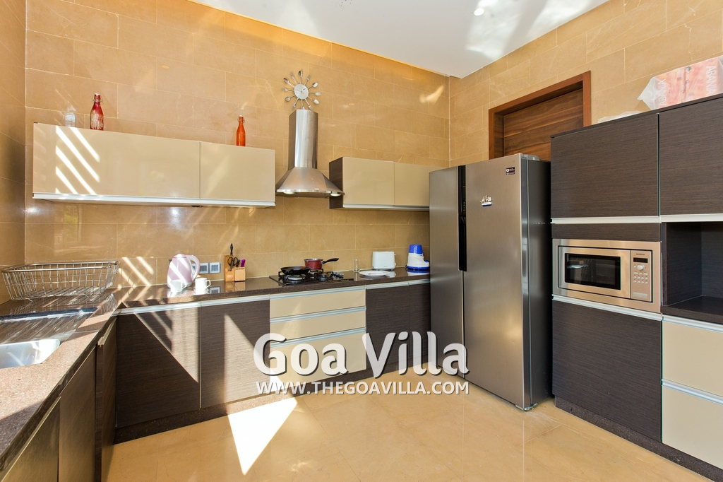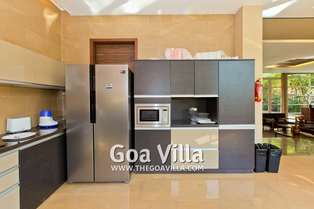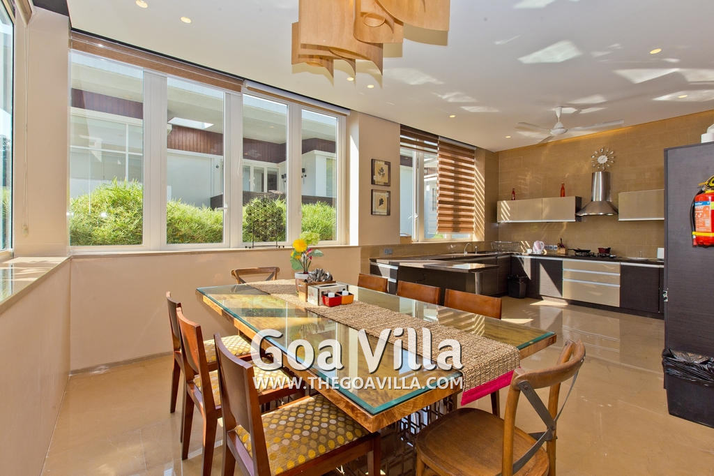 Dining, Kitchen – The dining area is a step above next to the living room. The table has sitting for 8 guests. Hansa Villa’s open-plan kitchen is next to this. It is a fully equipped modular kitchen with a large refrigerator, microwave, toaster, chimney, cooking station, and blender. There is also a fire extinguisher here.