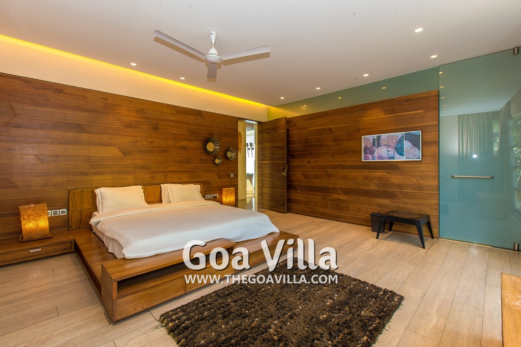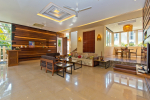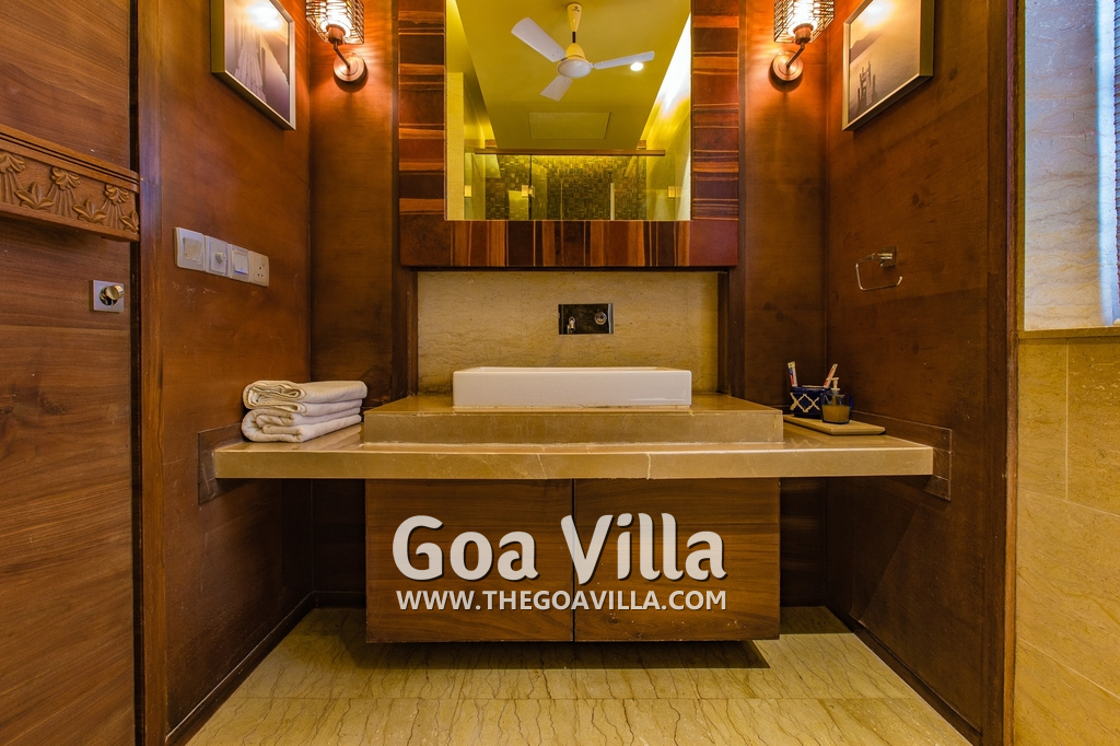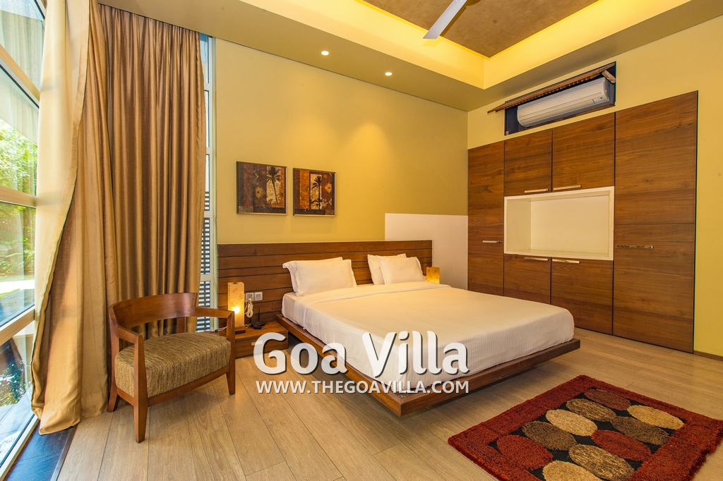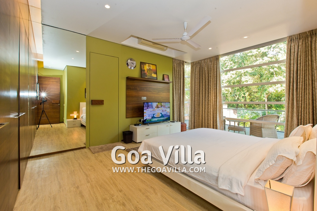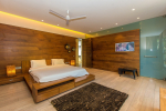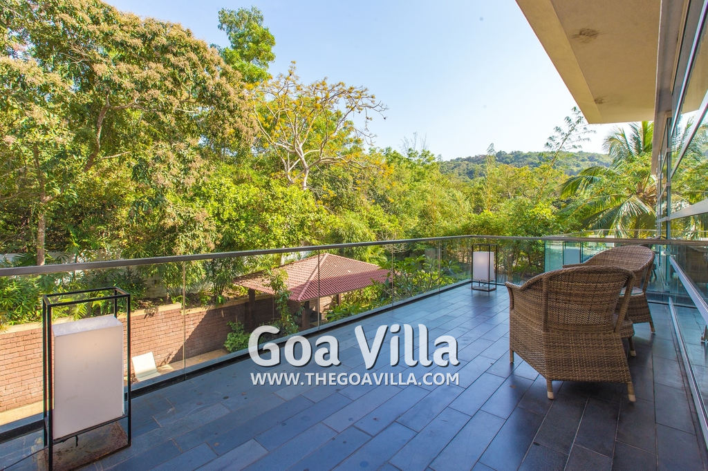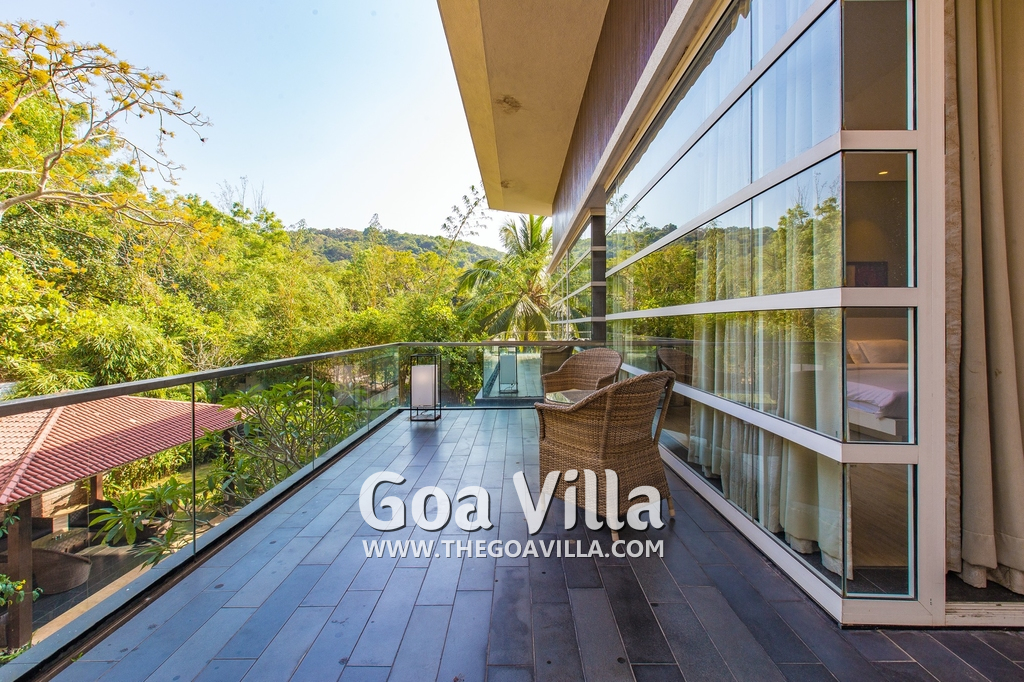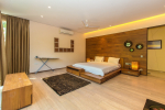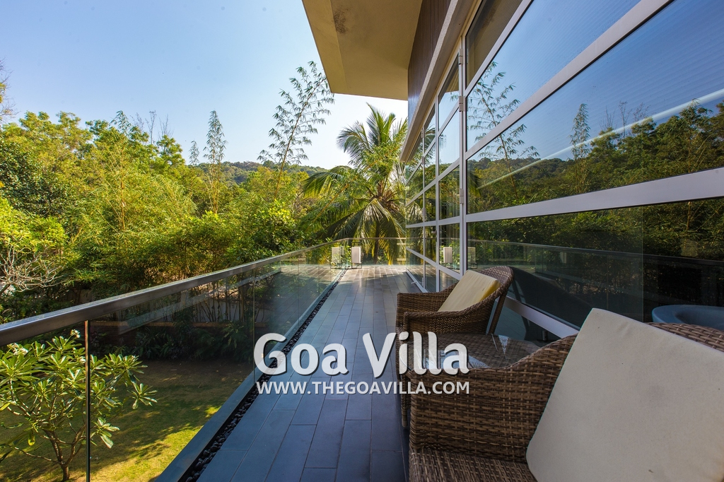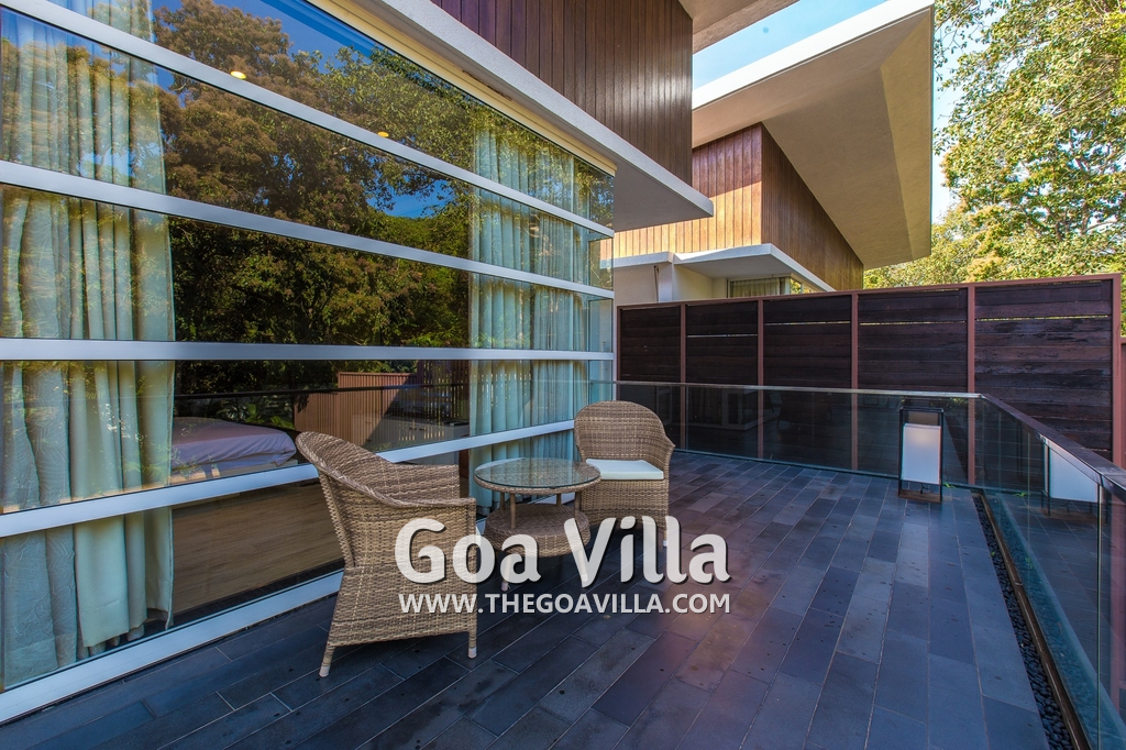 Bedrooms – The villa has 4 modern bedrooms, all en-suite and air-conditioned. They have King-size beds, side tables, lamp shades, wardrobe, carpet, sitting area, and paintings on the wall. The rooms are huge, compared to cramped hotel spaces. You will find them sophisticated, soothing, and ultra-luxe. Soft colors and wood works on the walls. Sliding glass door opens to a balcony outside that greets guests with lush greenery. Cane furniture in the balcony provides sitting, from where guests can enjoy nature and relax. Large windows bring nature into the rooms.