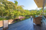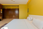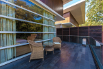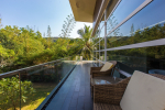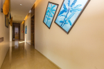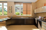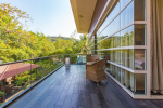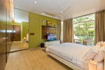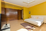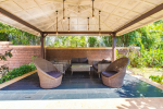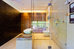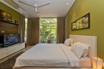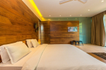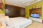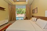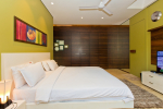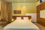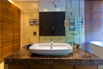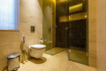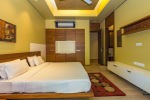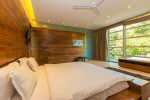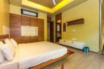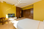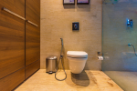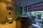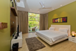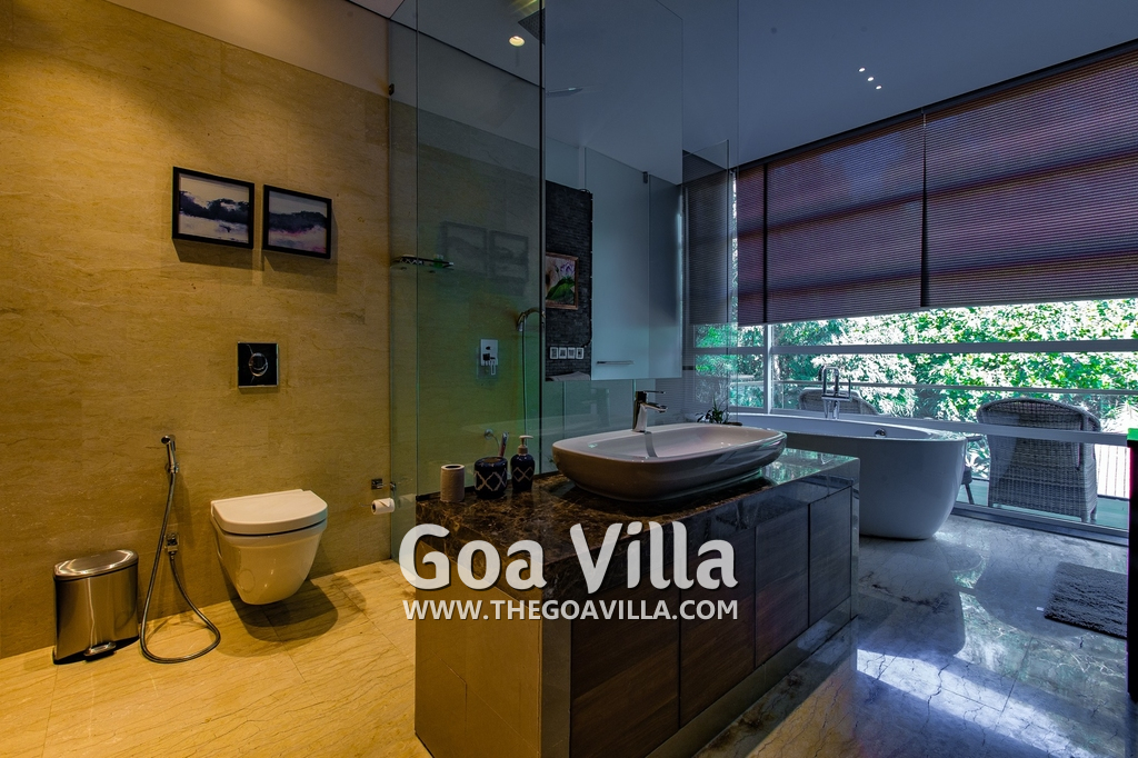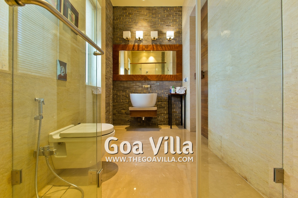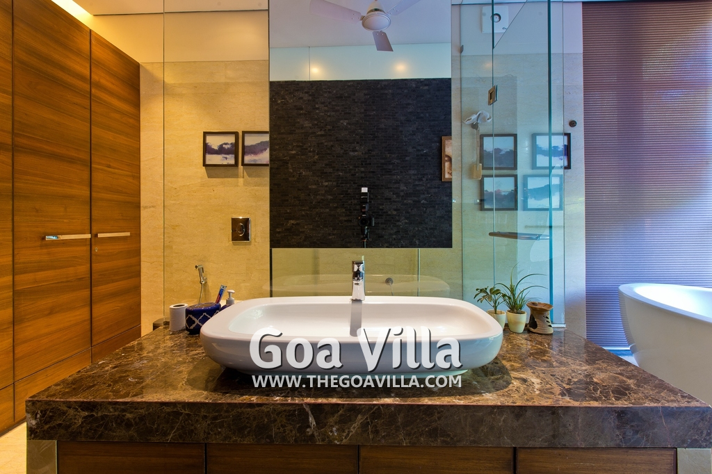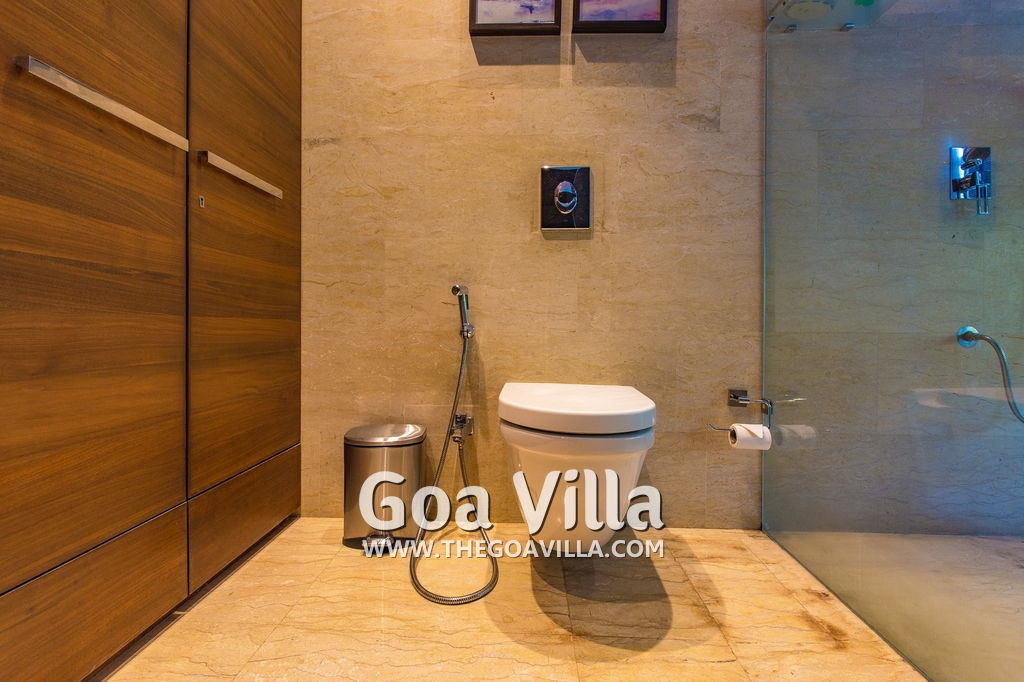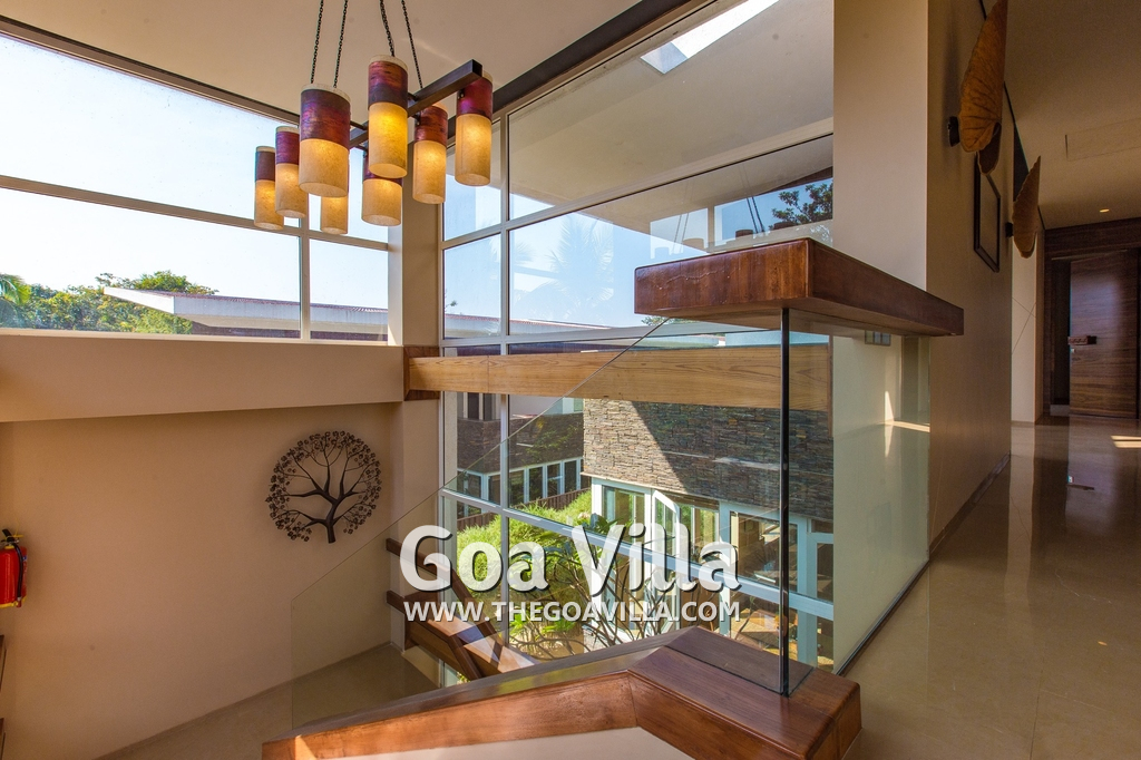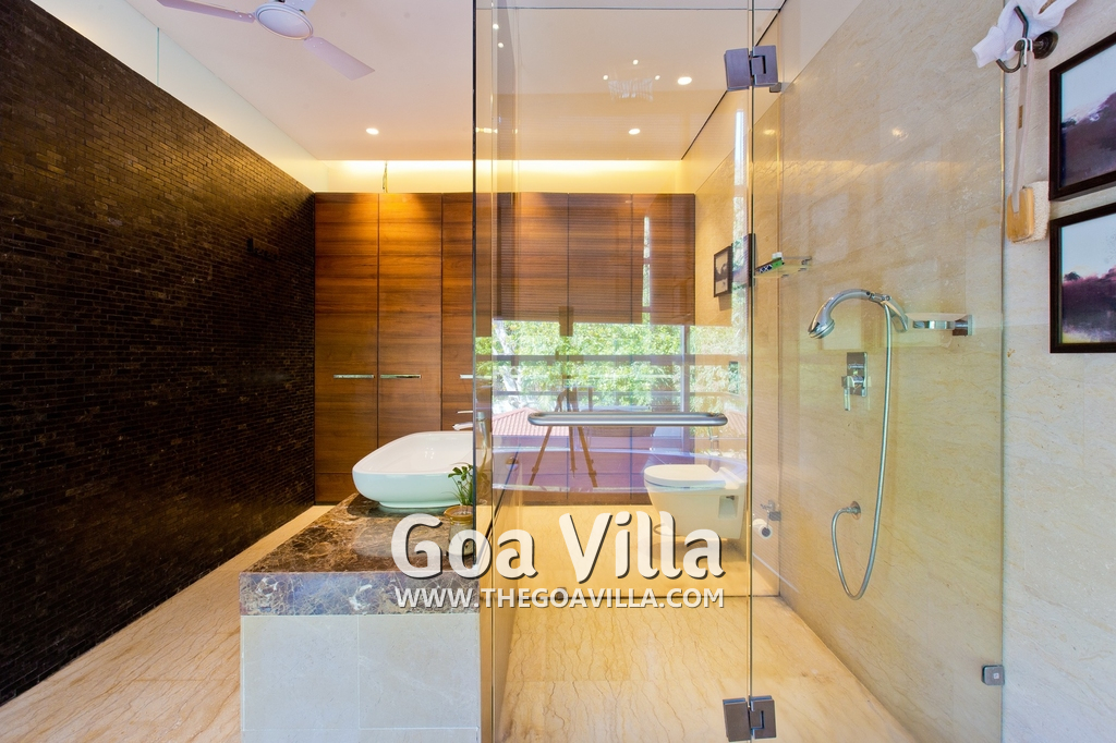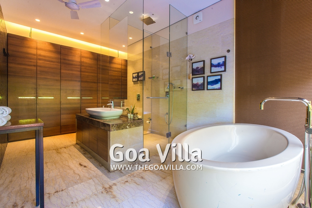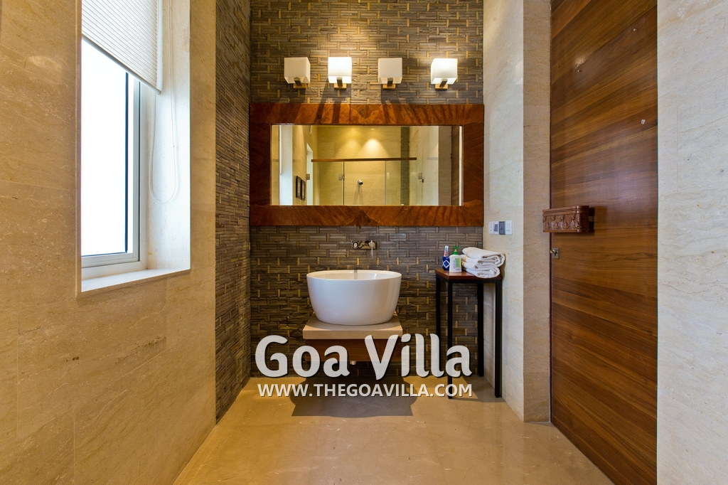 Bedrooms – The villa has 4 modern bedrooms, all en-suite and air-conditioned. They have King-size beds, side tables, lamp shades, wardrobe, carpet, sitting area, and paintings on the wall. The rooms are huge, compared to cramped hotel spaces. You will find them sophisticated, soothing, and ultra-luxe. Soft colors and wood works on the walls. Sliding glass door opens to a balcony outside that greets guests with lush greenery. Cane furniture in the balcony provides sitting, from where guests can enjoy nature and relax. Large windows bring nature into the rooms.