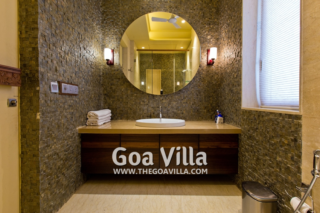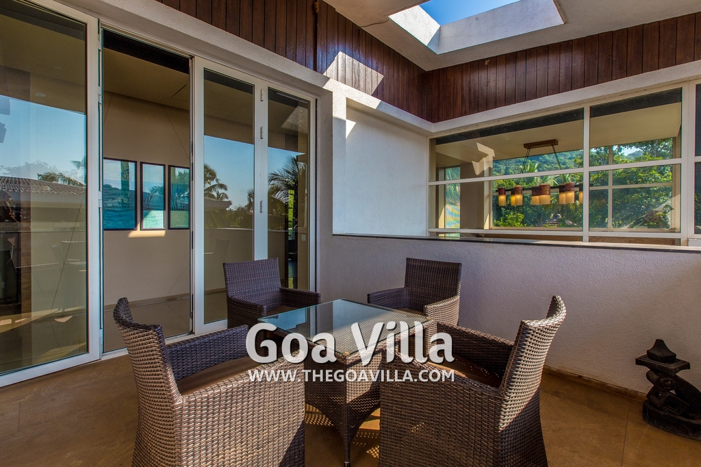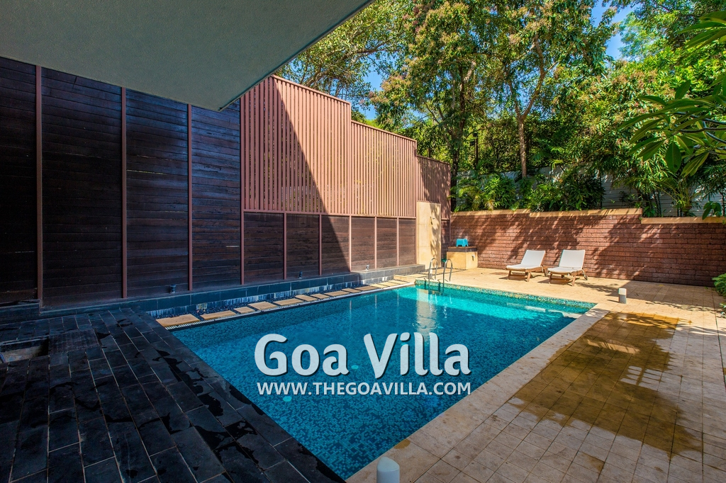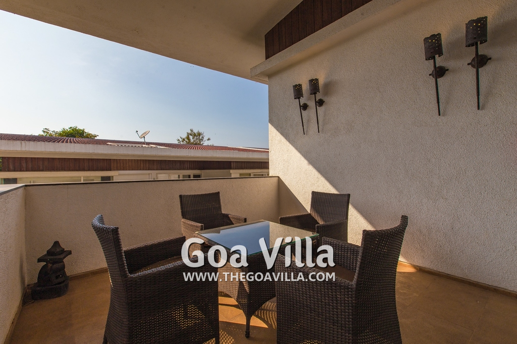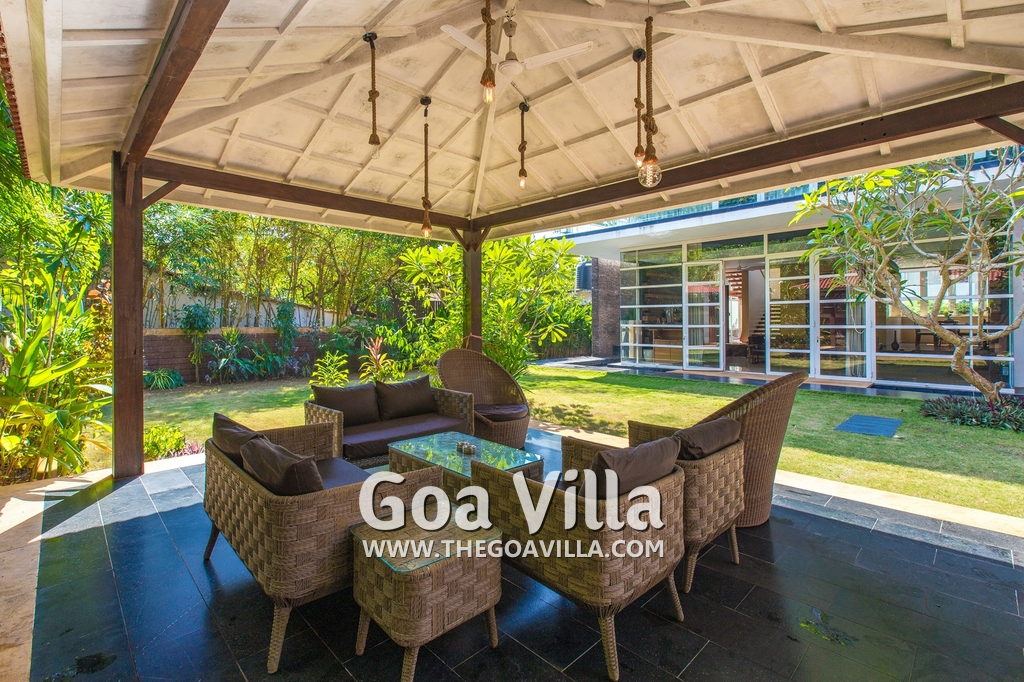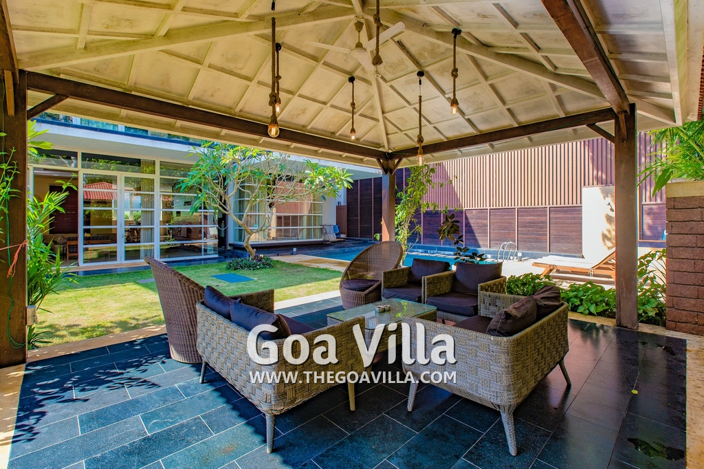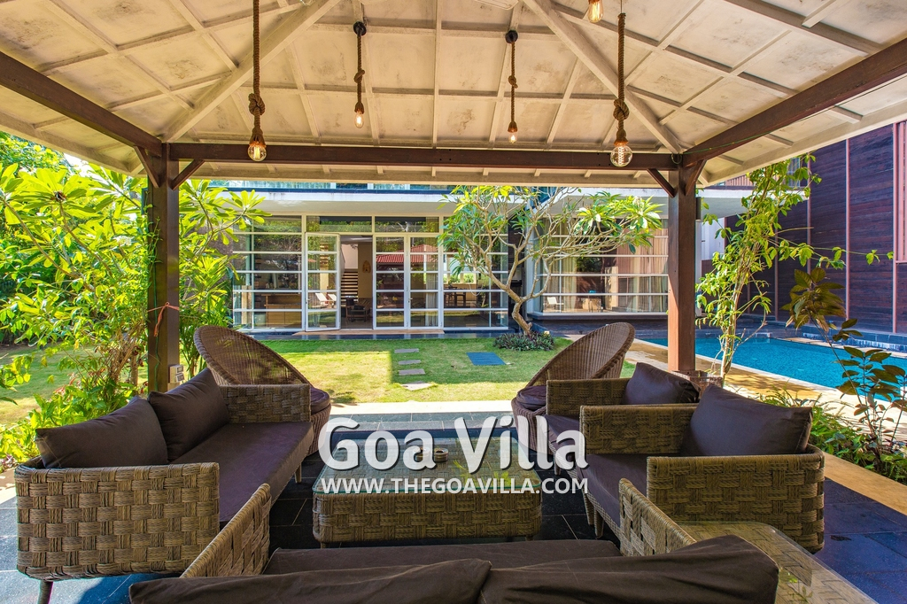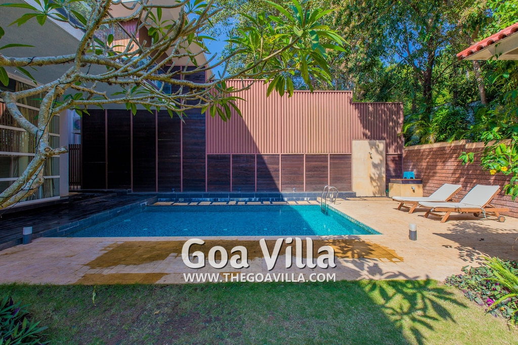 Swimming Pool – his North Goa villa for rent has a private swimming pool with sun beds beside it. There is also a shower where guests can take a quick bath. Next to the pool is a beautifully landscaped lawn, perfect for a picnic lunch. There is also a cabana at one side with cane chairs and a table.