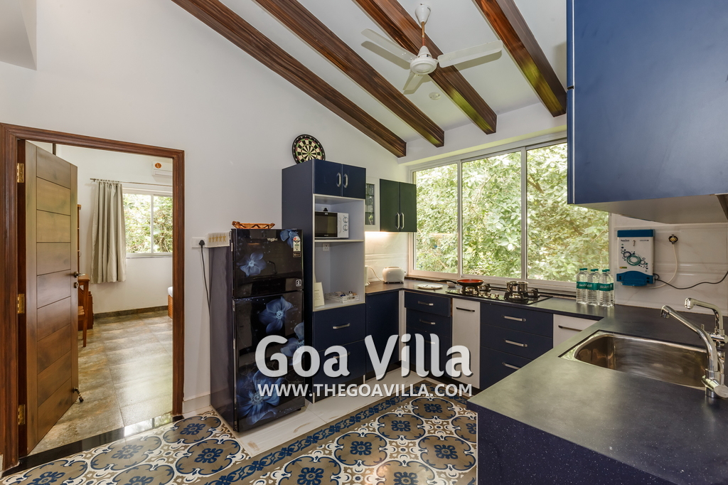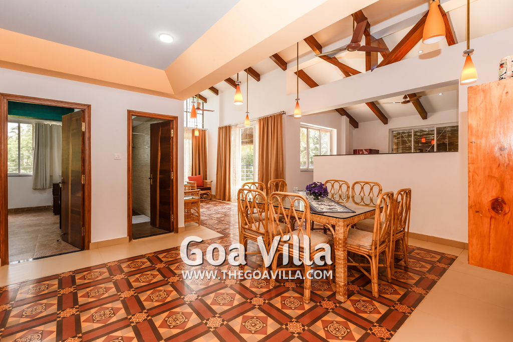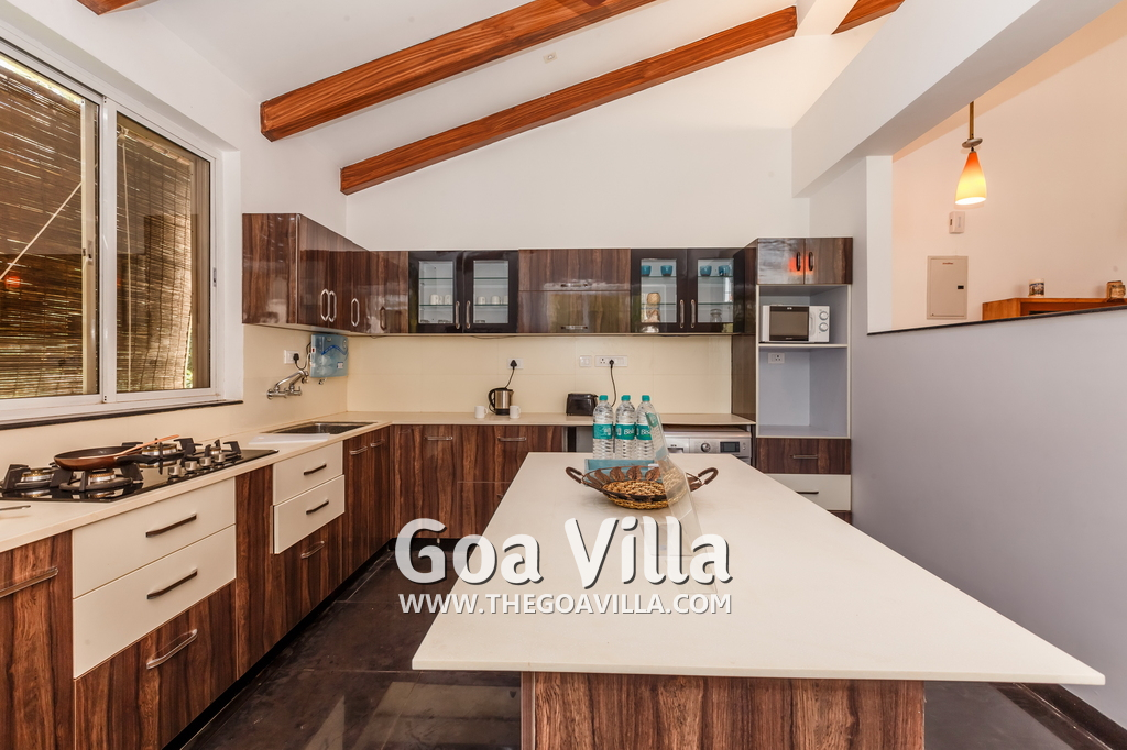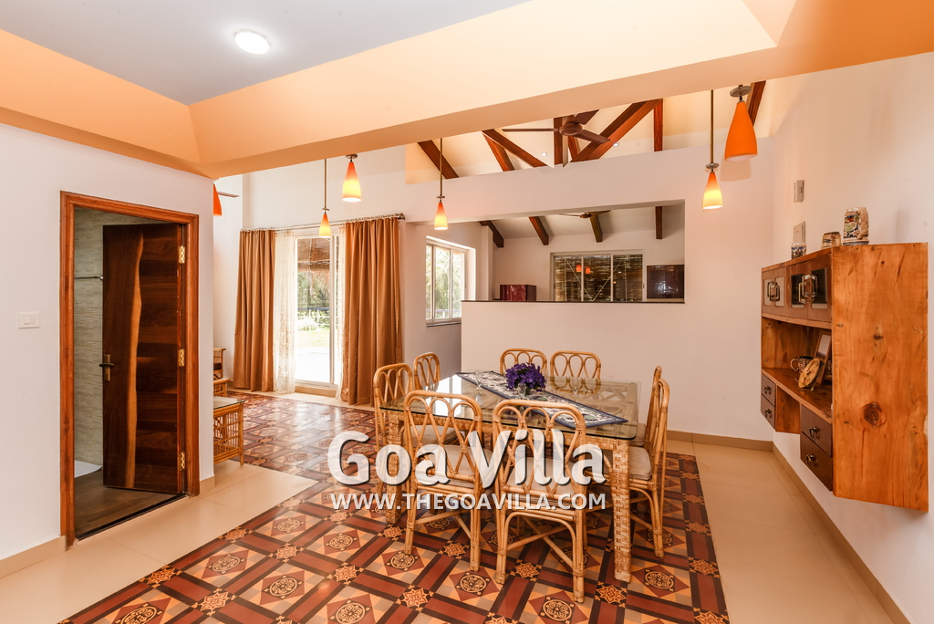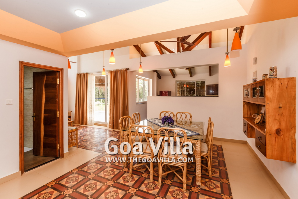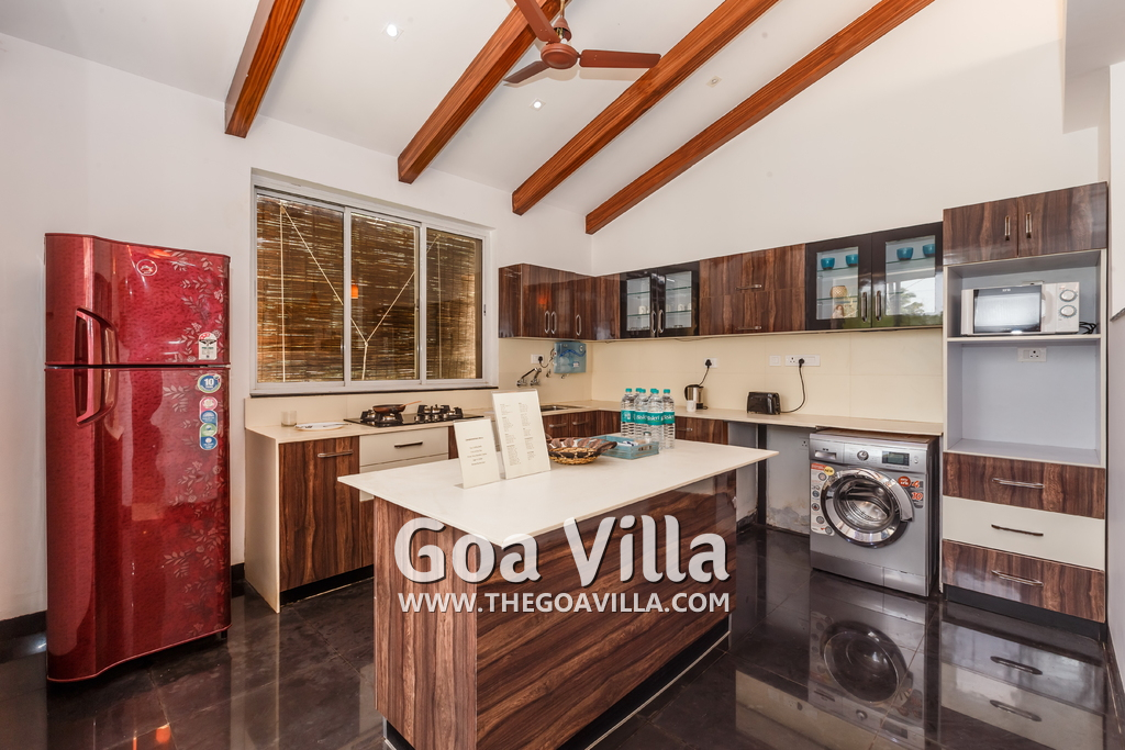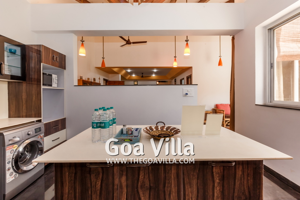 Kitchen, Dining – Morjim Villa has a fully equipped open kitchen with a large refrigerator, cooking station, microwave, tea/coffee maker, washing machine, and water purifier. There is a cane dining table with seating for 8 guests.