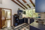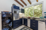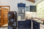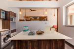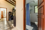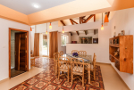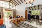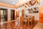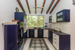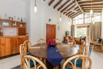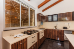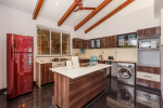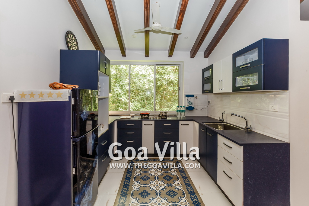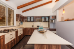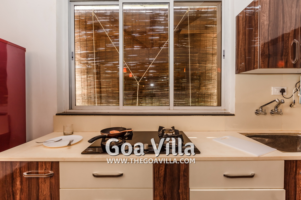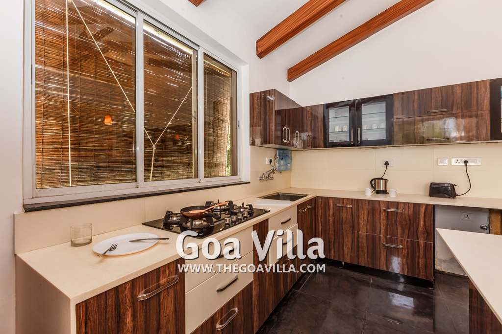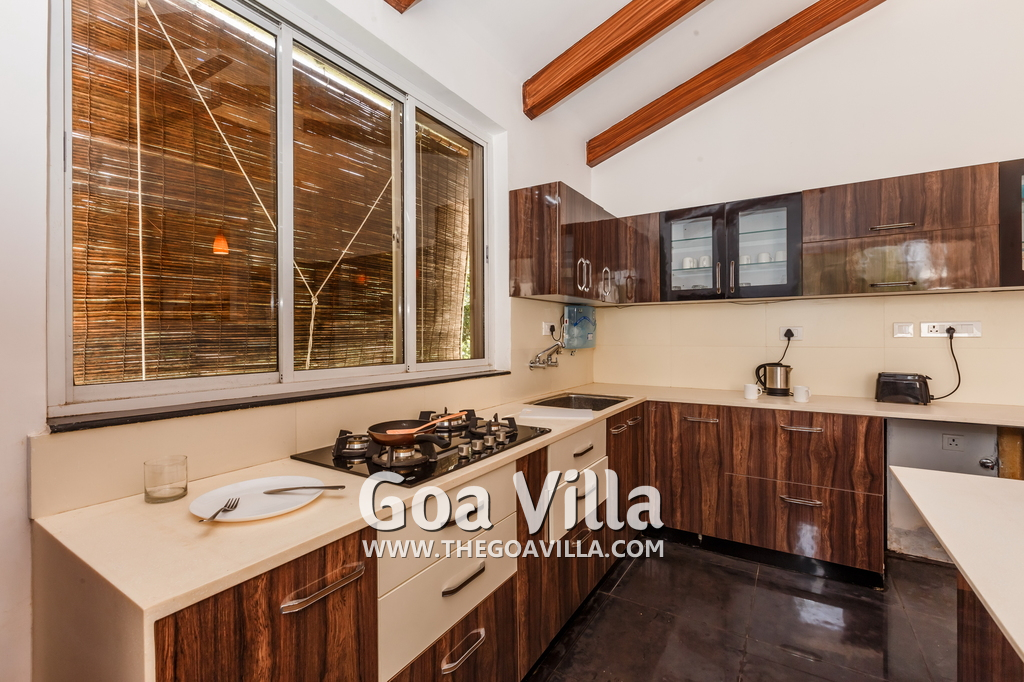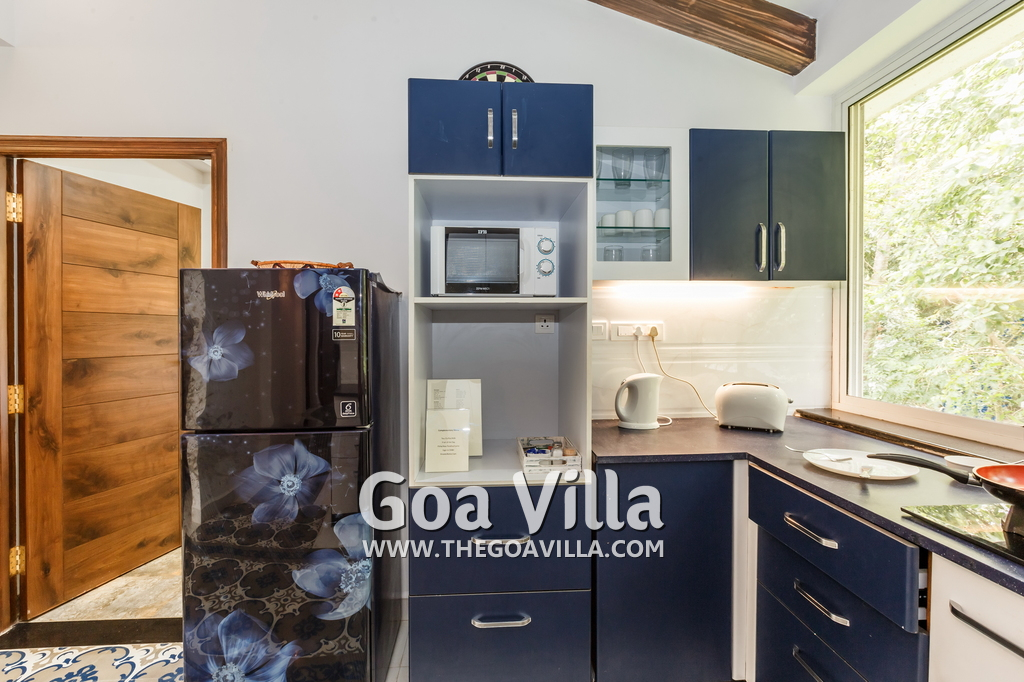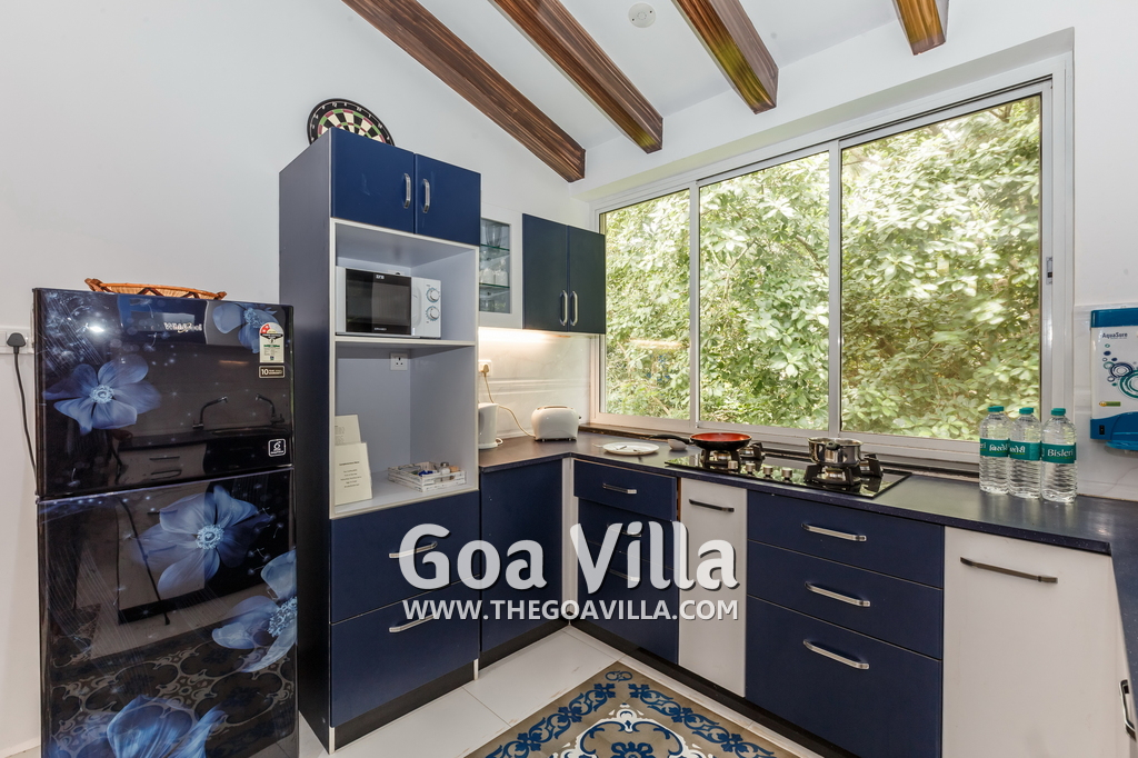 Kitchen, Dining – Morjim Villa has a fully equipped open kitchen with a large refrigerator, cooking station, microwave, tea/coffee maker, washing machine, and water purifier. There is a cane dining table with seating for 8 guests.
