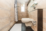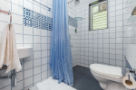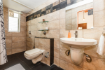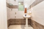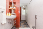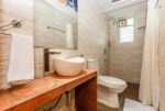 Bathrooms – Spacious bathrooms tiled walls, sink, modern faucets, mirror, and towel rack. Shower area. Toiletries are provided.