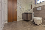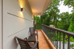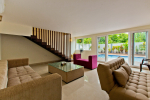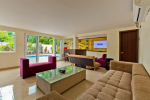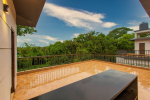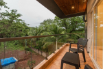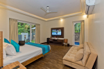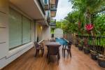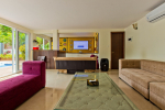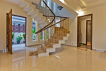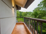 Bedrooms – The villa has 4 bedrooms, all en-suite and air-conditioned. The ground floor and top floor have 1 bedroom each, while the 2 others are located on the second floor. They all have private balconies with a sitting area. Large glass ceiling to floor doors open to the outdoors. Keep it closed for air-conditioning or open to enjoy the outdoors. The ground floor bedroom opens to the manicured lawn. The bedrooms have queen beds, side tables, wardrobe, deep-cushioned sofa, and a large flat-screen television. Hardwood flooring.