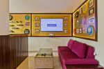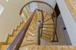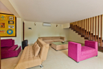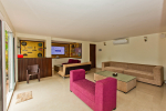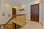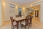 Living Room – The ground floor living room is also air-conditioned. It is very comfortable and cozy with colorful deep-cushioned sofas and a coffee table. Large flat-screen satellite television on the wall. Spiral staircase leads to the first floor from one side. Ceiling-to-floor glass sliding door opens to the swimming pool outside. There is a small lounge on the first floor as well with sitting and a television.