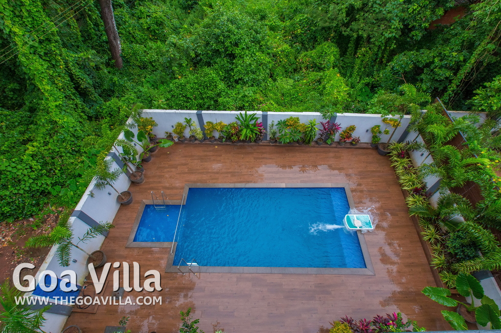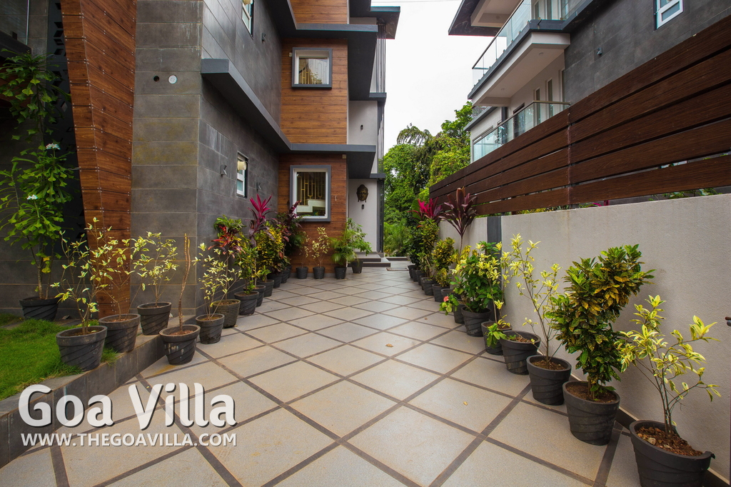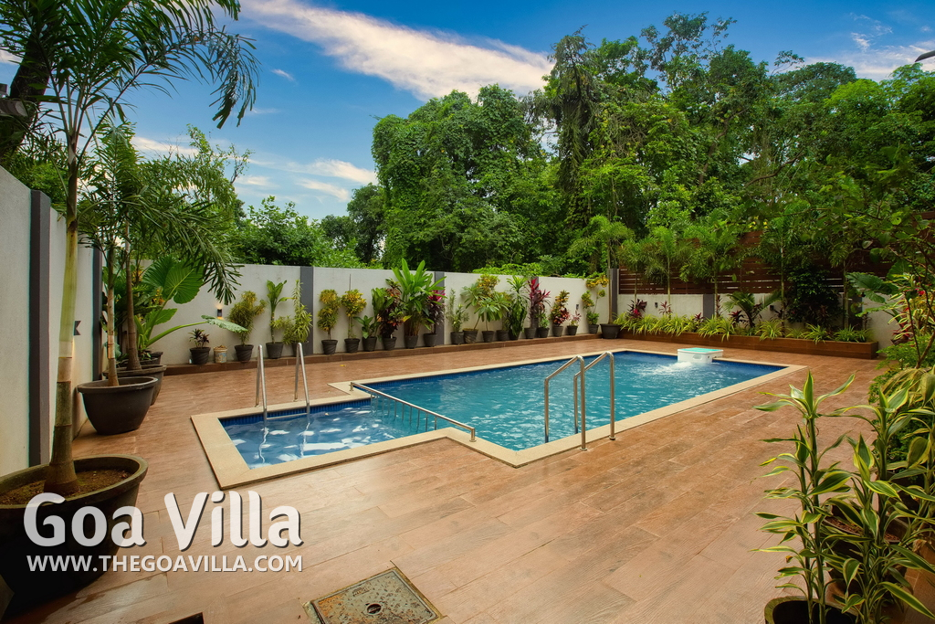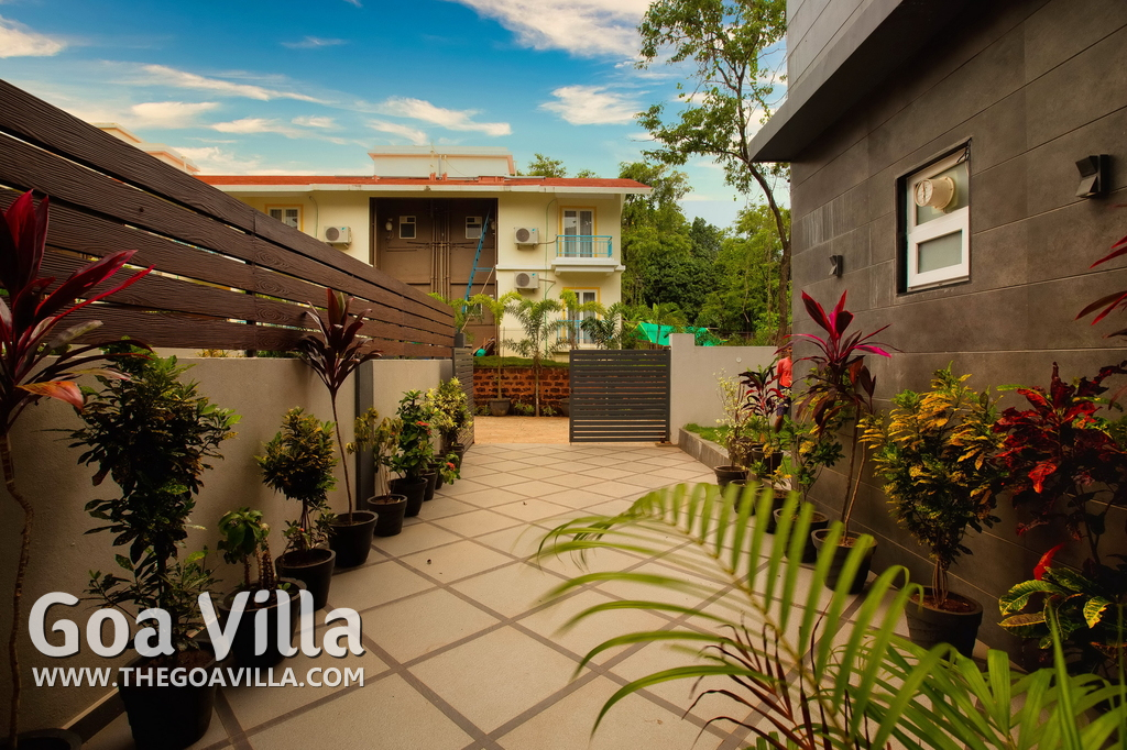 Swimming Pool – As you enter the villa, you will find a beautiful manicured lawn on the left side. The private swimming pool is just behind this. It has a shallow end where the kids can splash around safely while the adults enjoy their time. Potted plants and tall trees surround this area.