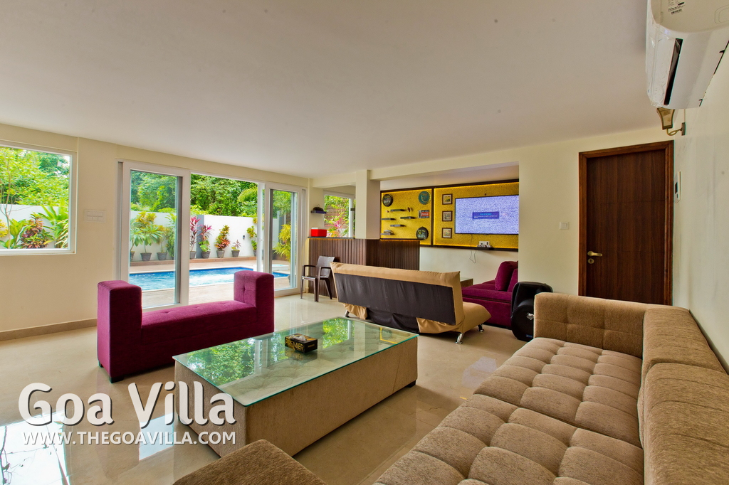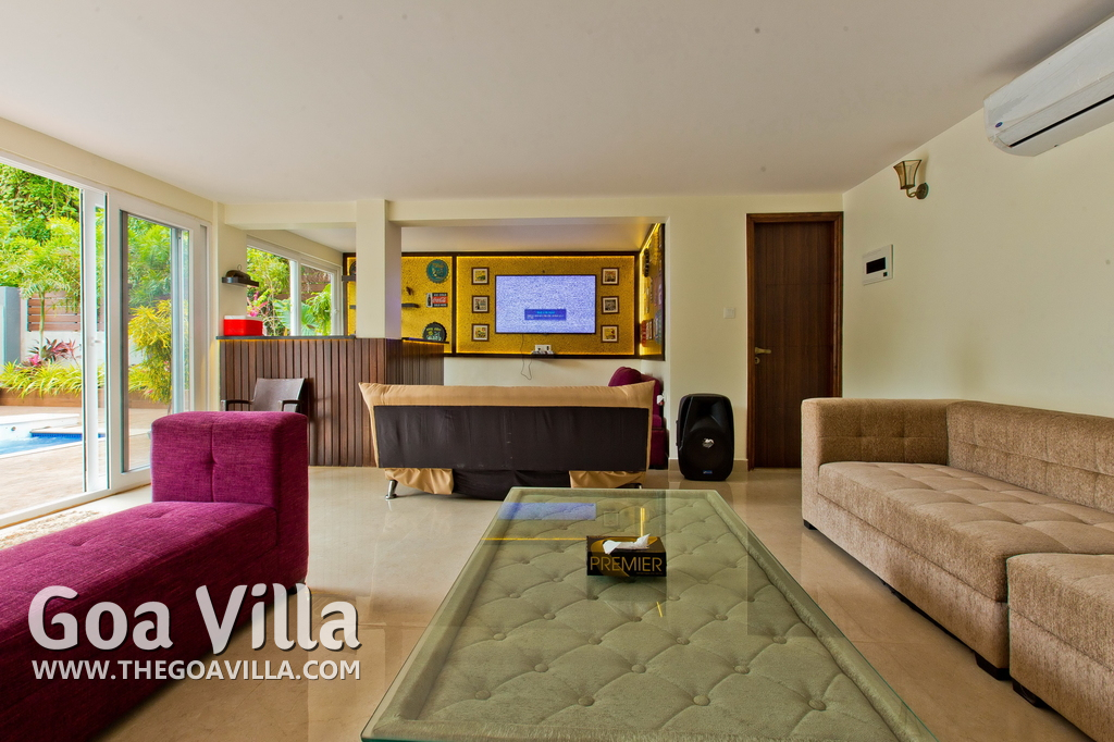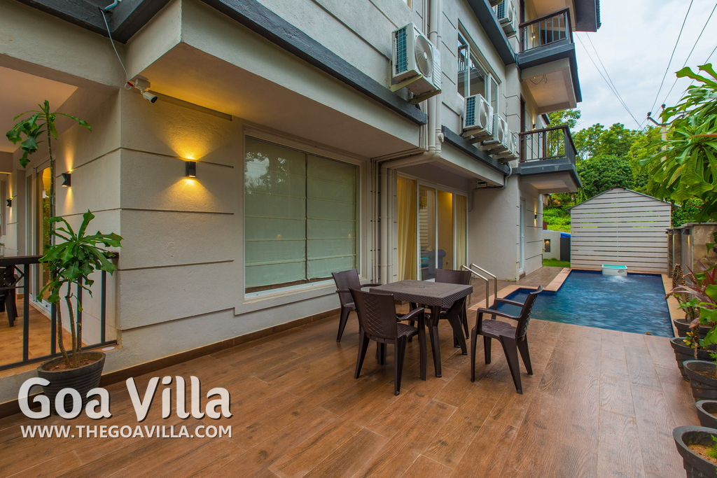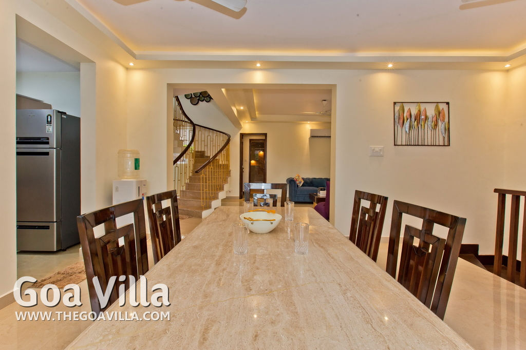 Kitchen, Dining – This North Goa rental property has a well-equipped kitchen where you can cook a meal or you can ask for cooking maid service. There is an oven, chimney, coffee maker, toaster, water purifier, microwave, induction cooker, and a large refrigerator. Utensils, tableware, and glassware are provided. The dining area is between the kitchen and living room. Table with sitting for 6 guests. Outside snack area on the sundeck beside the swimming pool.