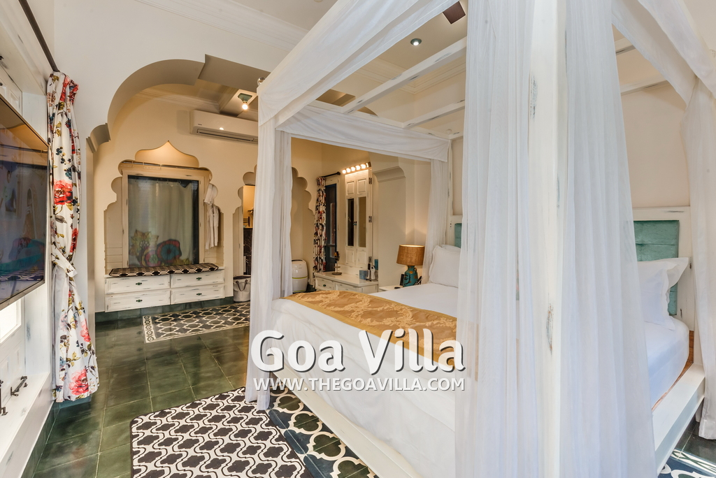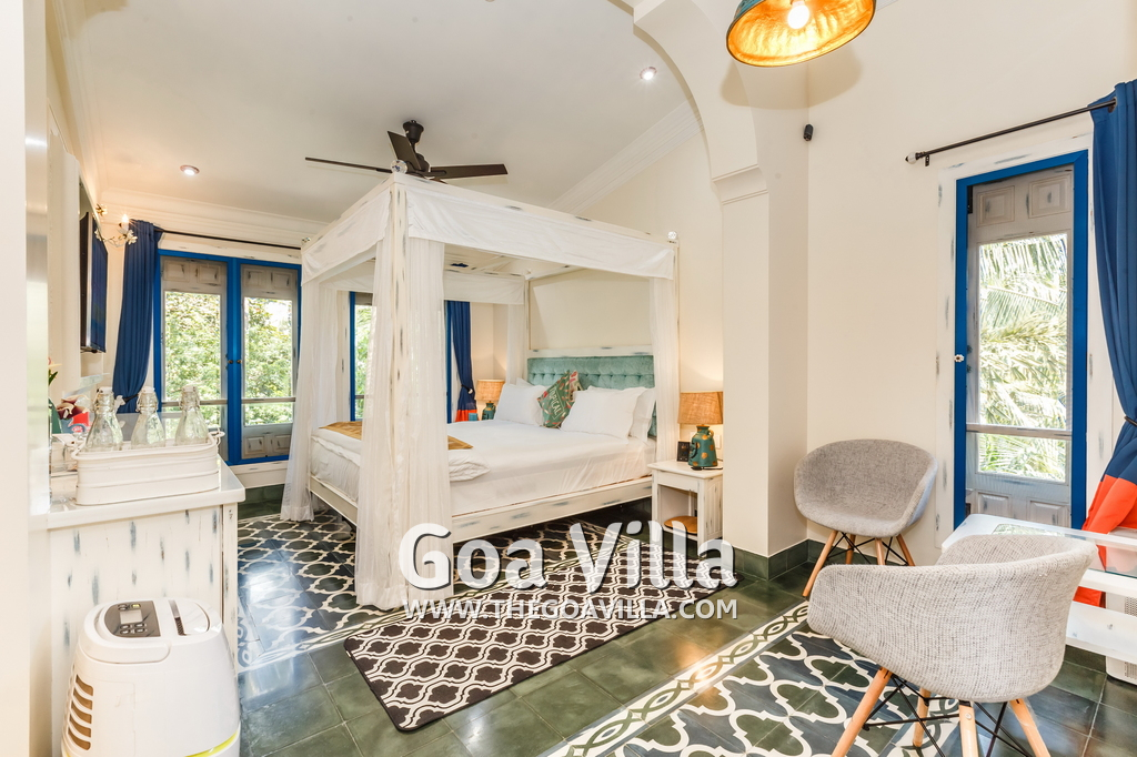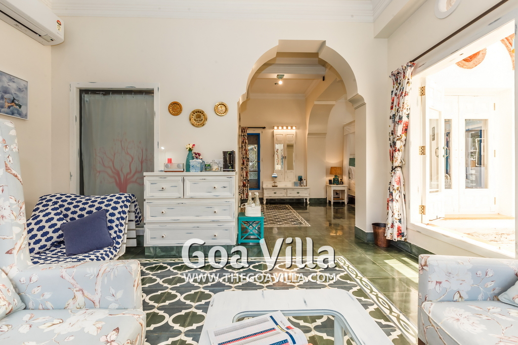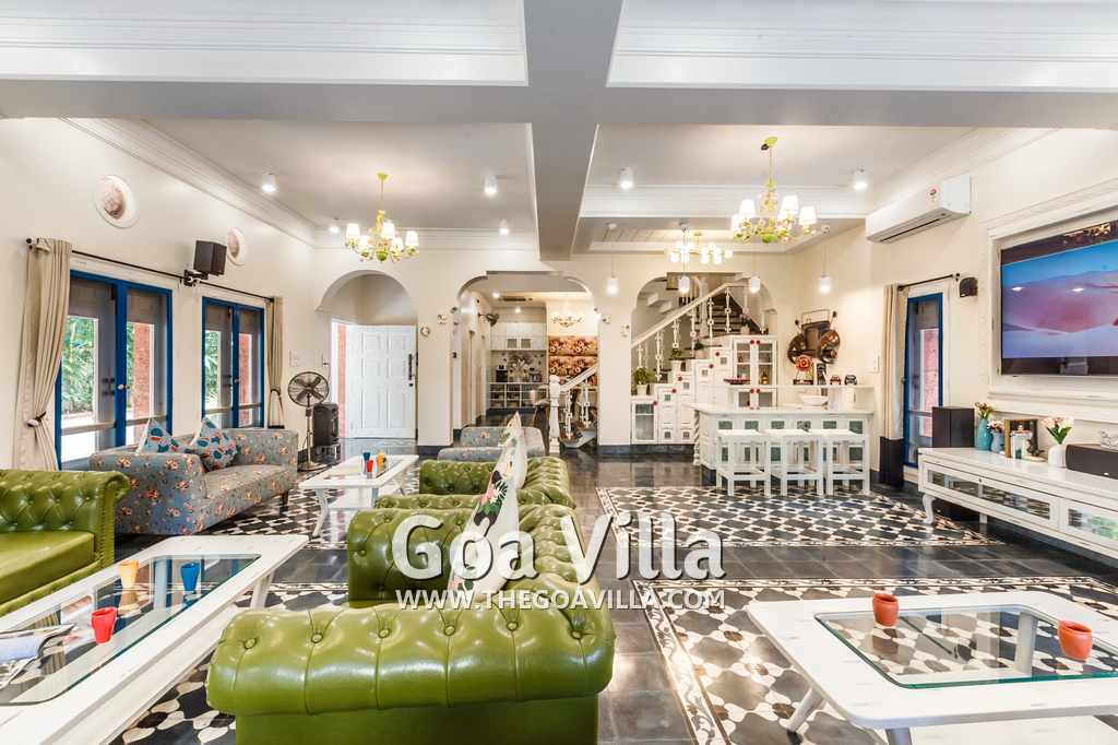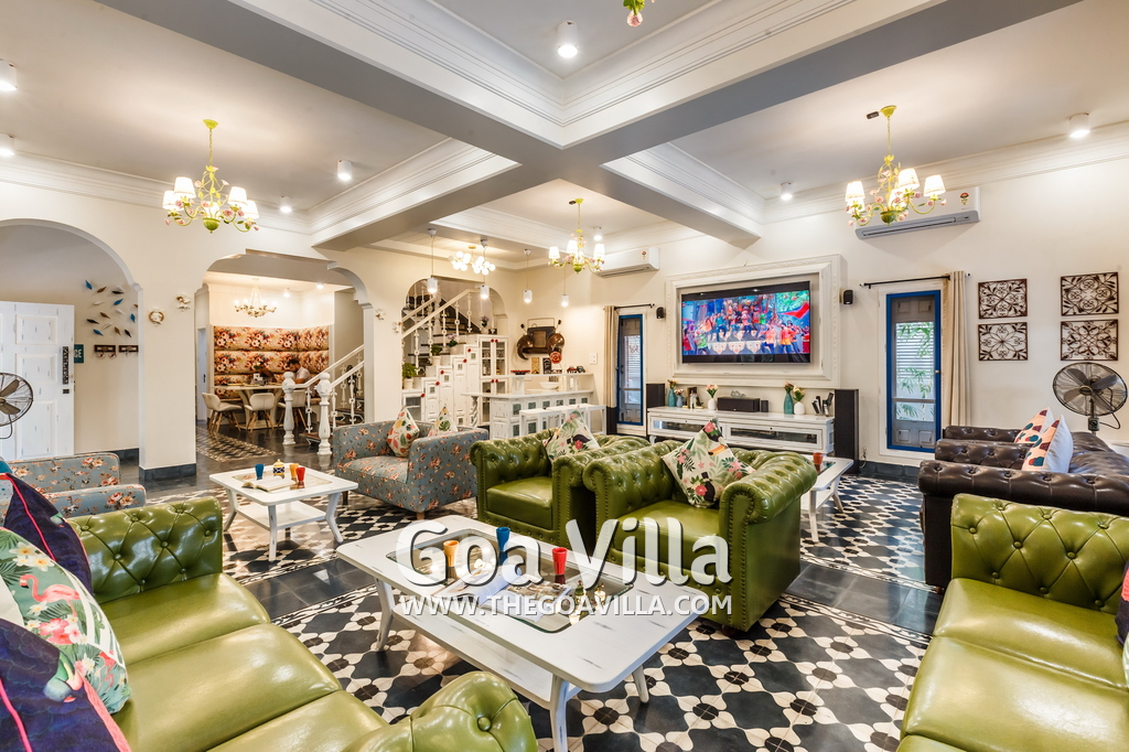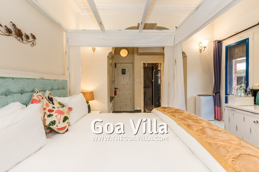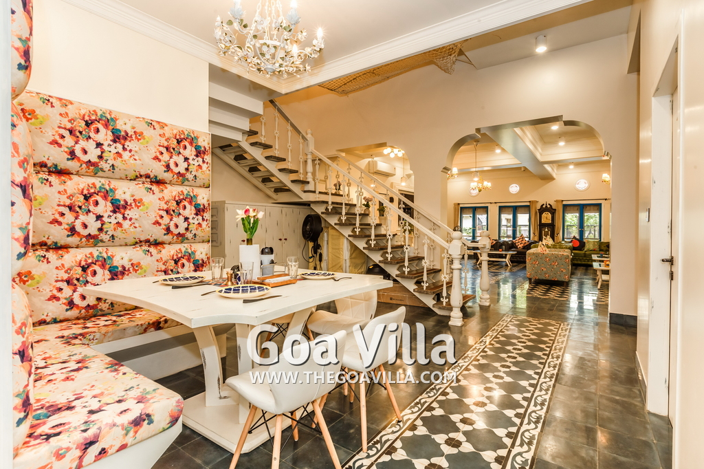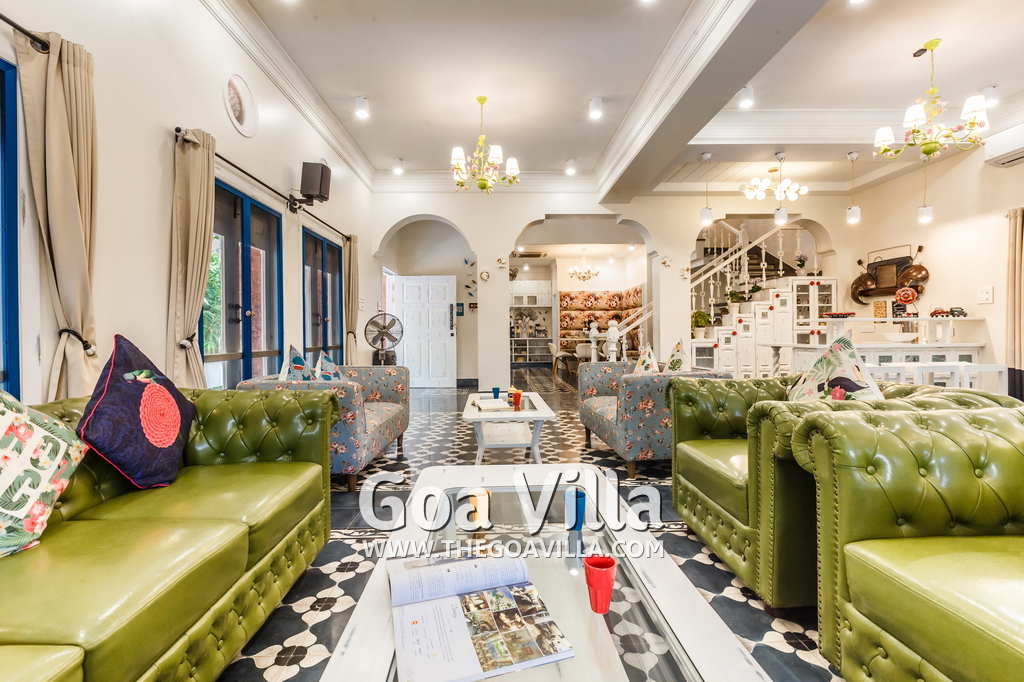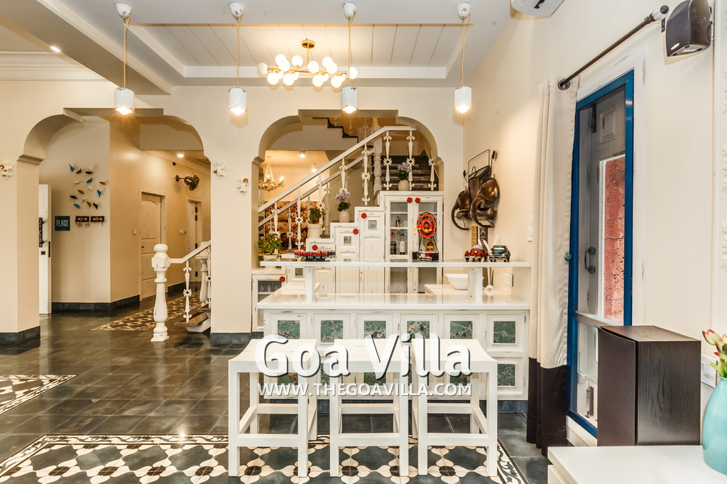 This is a beautiful 5-bedroom boutique property at Candolim in North Goa. It has a traditional Portuguese-Goan architecture and bespoke interiors. Stunning interiors come with many artifacts. Soft colors on the walls and tasteful decorations make this a stunning house for a vacation in Goa. The villa has a fully-equipped bar, kitchen, wine chiller, business center, rooftop terrace, private swimming pool, patio, and garden. It is a great place to stay for a group in a top location in Goa.