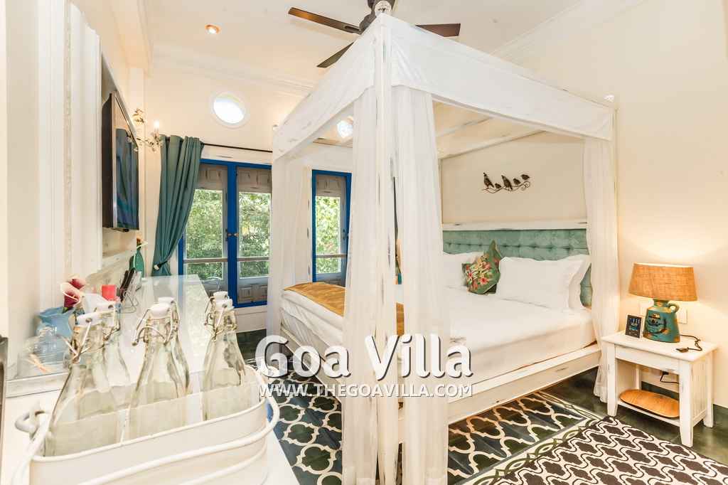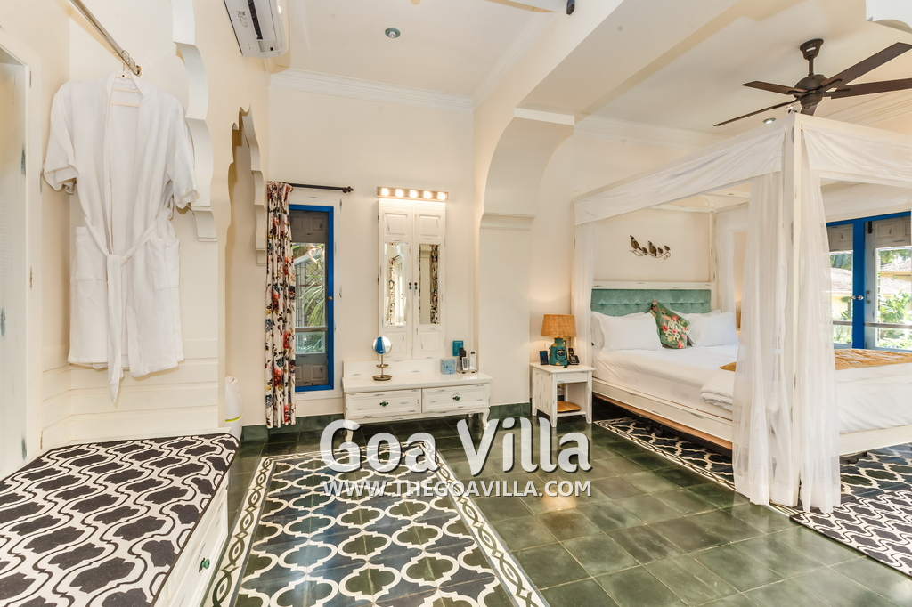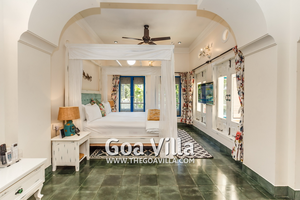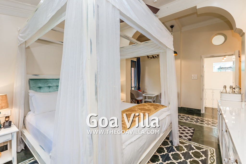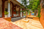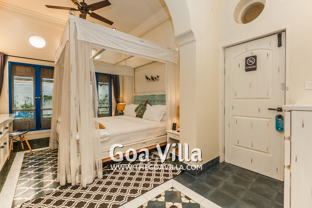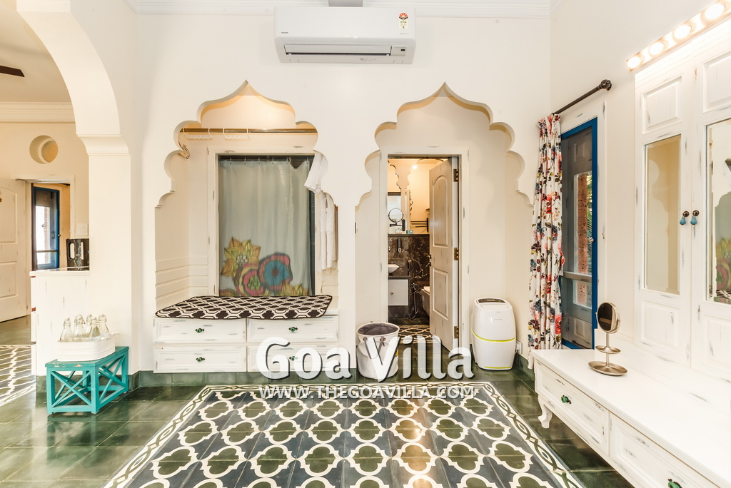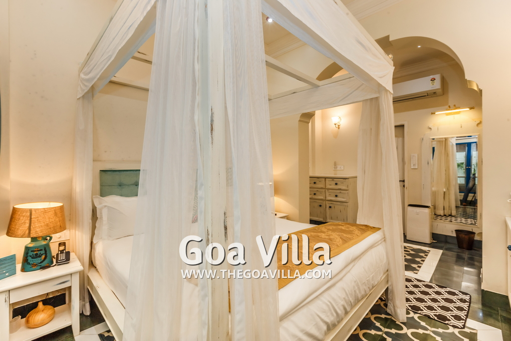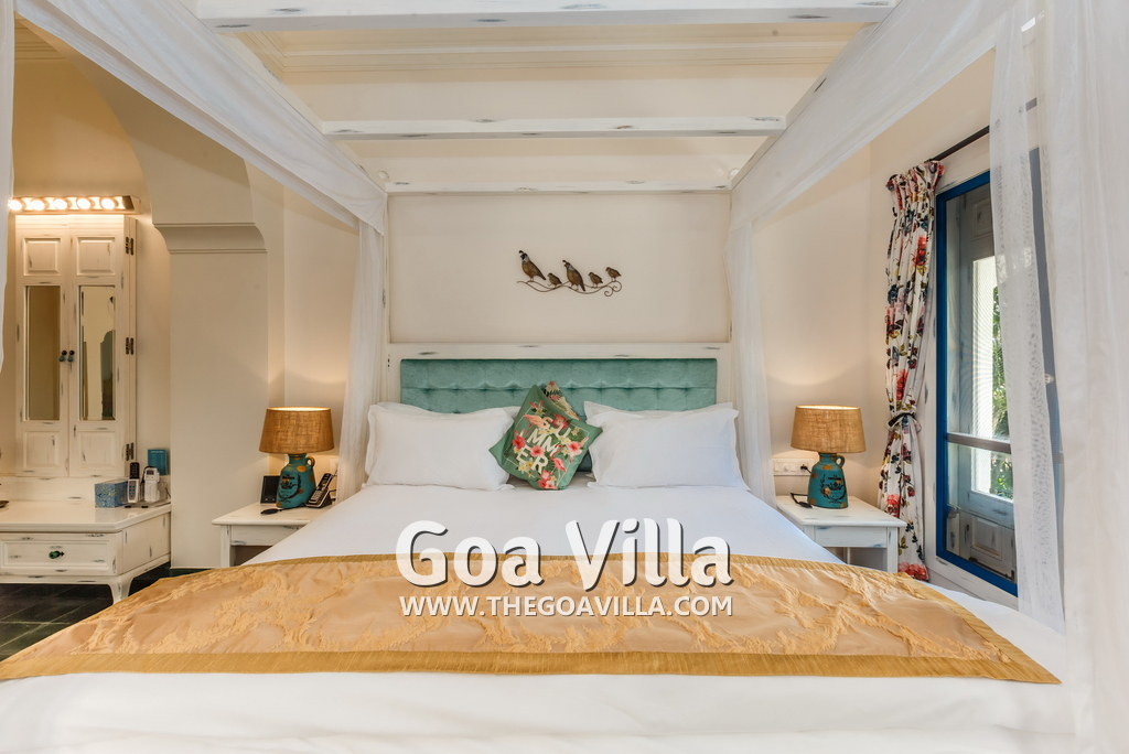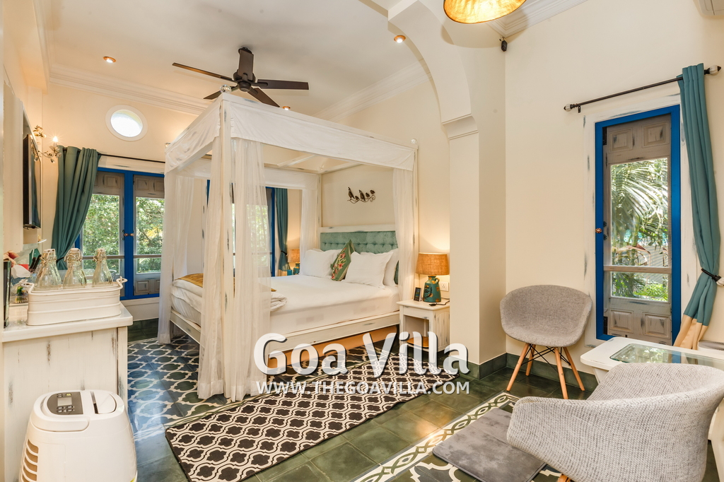 This is a beautiful 5-bedroom boutique property at Candolim in North Goa. It has a traditional Portuguese-Goan architecture and bespoke interiors. Stunning interiors come with many artifacts. Soft colors on the walls and tasteful decorations make this a stunning house for a vacation in Goa. The villa has a fully-equipped bar, kitchen, wine chiller, business center, rooftop terrace, private swimming pool, patio, and garden. It is a great place to stay for a group in a top location in Goa.