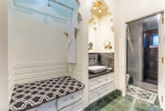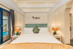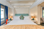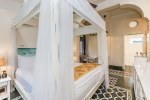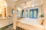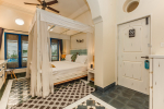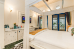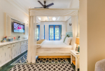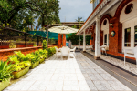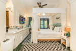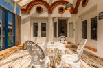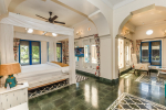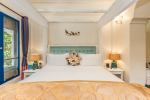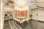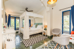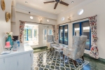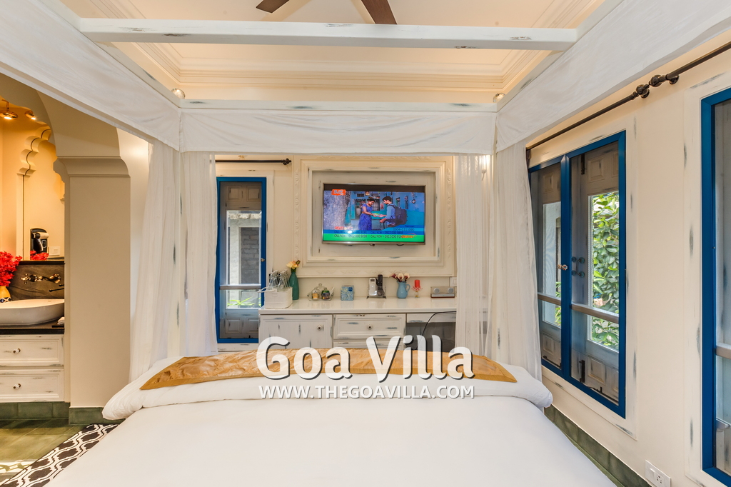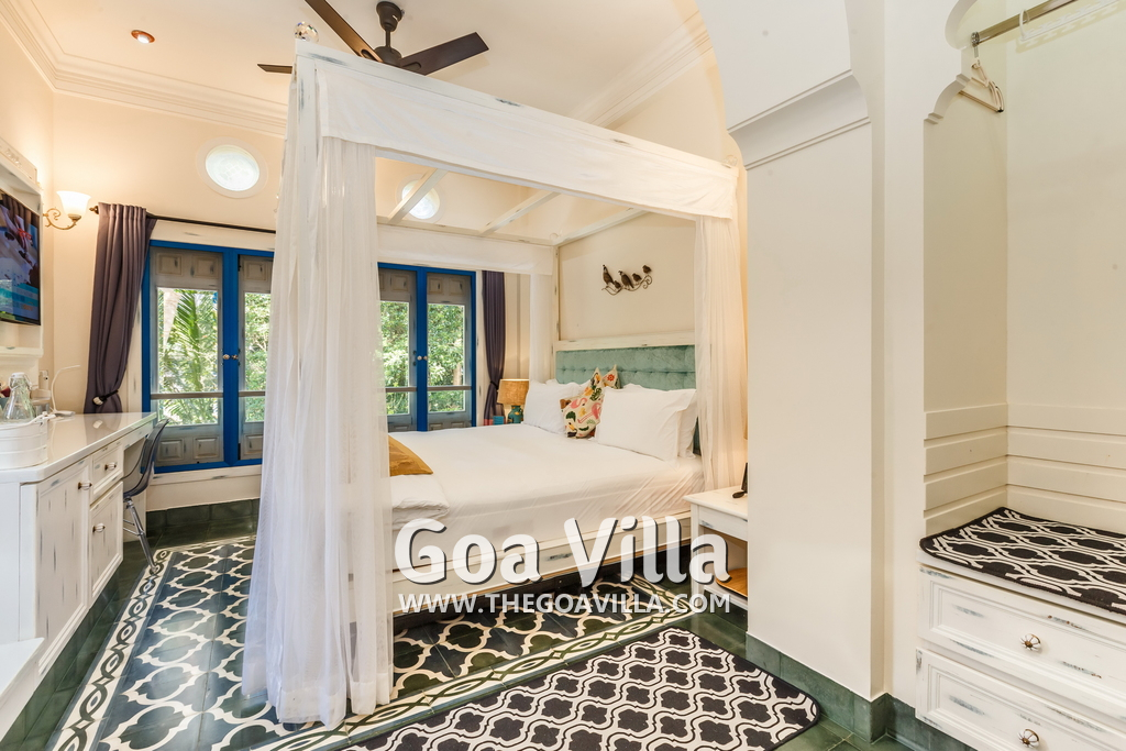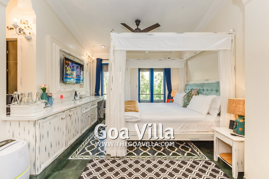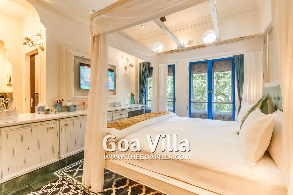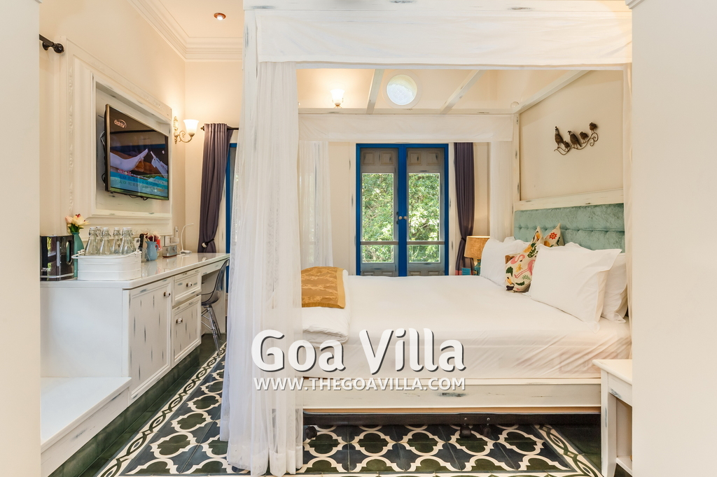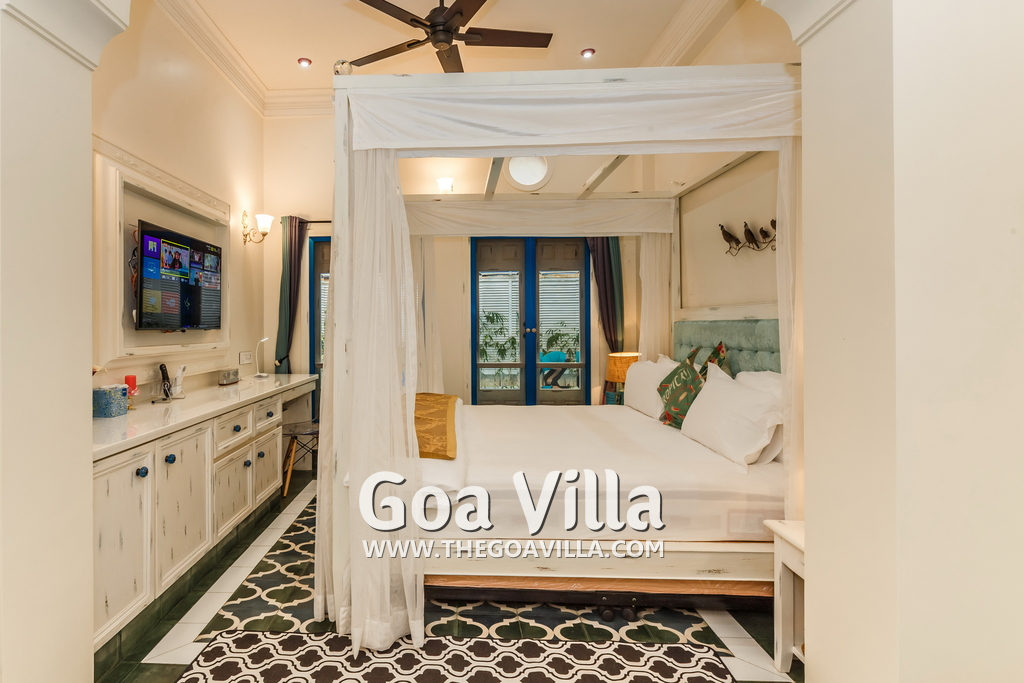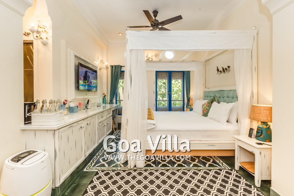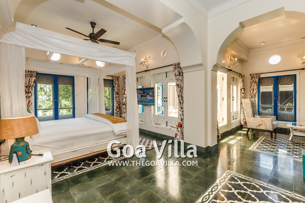 This is a beautiful 5-bedroom boutique property at Candolim in North Goa. It has a traditional Portuguese-Goan architecture and bespoke interiors. Stunning interiors come with many artifacts. Soft colors on the walls and tasteful decorations make this a stunning house for a vacation in Goa. The villa has a fully-equipped bar, kitchen, wine chiller, business center, rooftop terrace, private swimming pool, patio, and garden. It is a great place to stay for a group in a top location in Goa.