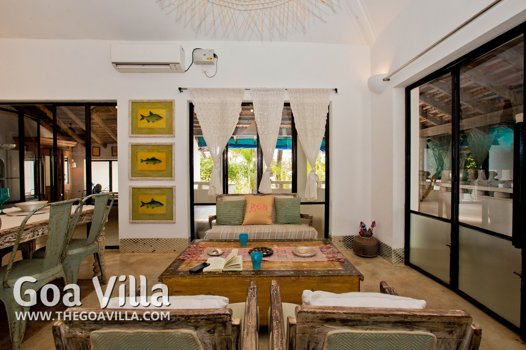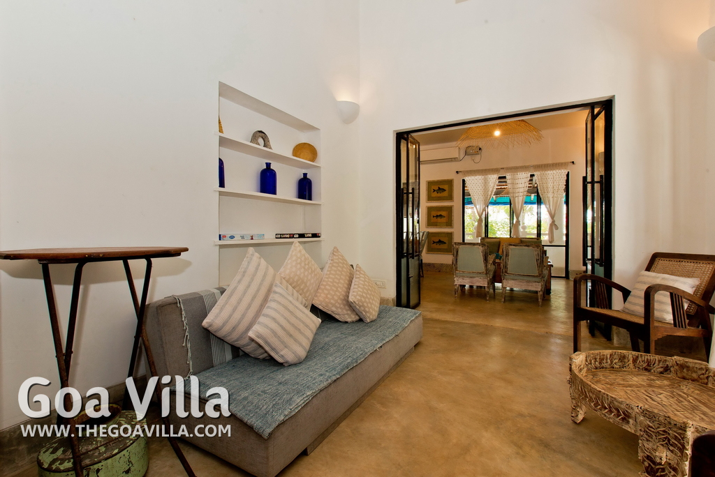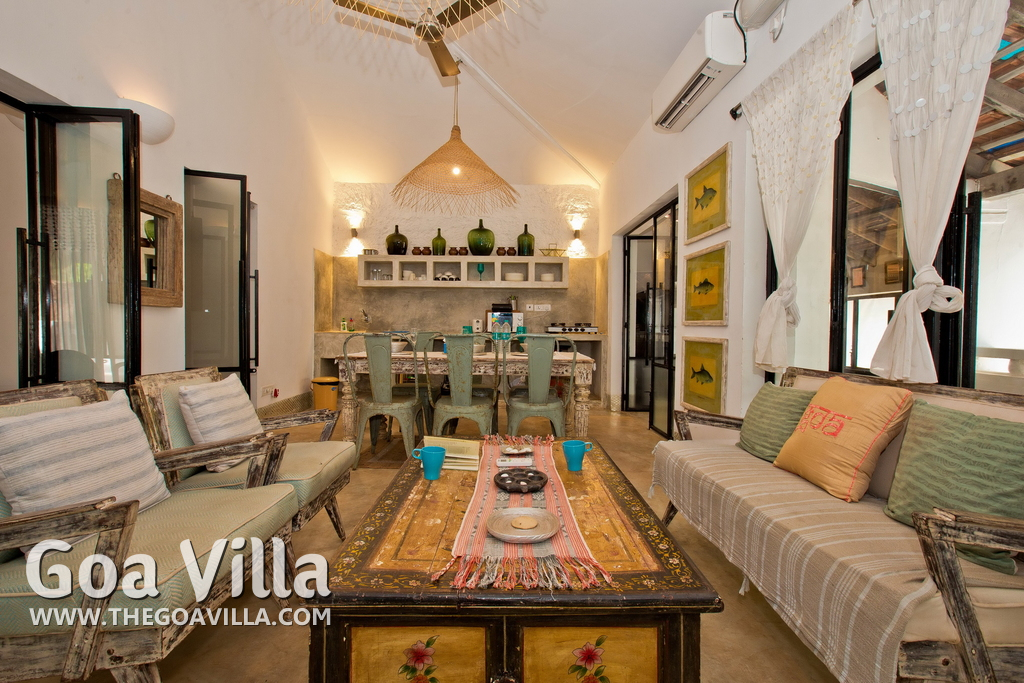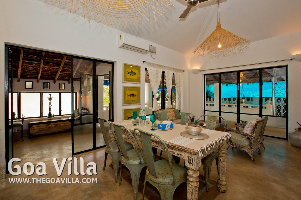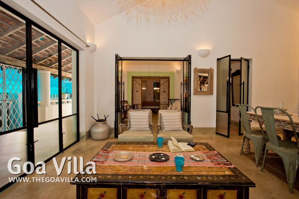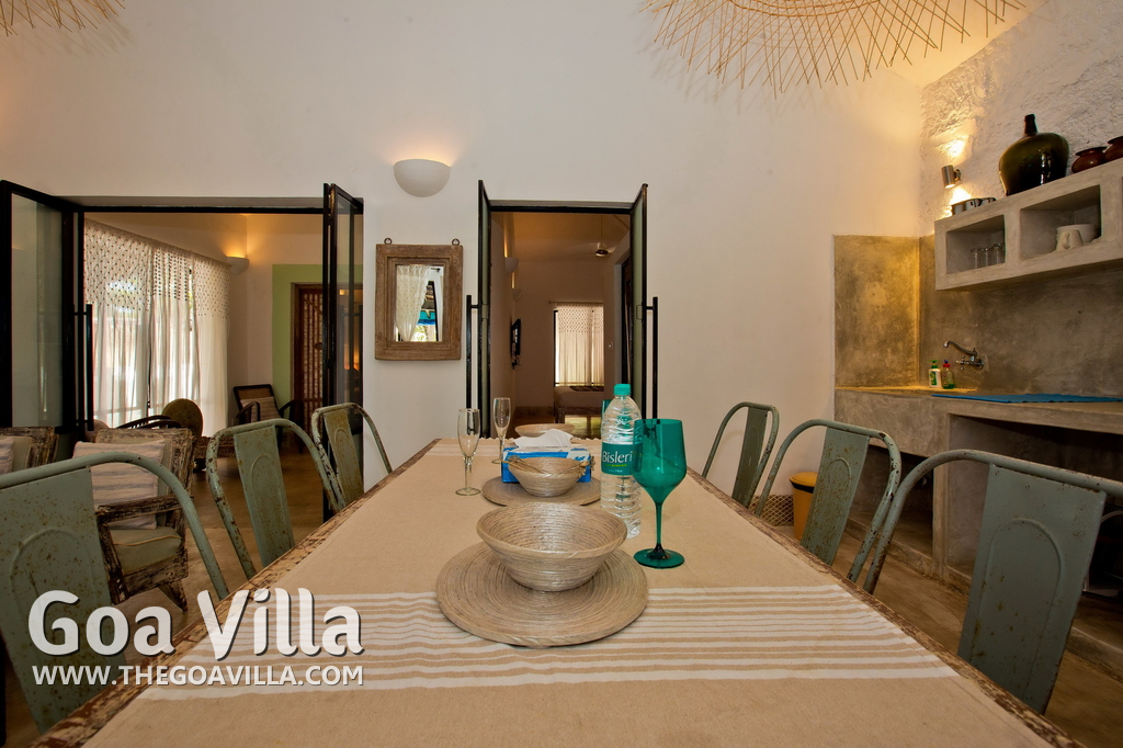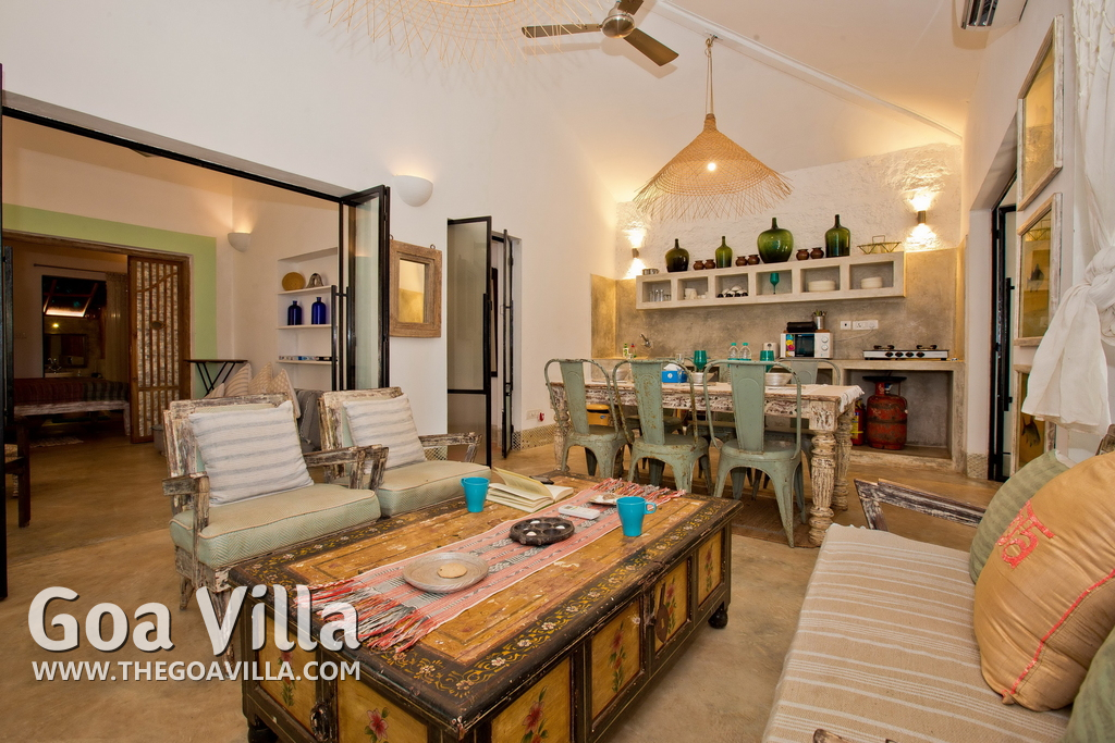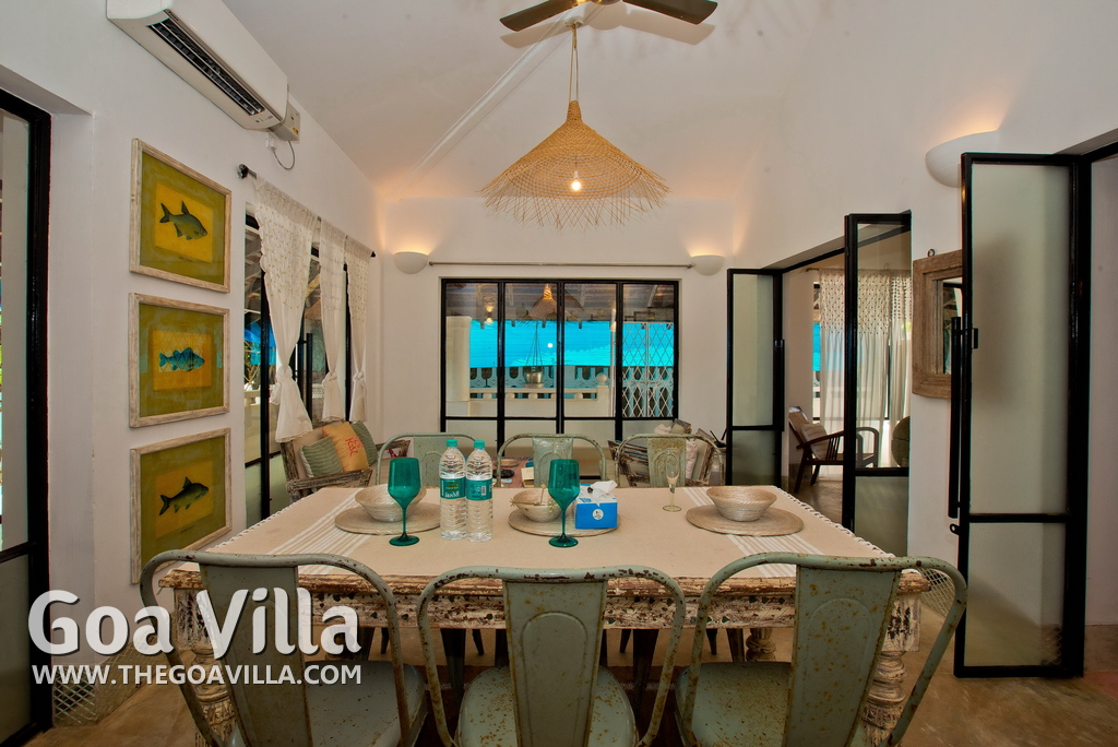 Living Room – This North Goa private villa has an open-plan living and dining area. The rustic furniture here transports the guests to another era. There are sofas with adequate sitting area for the entire group, a rustic coffee table, beautiful paintings, and potted plants. Two sides of the room have large glass doors. This room too is air-conditioned. High ceiling also keeps the heat away.