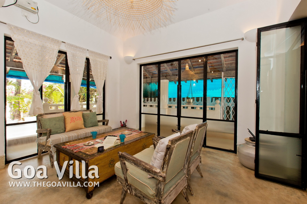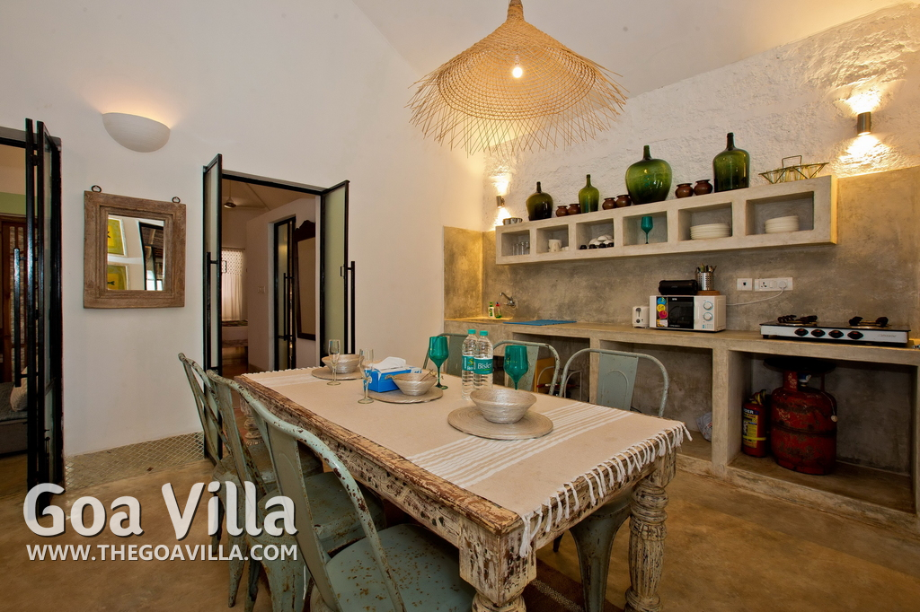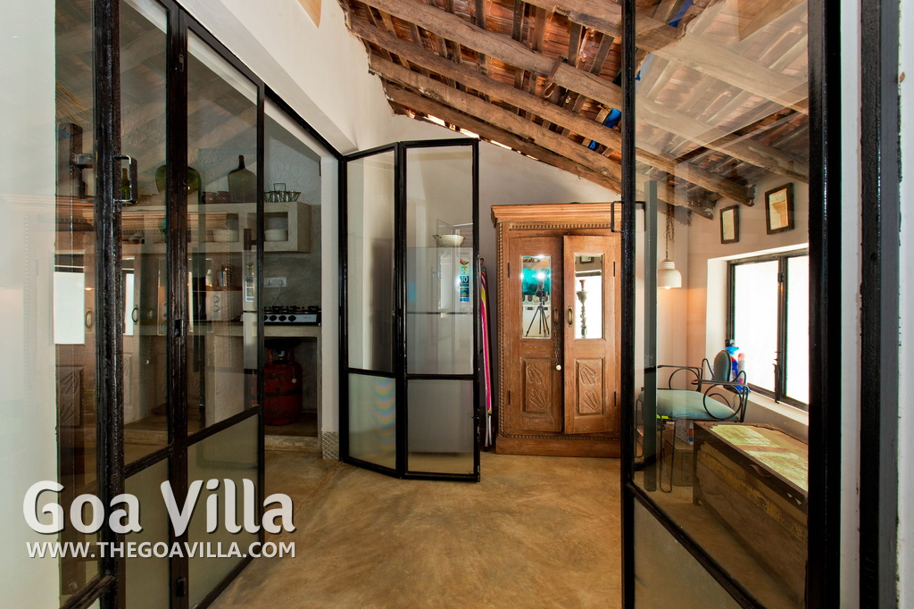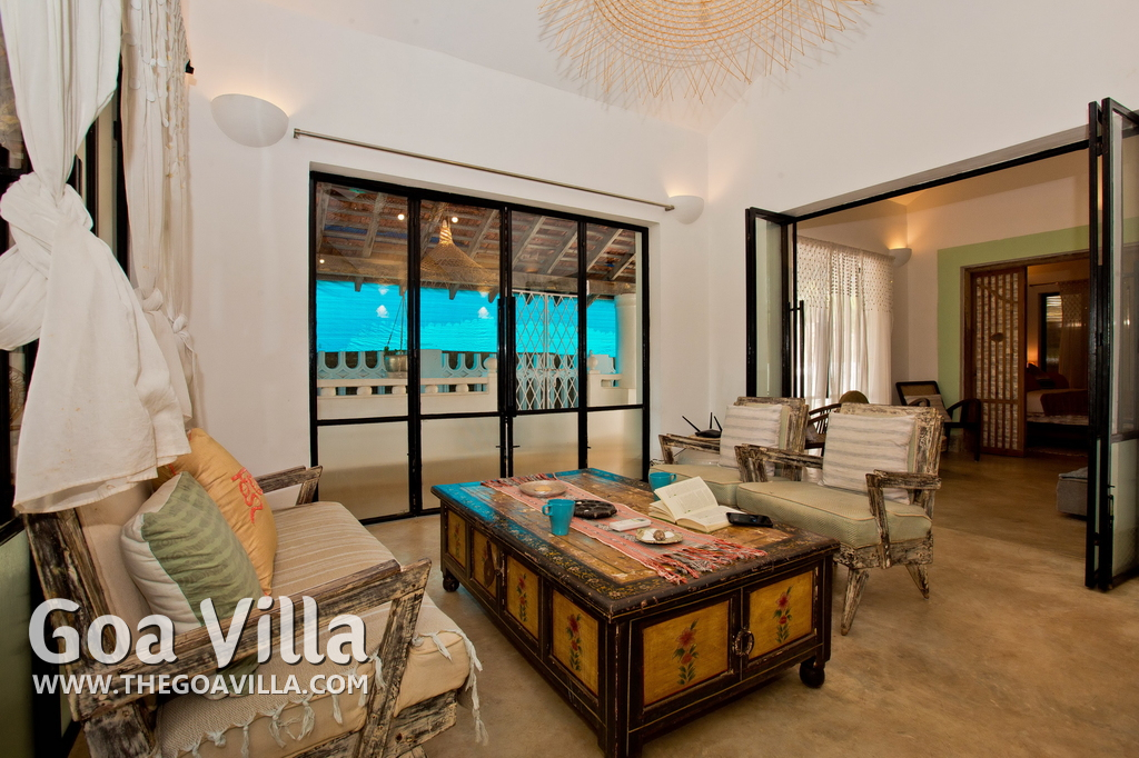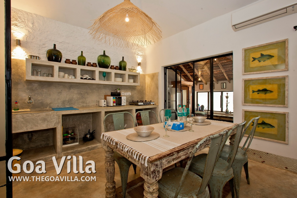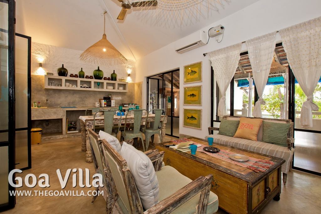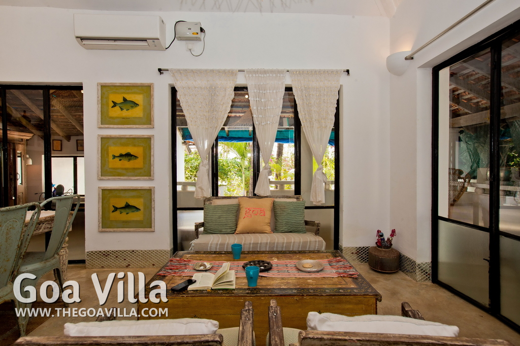 Living Room – This North Goa private villa has an open-plan living and dining area. The rustic furniture here transports the guests to another era. There are sofas with adequate sitting area for the entire group, a rustic coffee table, beautiful paintings, and potted plants. Two sides of the room have large glass doors. This room too is air-conditioned. High ceiling also keeps the heat away.