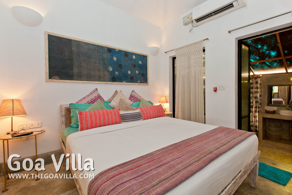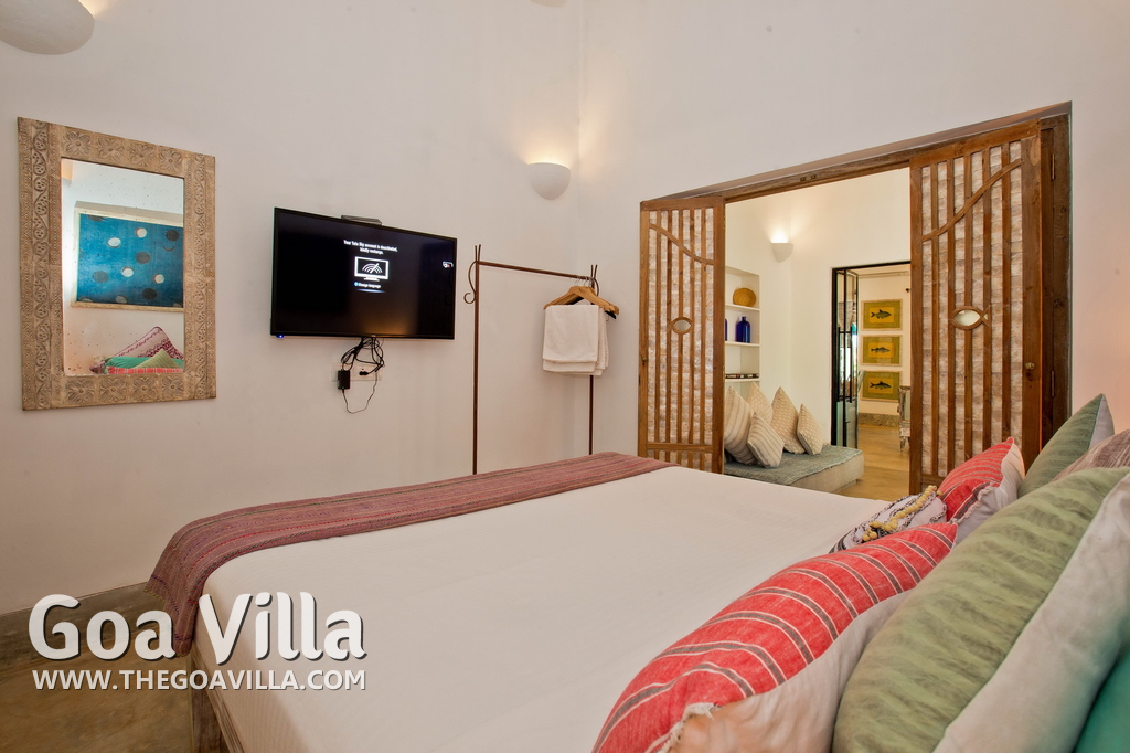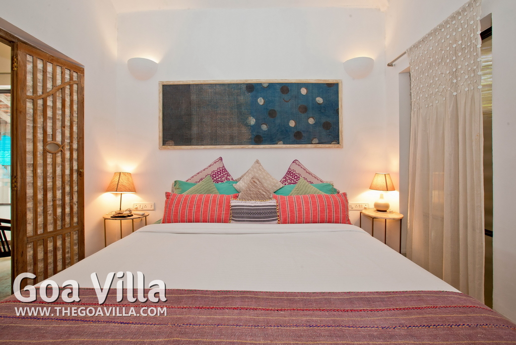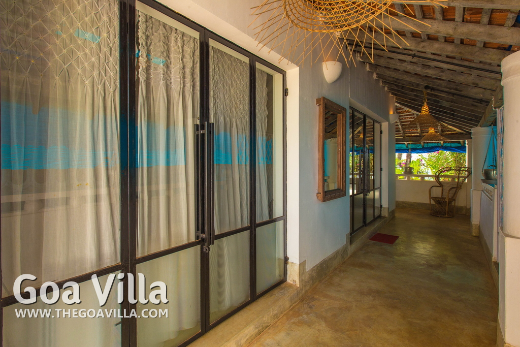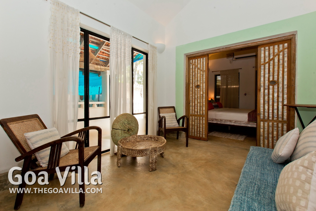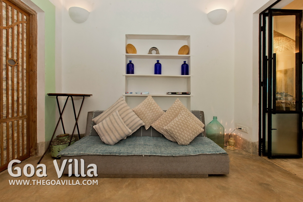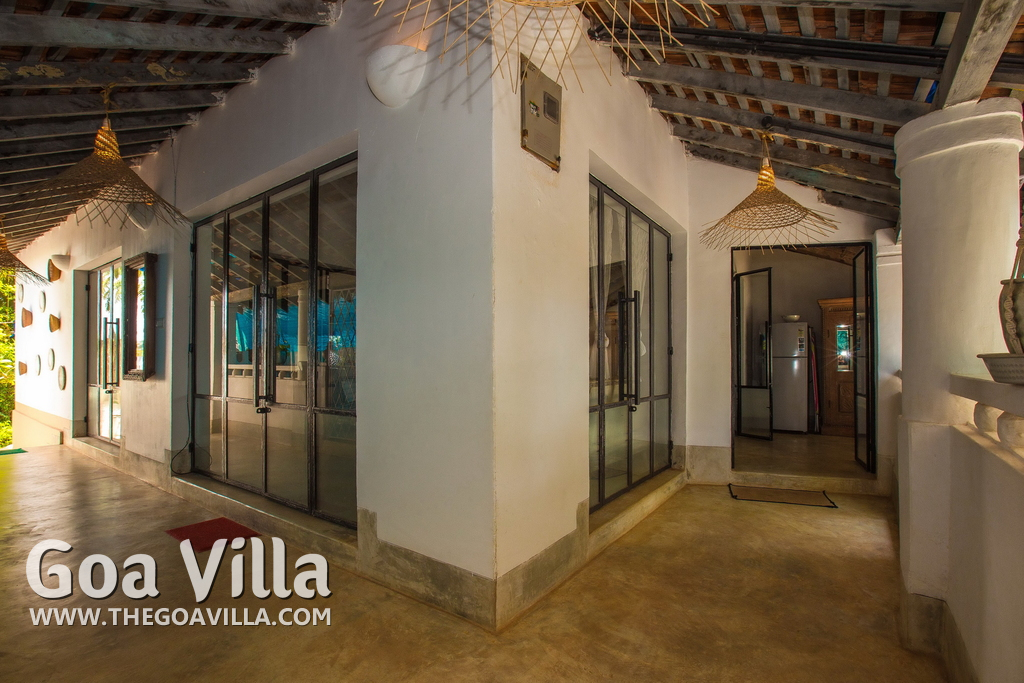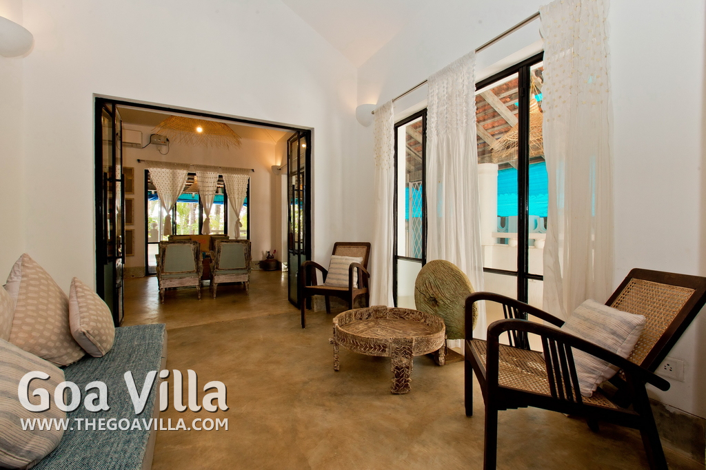 Living Room – This North Goa private villa has an open-plan living and dining area. The rustic furniture here transports the guests to another era. There are sofas with adequate sitting area for the entire group, a rustic coffee table, beautiful paintings, and potted plants. Two sides of the room have large glass doors. This room too is air-conditioned. High ceiling also keeps the heat away.