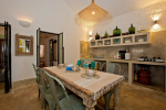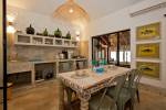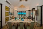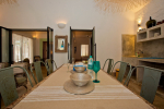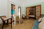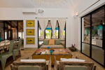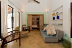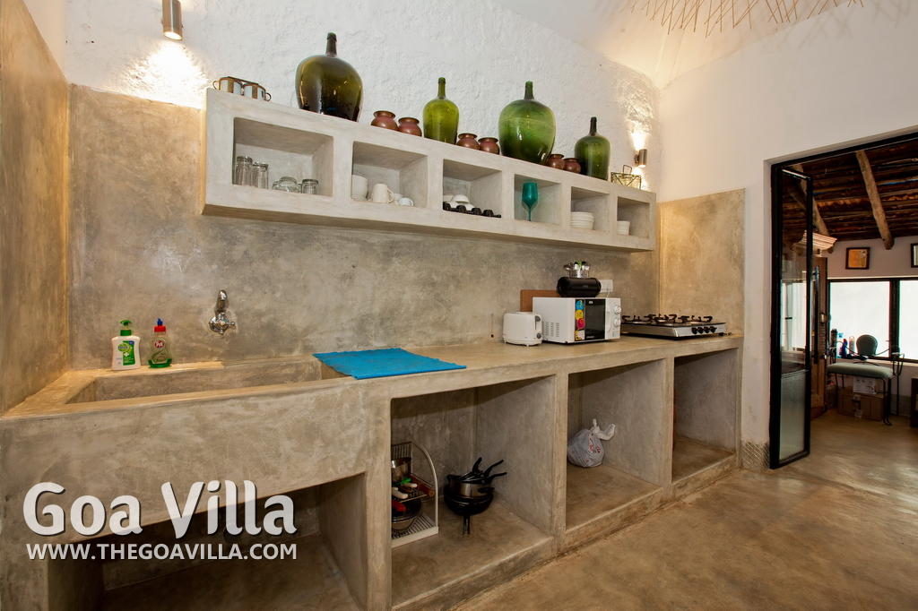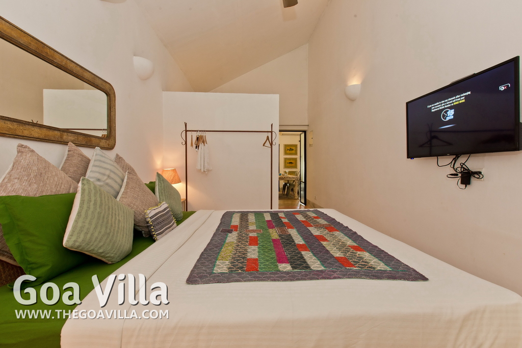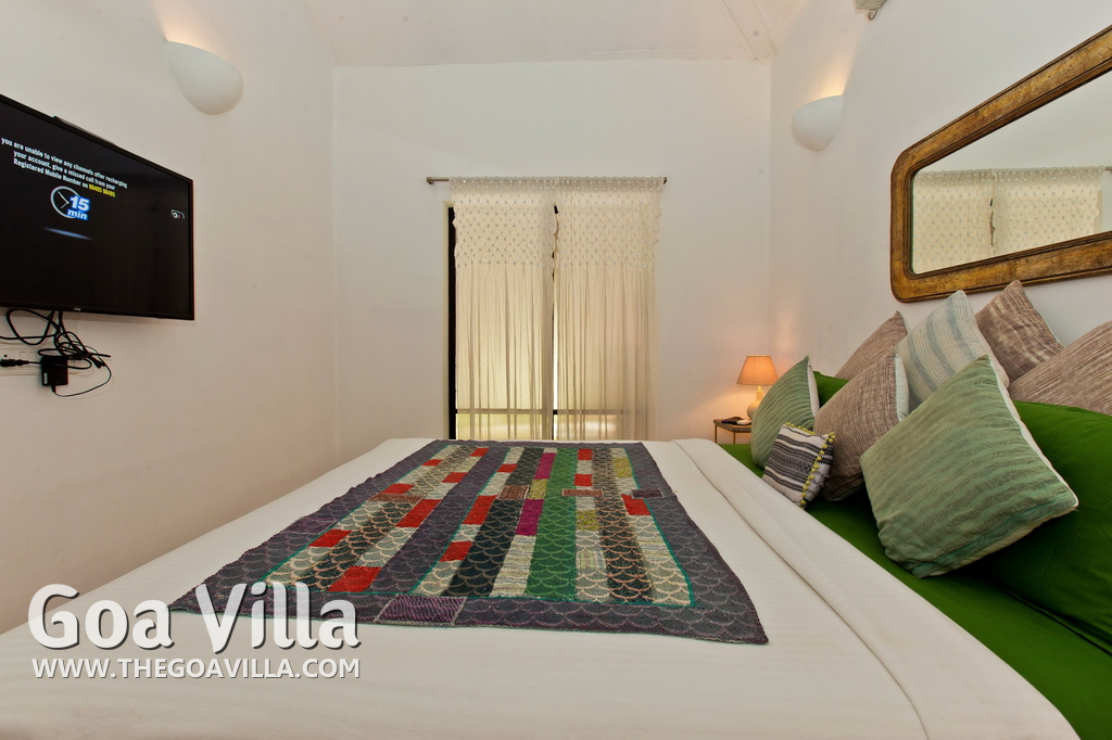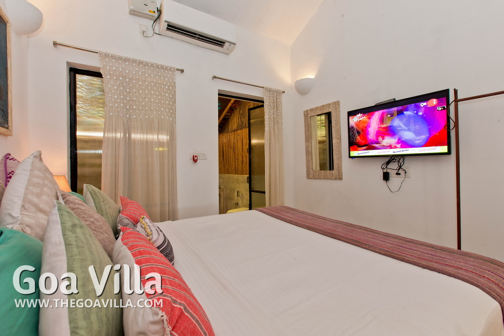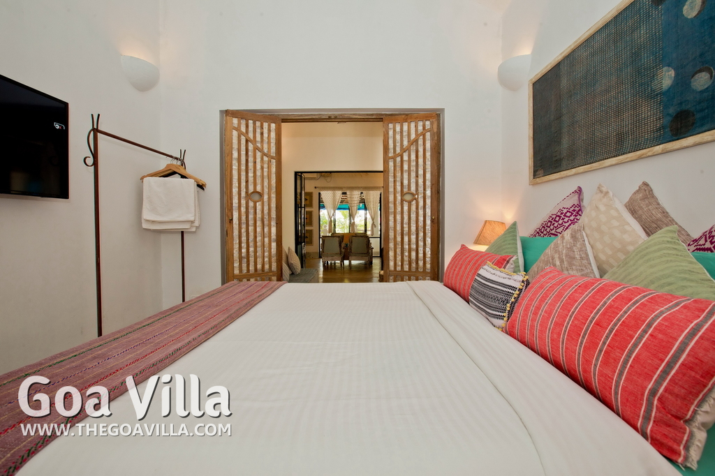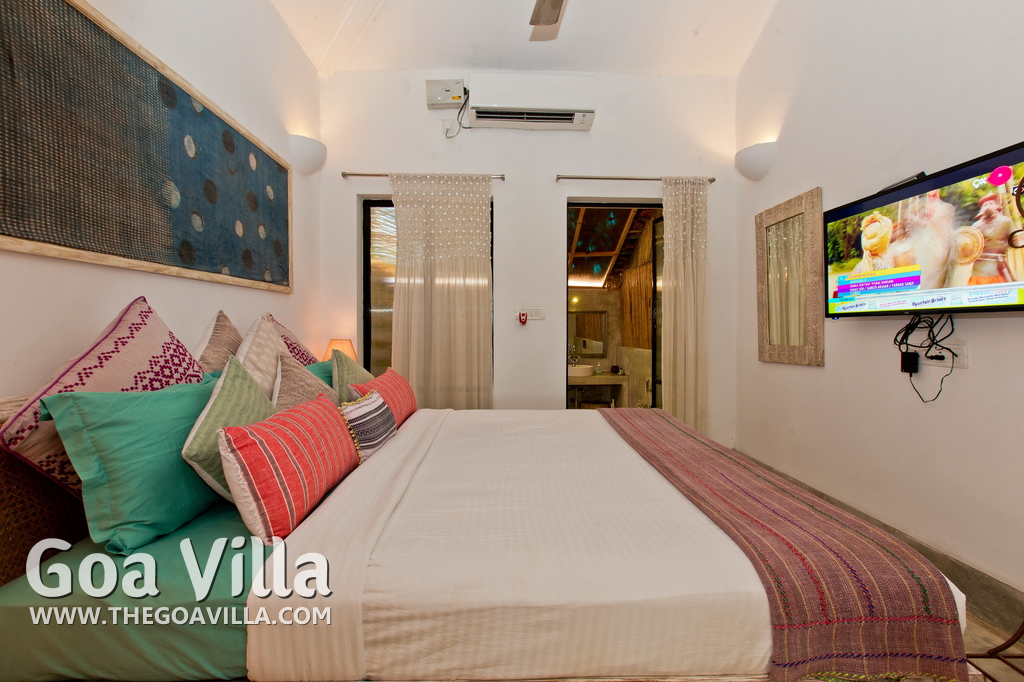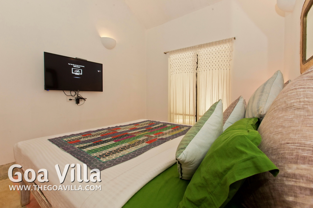Living Room – This North Goa private villa has an open-plan living and dining area. The rustic furniture here transports the guests to another era. There are sofas with adequate sitting area for the entire group, a rustic coffee table, beautiful paintings, and potted plants. Two sides of the room have large glass doors. This room too is air-conditioned. High ceiling also keeps the heat away.