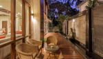 Swimming Pool – The outside of this North Goa holiday villa is serene and beautiful, thanks to the many tall trees. The private swimming pool is surrounded by a small garden too. It has a few fountains, which the kids are sure to love. The entire area is decorated with East Asian sculptures. There are two lounging spaces – one in the side of the pool and a second in a small courtyard. They have both been designed very aesthetically.