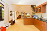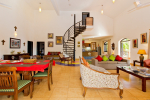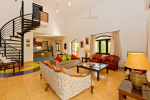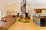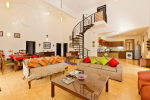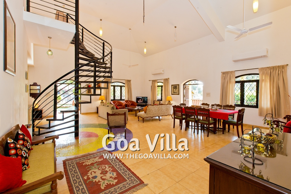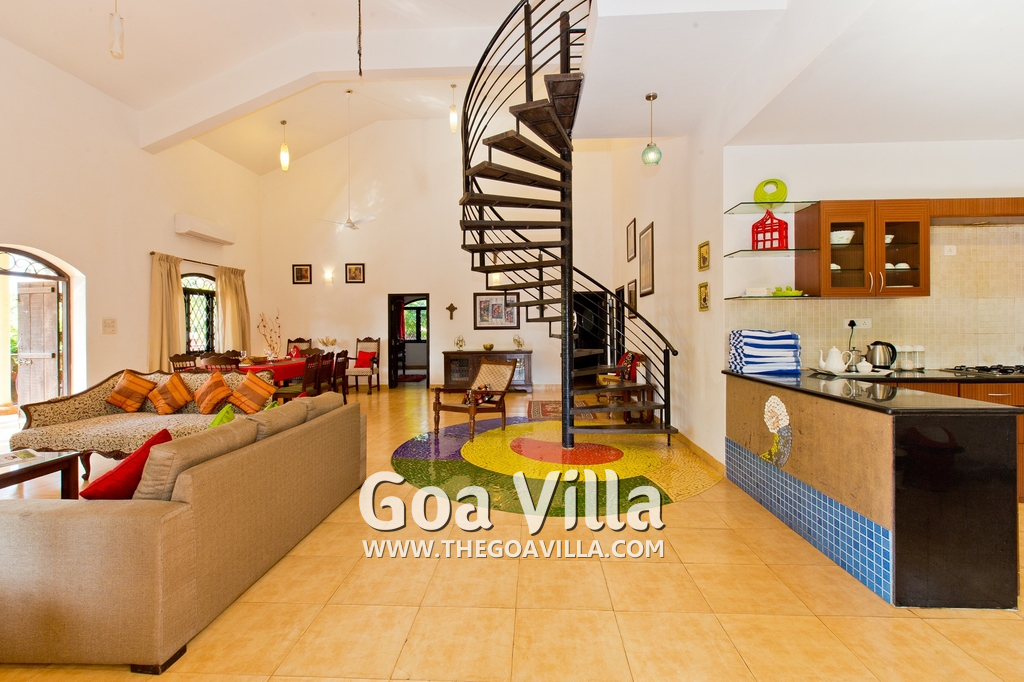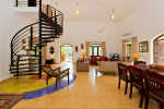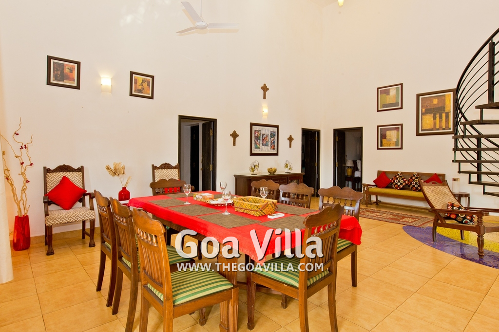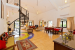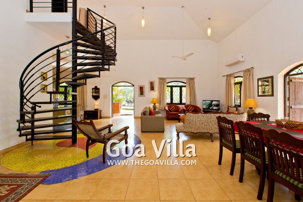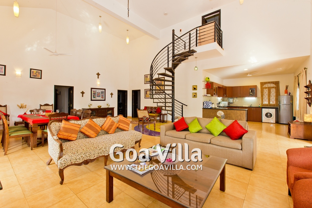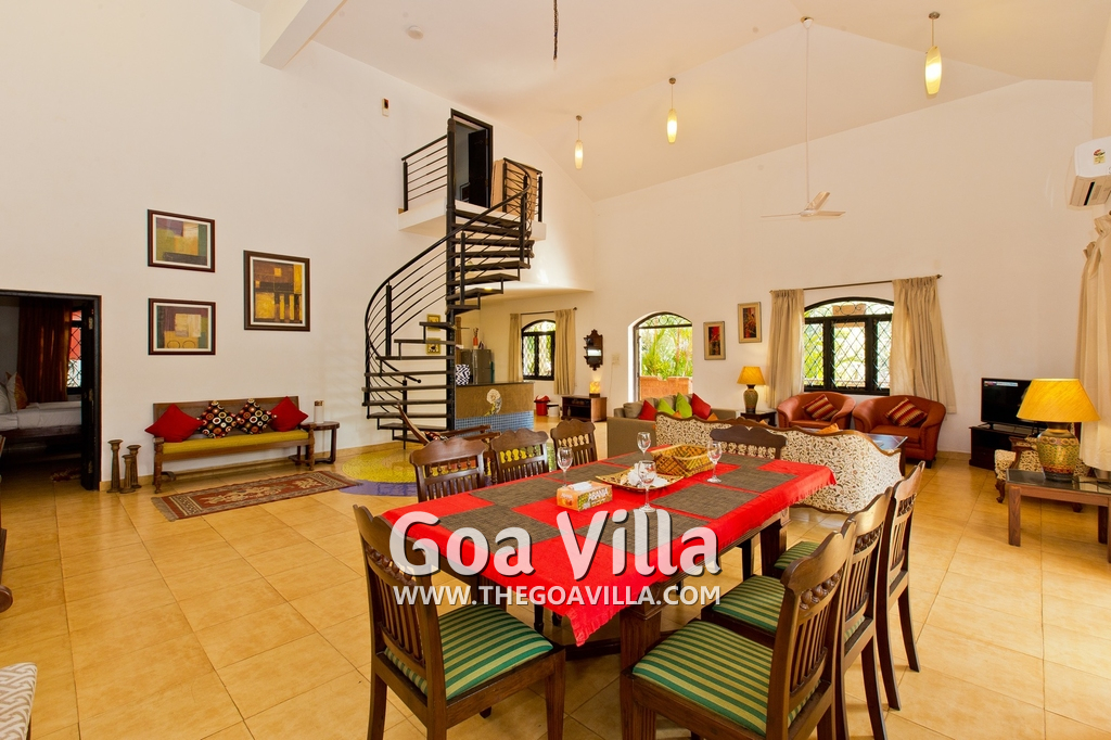 Living Room – The open-plan living, dining, and kitchen area is unique in design. This huge space has an atrium and a frangipani tree. Wrought iron and wood spiral staircase leads to the first floor from the center. Large comfortable sofa with a glass-top center table, beautiful lamp shades, and paintings beauty this room. There is a DVD player and satellite television.