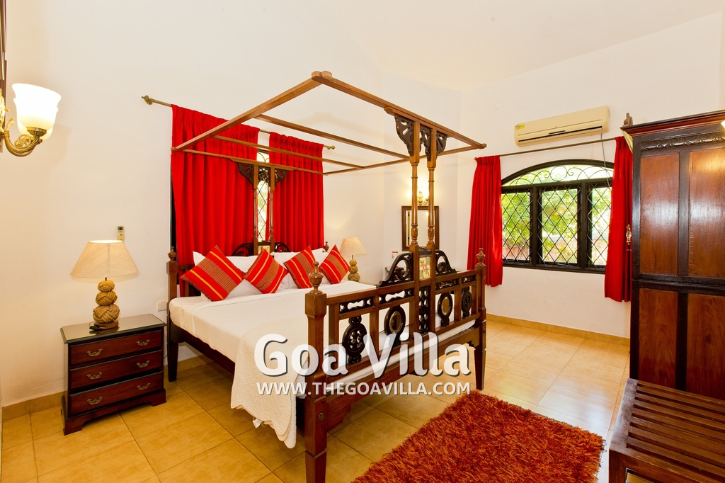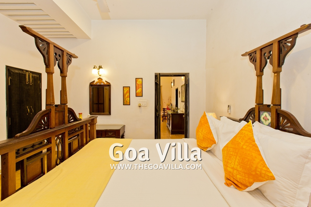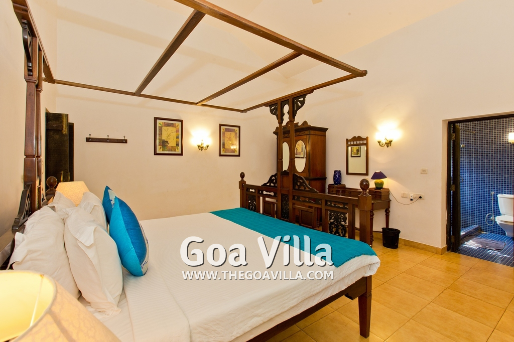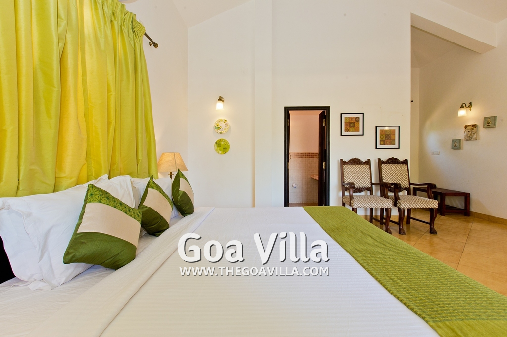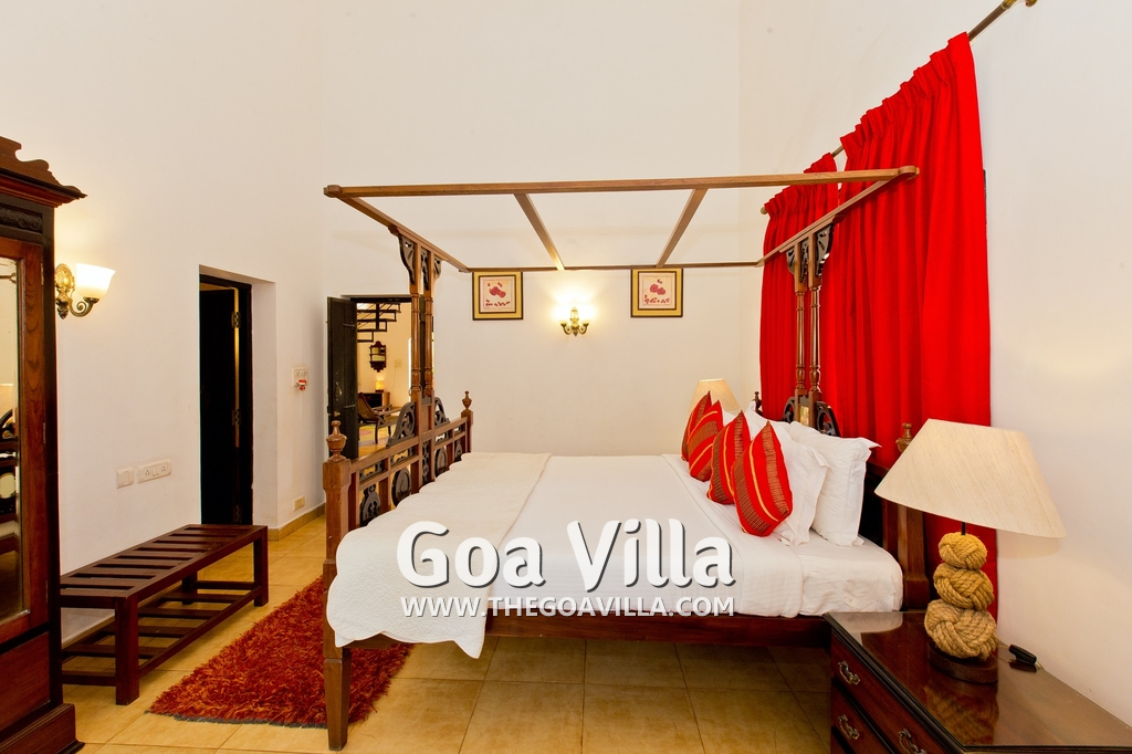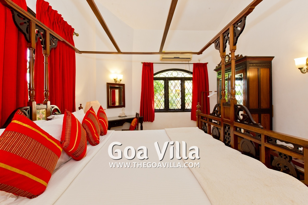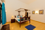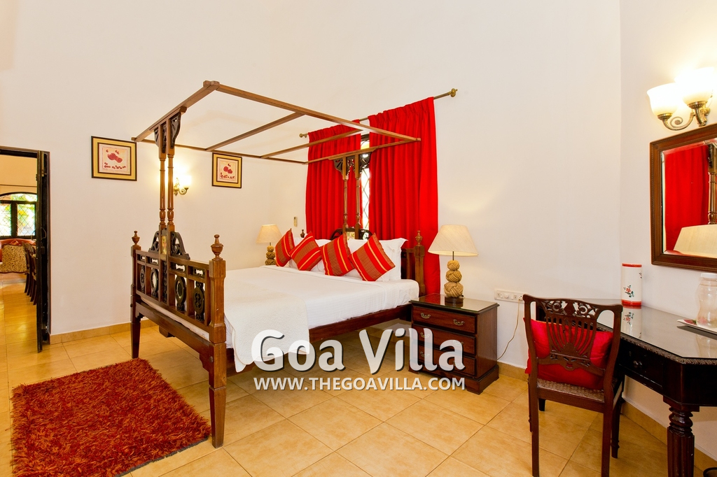 Bedrooms – The villa has 4 bedrooms, all en-suite and air-conditioned. 2 bedrooms are on the ground floor. 1st floor has the master bedroom. The master bedroom is bigger in size and opens to a wide balcony with a comfortable sitting area. They all have unique color themes – bright red, peacock blue, and two shades of yellow. Antique furniture with a large King-size bed, extra cushions, wardrobe, side table, lamp shade, mattress, and paintings on the wall.