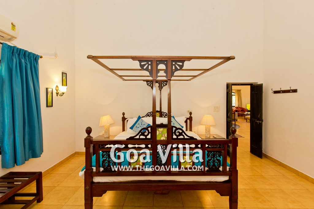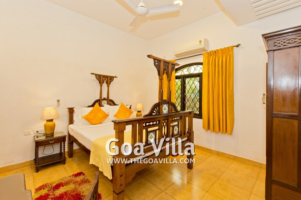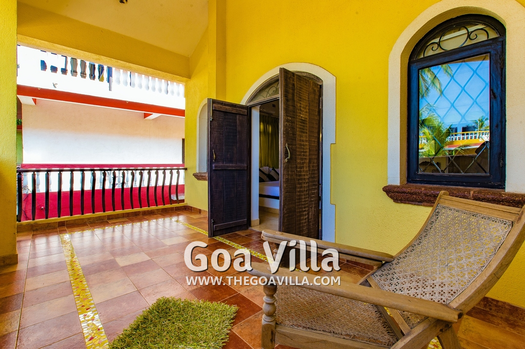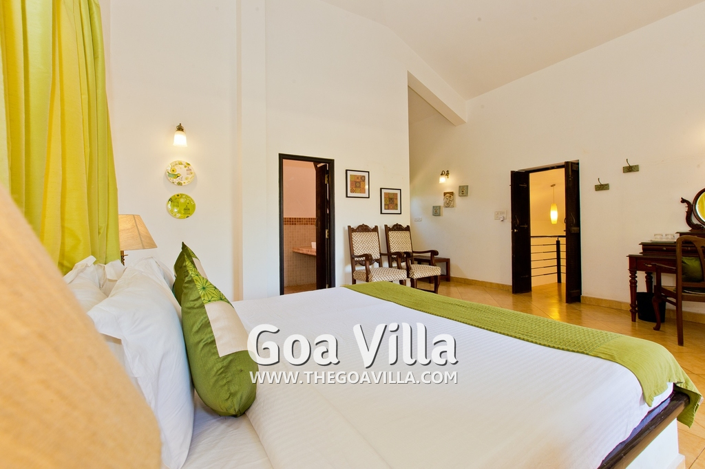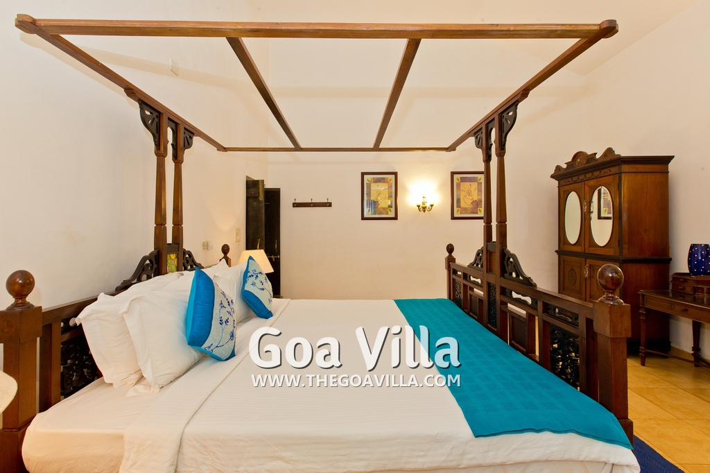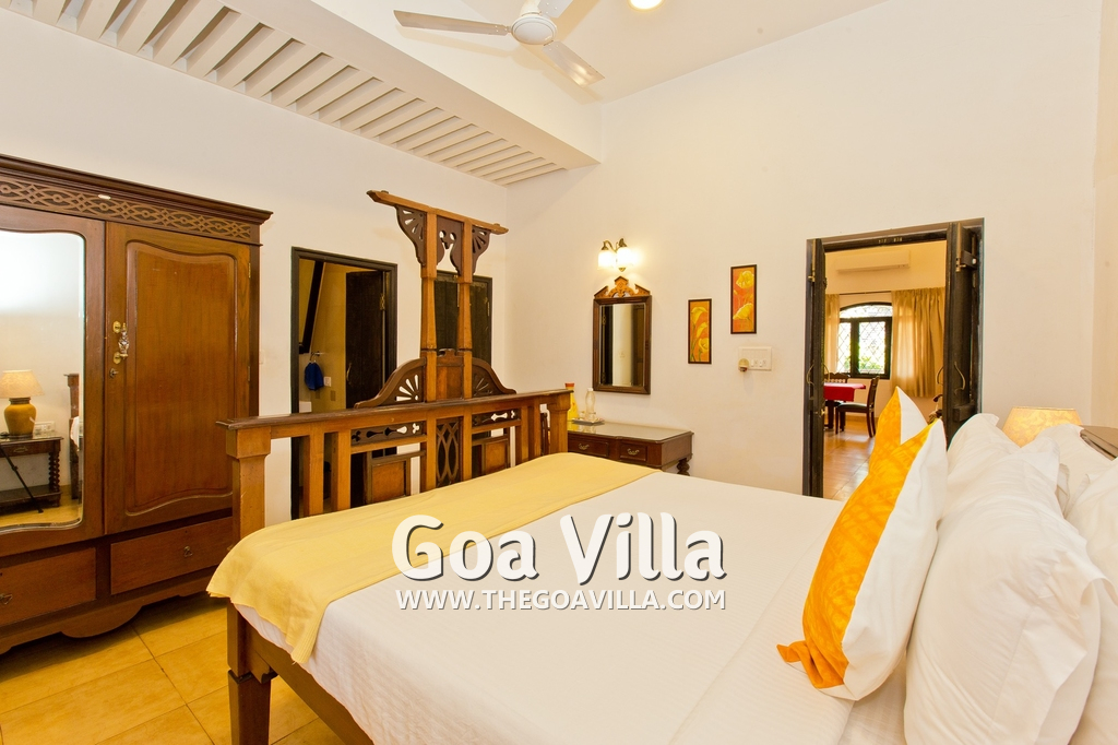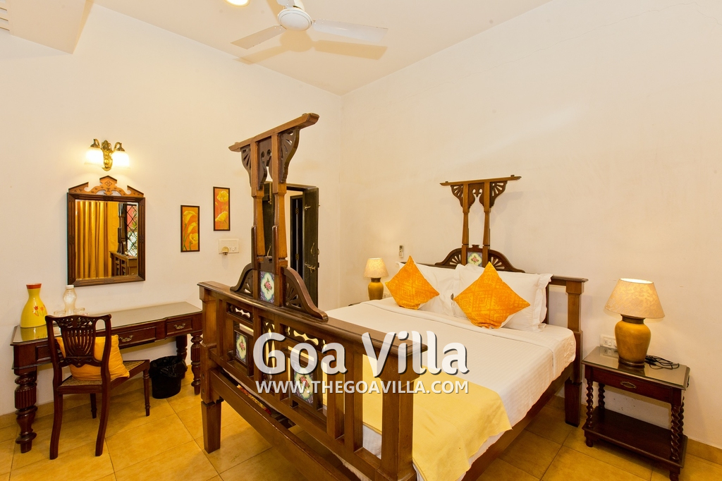 Bedrooms – The villa has 4 bedrooms, all en-suite and air-conditioned. 2 bedrooms are on the ground floor. 1st floor has the master bedroom. The master bedroom is bigger in size and opens to a wide balcony with a comfortable sitting area. They all have unique color themes – bright red, peacock blue, and two shades of yellow. Antique furniture with a large King-size bed, extra cushions, wardrobe, side table, lamp shade, mattress, and paintings on the wall.