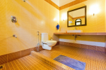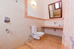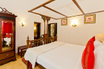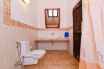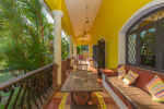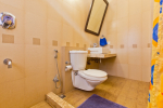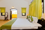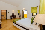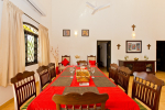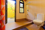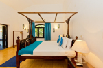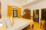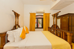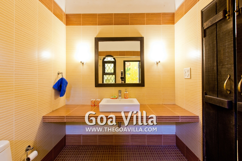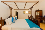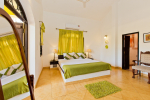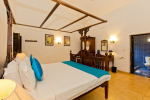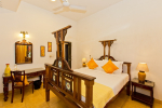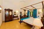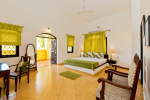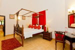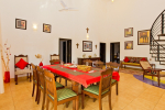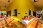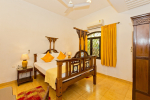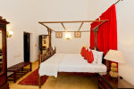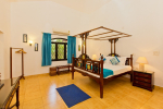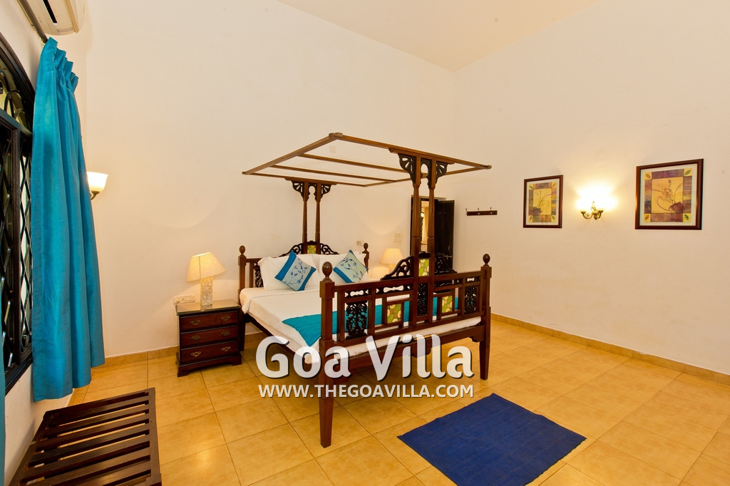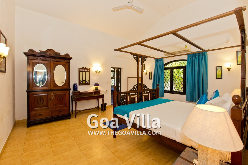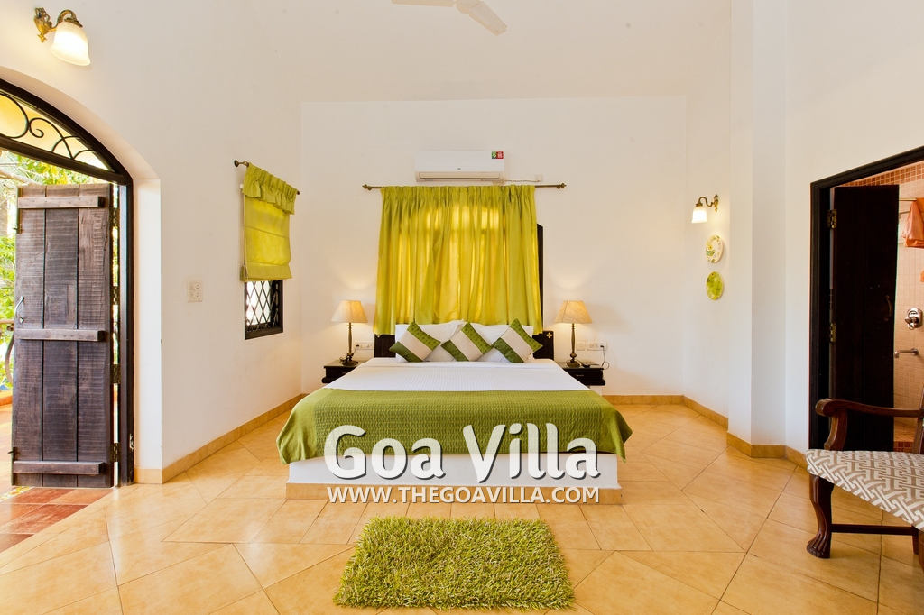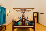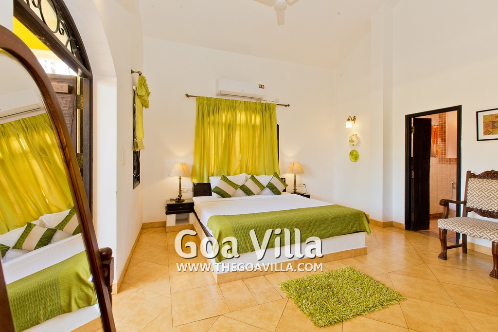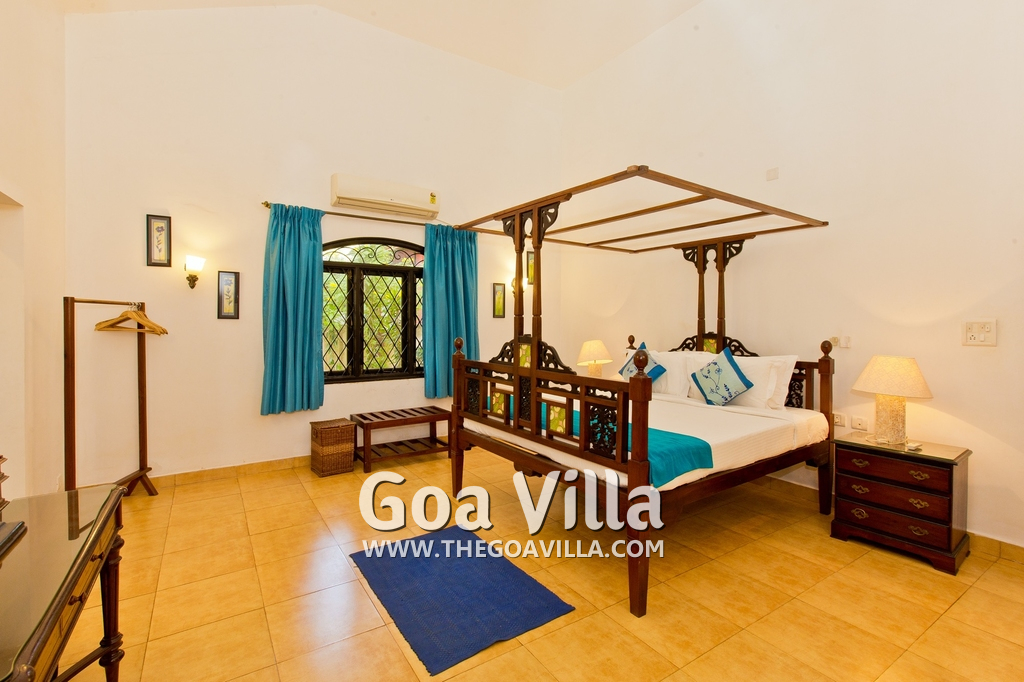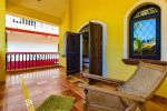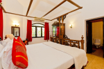 Bedrooms – The villa has 4 bedrooms, all en-suite and air-conditioned. 2 bedrooms are on the ground floor. 1st floor has the master bedroom. The master bedroom is bigger in size and opens to a wide balcony with a comfortable sitting area. They all have unique color themes – bright red, peacock blue, and two shades of yellow. Antique furniture with a large King-size bed, extra cushions, wardrobe, side table, lamp shade, mattress, and paintings on the wall.