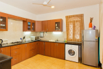 Kitchen, Dining – At one side of the open living/dining space, it is a modern fully-equipped kitchen with a large refrigerator, gas burner, microwave, kettle, water purifier, toaster, and sink. The dining area has a large dining table that seats 8 guests.