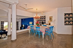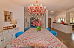 Living Room – Colorful living room with separate dining area. Sofa with center table, television, DVD player, music system, lamp shade, balcony outside.