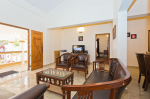 Living Area – Comfortable sofa with extra chairs around a center table. Large flat-screen television with extra speakers over a modern TV unit. There are paintings on the wall. Living area overlooks the swimming pool. This is a good place where guests can socialize in the evening.