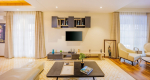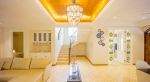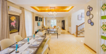 Living Room – You will find plenty of spaces in this holiday villa for rent where you can relax or entertain with your group. The huge living area is welcoming and has offers many comfortable seating options. It has a large sofa area and also several armchairs that can seat everyone. You can watch television if you want. A beautiful chandelier hangs from the ceiling. This section of the house also has a powder room. On the first floor, there is a TV lounge that is surrounded by three bedrooms.