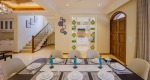 Dining, Kitchen – On entering Villa Harmony, the first thing you will see is the formal dining table to your left. It provides seating for 8 guests. The kitchen is to your left. It has a refrigerator, freezer, oven, kettle, toaster, washing machine, and other appliances. Tableware and glassware are provided.