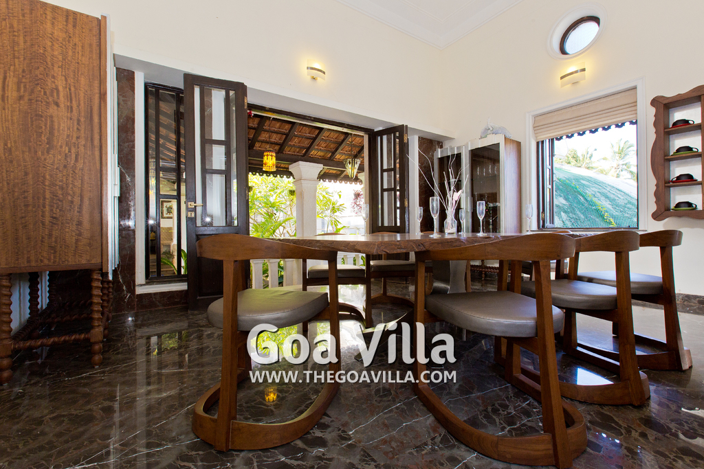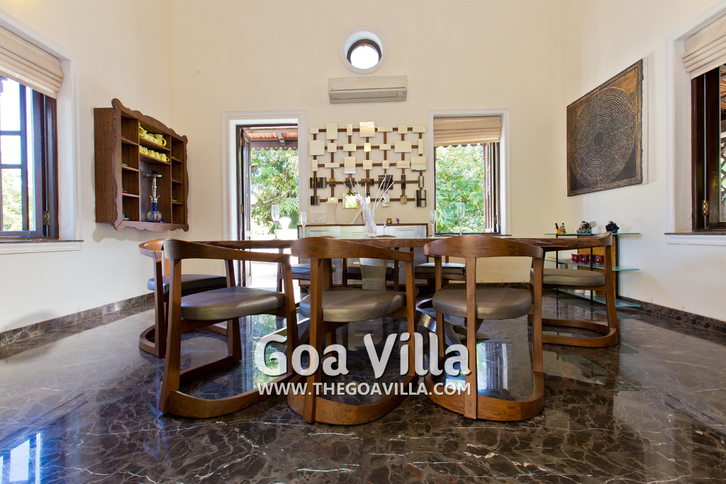The dining room seats eight and is air-conditioned with exquisite decor and furniture. The room leads out to an open terrace with facilities for a barbecue.