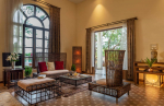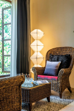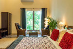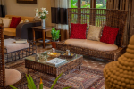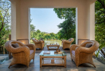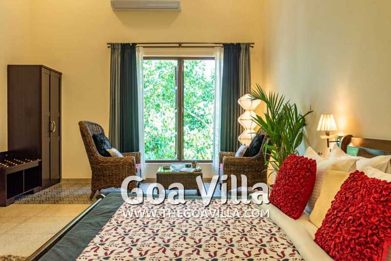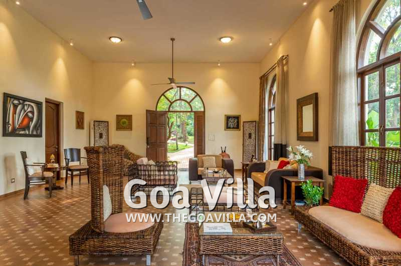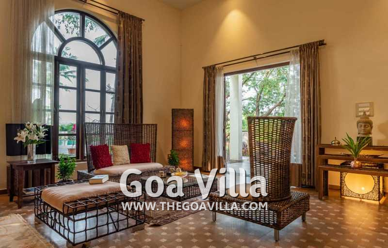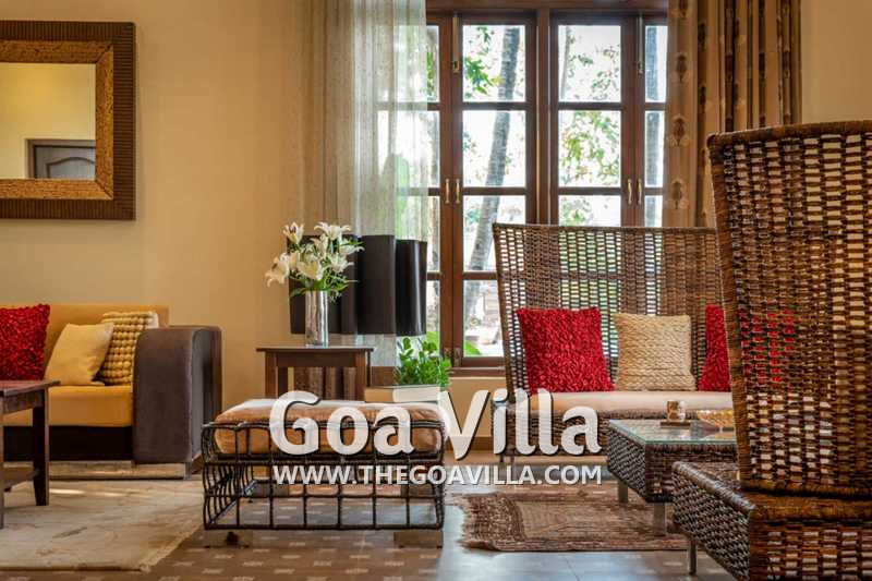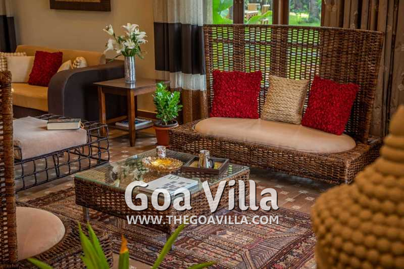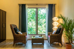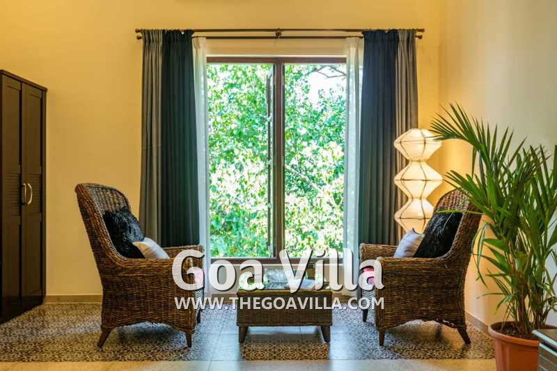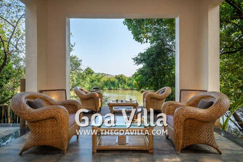 Living Room – The ground-floor living room is super comfortable. It is a large space with cane sofas, armchairs, and coffee tables. There are two different sofa arrangements, which means that the entire group can relax here, spend quality time together, and plan what to see and do in Goa. The room has two doors. The first takes you into the space from the parking area and the second to an outdoor lounging area next to the river.
