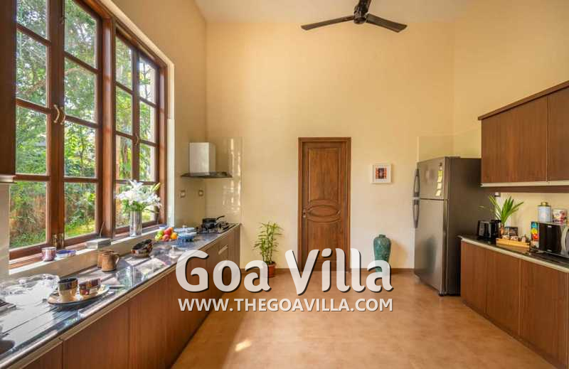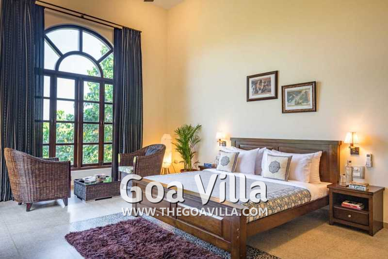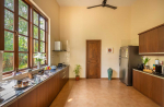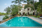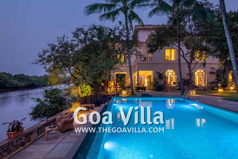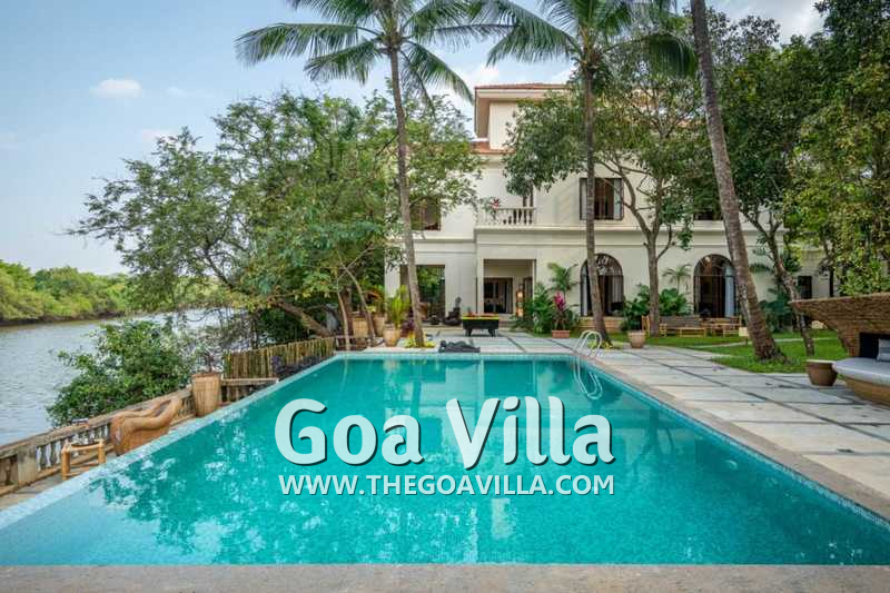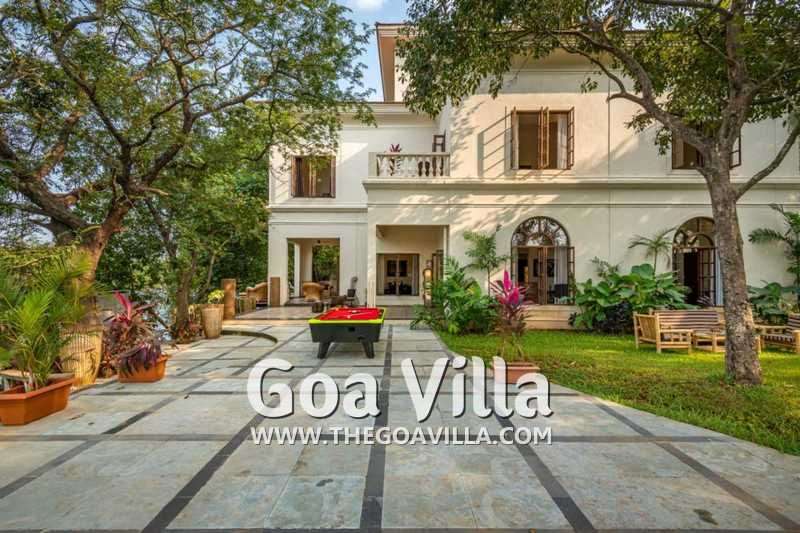 Aptly named “The Mansion”, this is a massive 8-bedroom luxury villa for rent in North Goa. Everything is super large and super comfortable here, from the living room to the kitchen, bathrooms, and the 8 huge bedrooms that can easily sleep up to 16 guests. The villa is spread over a massive private estate overlooking the Nerul River. Its best feature is the riverside lounging and relaxing area. It features a private pool, a pool table, and a beautiful lawn with many tall trees providing natural shade. Relax by the riverside and enjoy the soothing breeze and stunning nature views. Inside, you will have every modern amenity that you get in 5-star resorts.