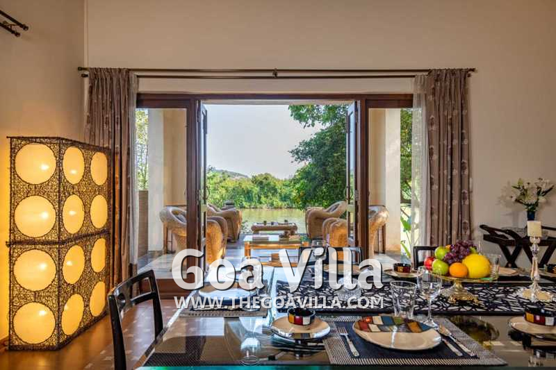 Swimming Pool – The infinity swimming pool is a star attraction of this North Goa rental home. It occupies a large space on the riverfront. There is a beautiful seating area between the pool and the river for you to relax and enjoy the views. On the other side, you will find a lush lawn with plenty of tall trees. The garden has a sofa area for your outdoor lounging. A few steps away, also on the riverfront, you will find a shaded area with a second outdoor lounging space. There is also a pool table for your gaming pleasure on the poolside.
