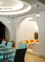 Living Room – In this luxury villa for rent, you will find two living rooms, one on each floor. The ground-floor lounging space is just after you enter the main house. It is open on one side and has a large sofa area. The first floor living room is huge. It is an L-shaped room with cushy armchairs, sofas in vibrant colors, high-quality carpets, a huge television, and coffee tables. One entire wall has a ceiling-to-floor glass, which provides gorgeous views of the outside. There is also a fabulous balcony that serves as the third lounging space. It has many seating areas.