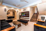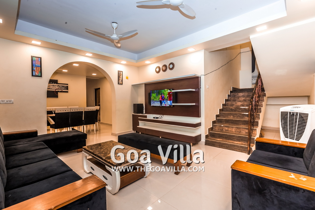 Living Area – Large living area with a comfortable sofa and extra sitting around a central table. There is a wall-mounted television and a TV unit. Staircase leads to the 1st floor. Paintings on the wall. There is a cooler in this room. Music system.
